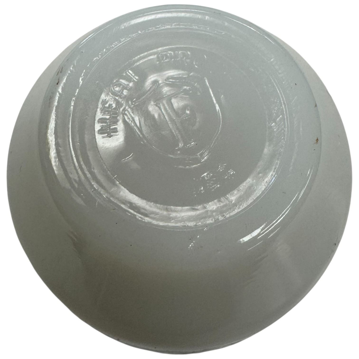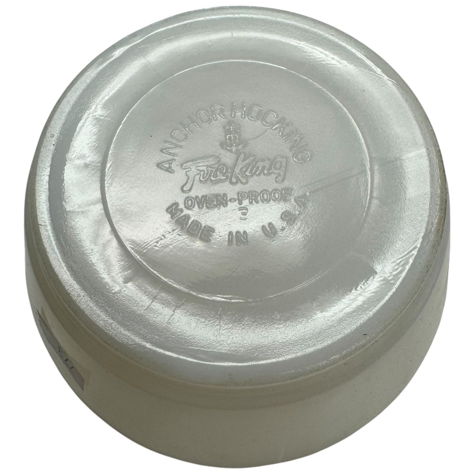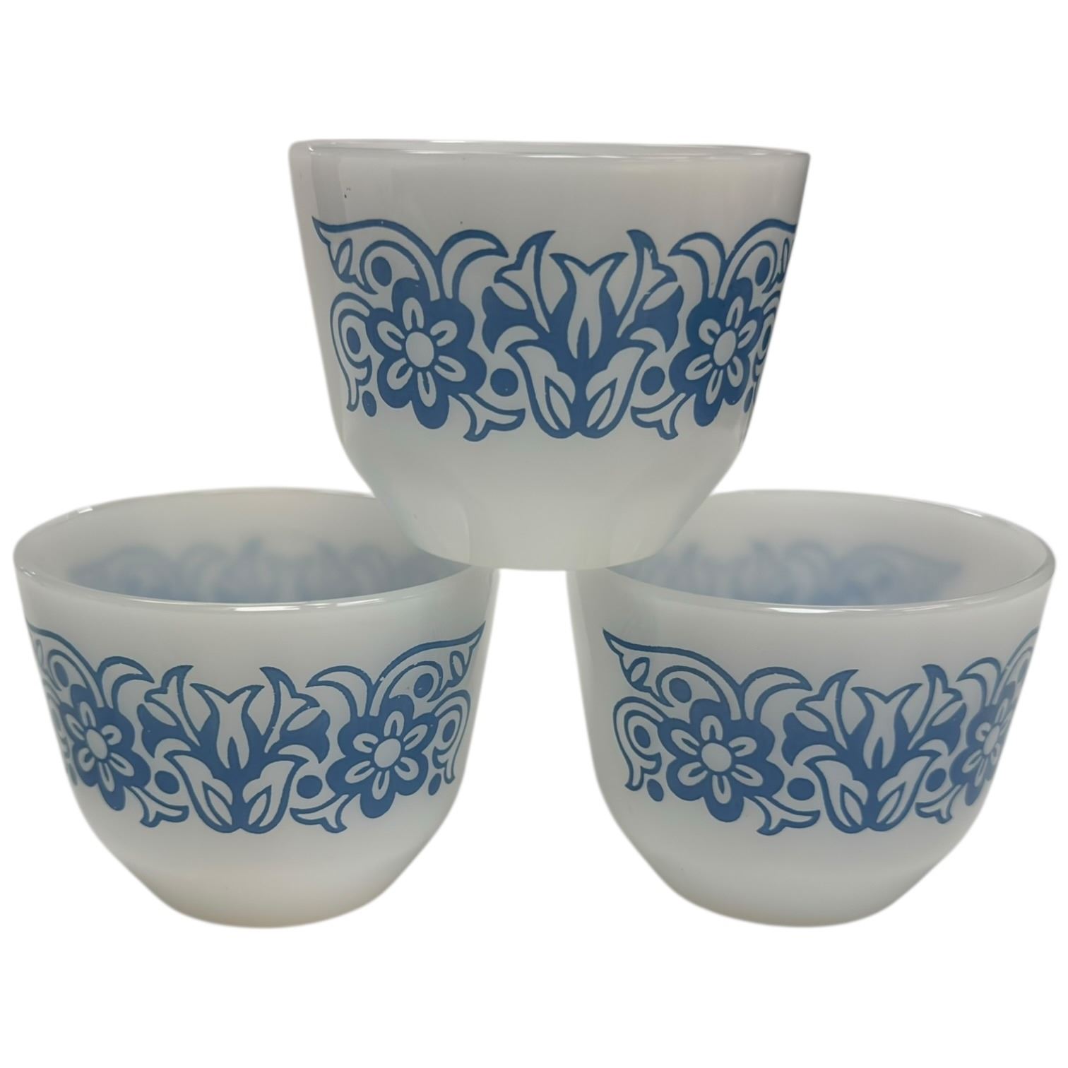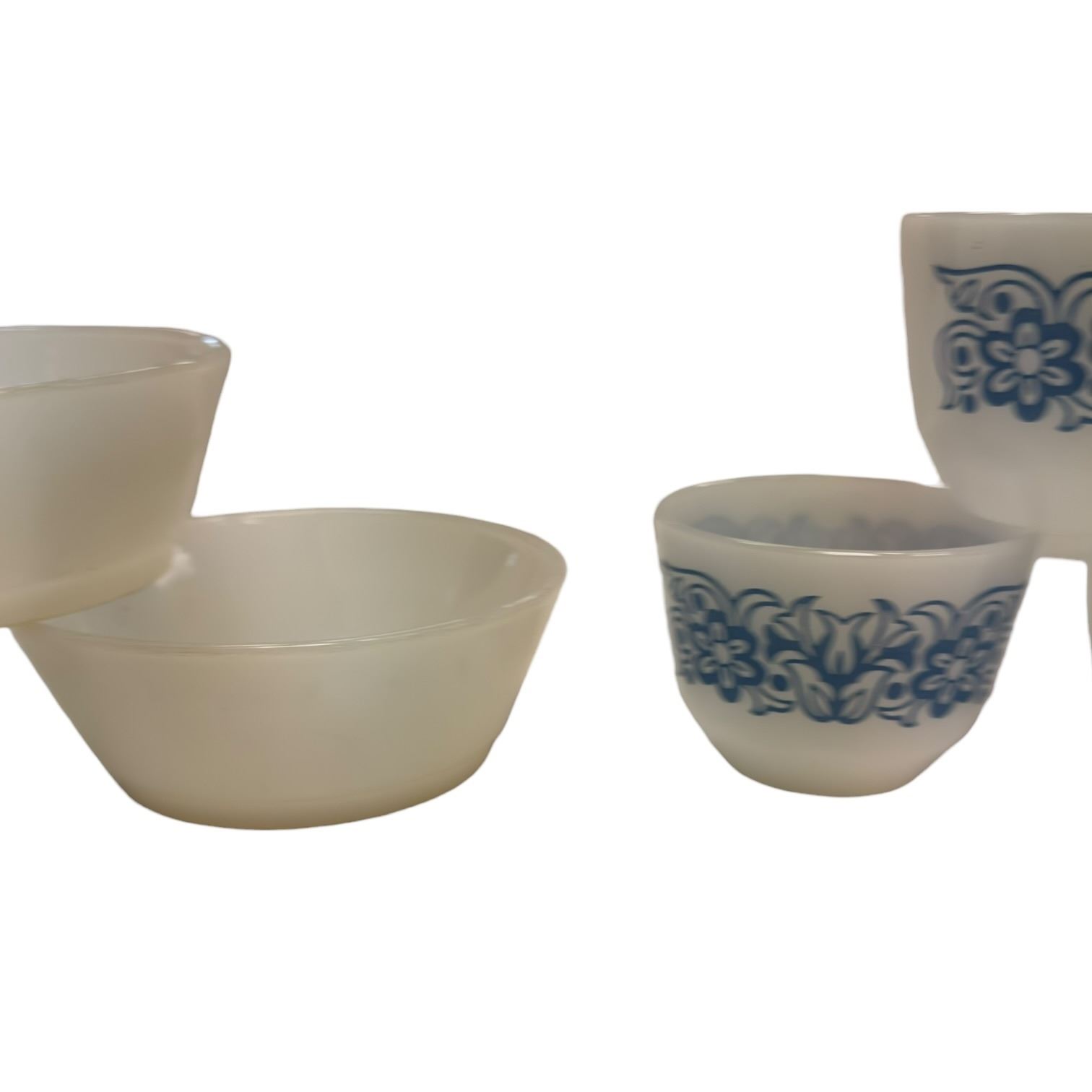 Lot includes 3 vintage Federal Glass custard cups or sherbet bowls in white milk glass with blue floral tulip & scroll pattern, likely from the 1950s-1960s. Also included are 3 small white bowls by Anchor Hocking Fire King. Items are as pictured. No chips.