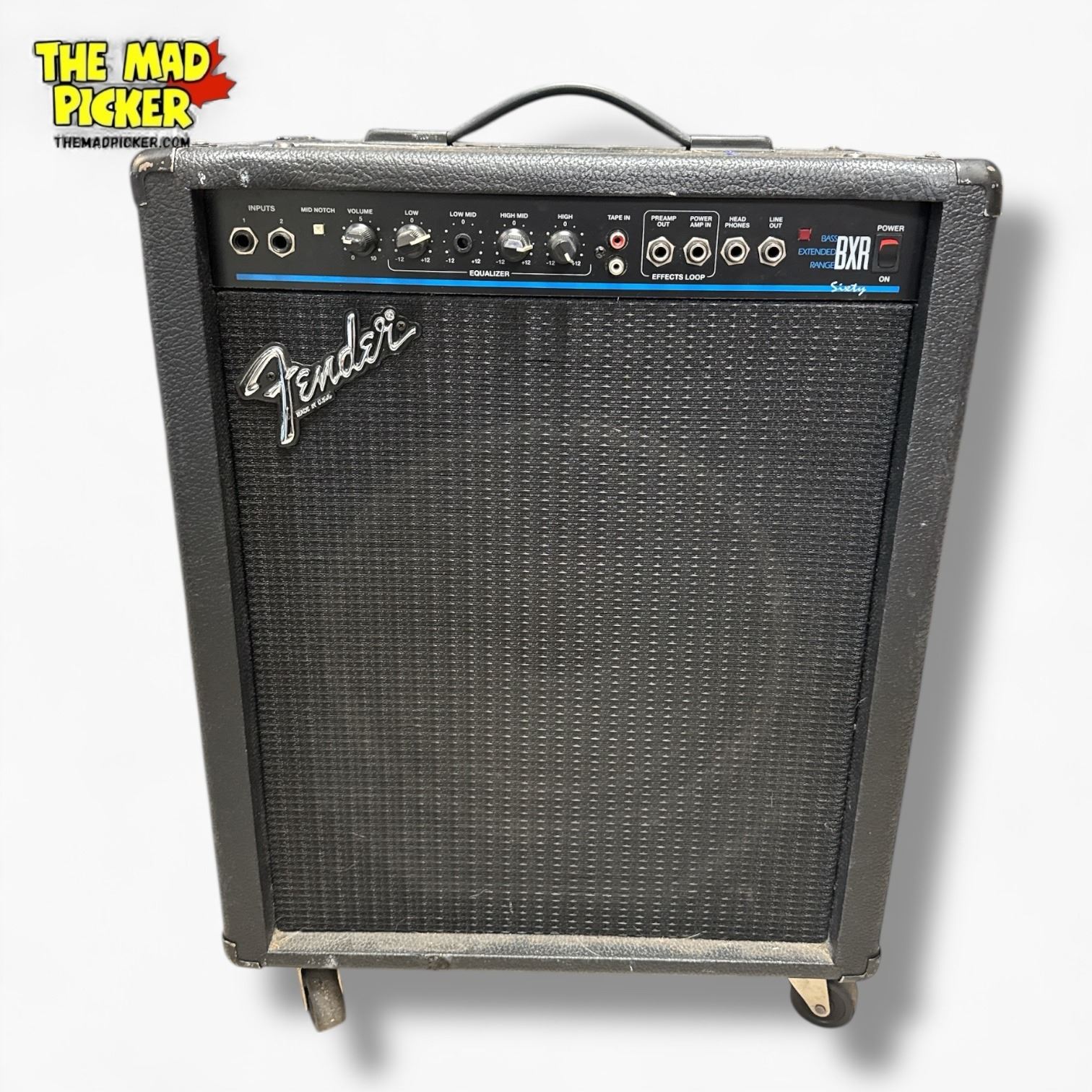 Fender BXR Sixty bass amplifier, 60-watt, 1x12 combo amp produced in the 1990s. Features dual inputs, a 4-band EQ, adjustable compressor, contour control, and headphone jack. Designed for bass guitars, made in the USA. Compact and portable with a solid-state design for reliable performance.