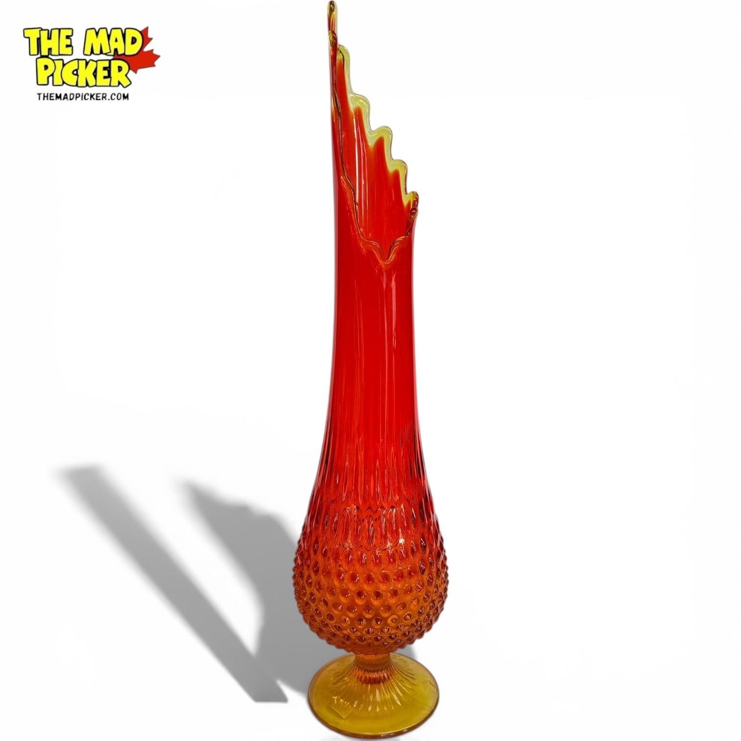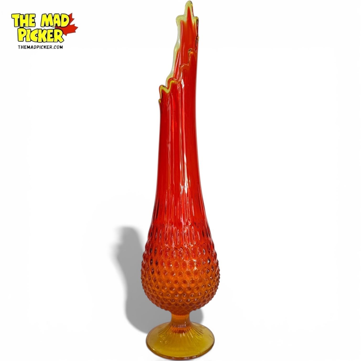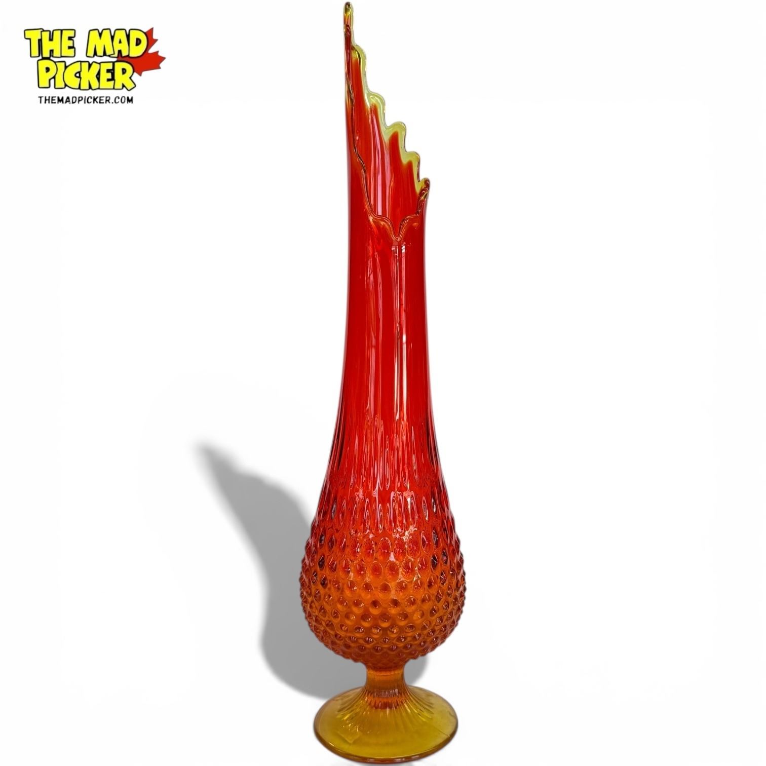 Vintage Fenton Art Glass vase in Amberina, a gradient from amber at the base to deep red at the top. Features a swung-stretch design with a bulbous, hobnail-textured base and tall, fluted neck. Measures 20.5 inches tall. Produced during the mid-century modern era, 1960s-1970s.