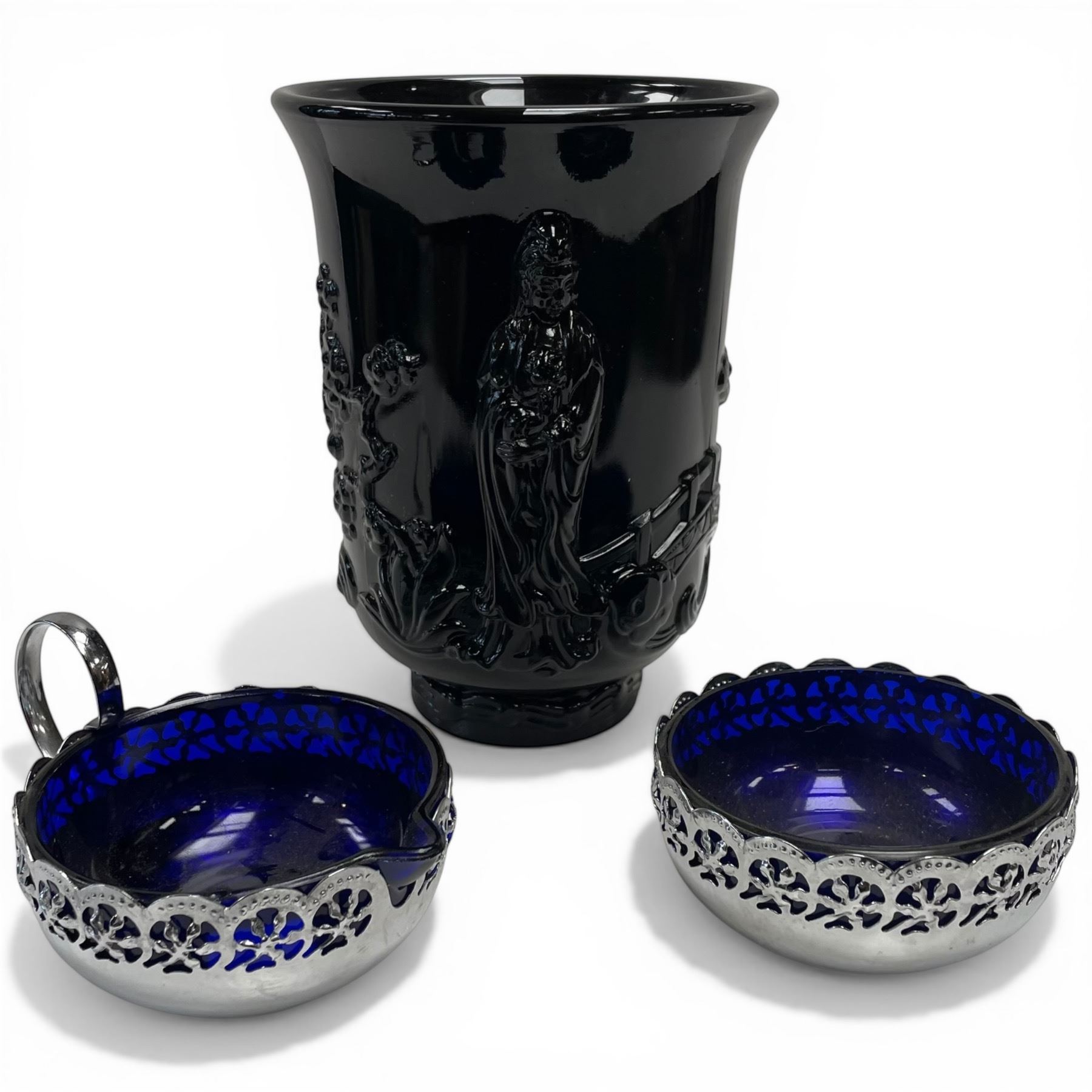 Fenton Black Amethyst Asian Ying Yang Vase and Cream & Sugar by Celtic Plate W Cobalt Blue Glass