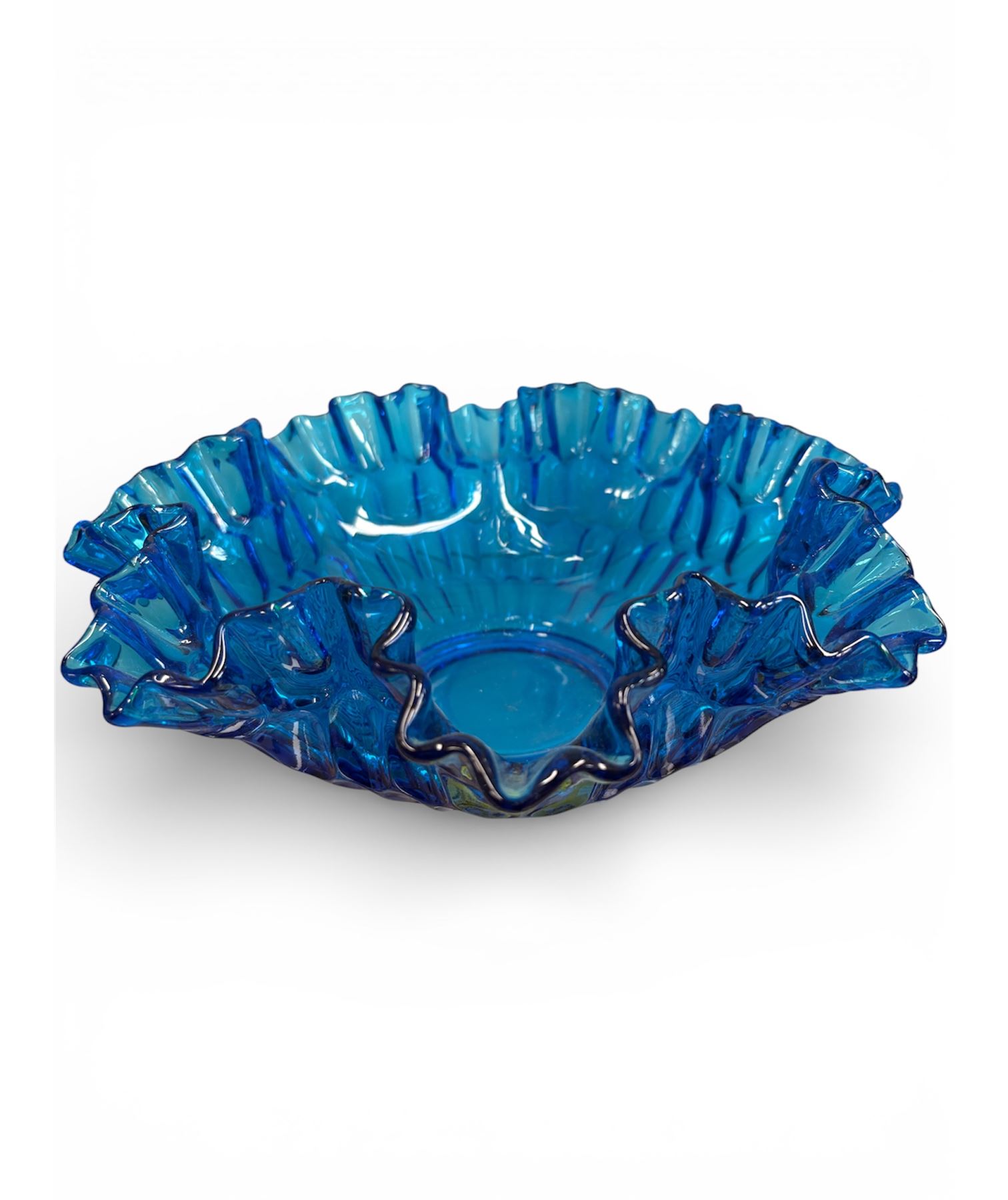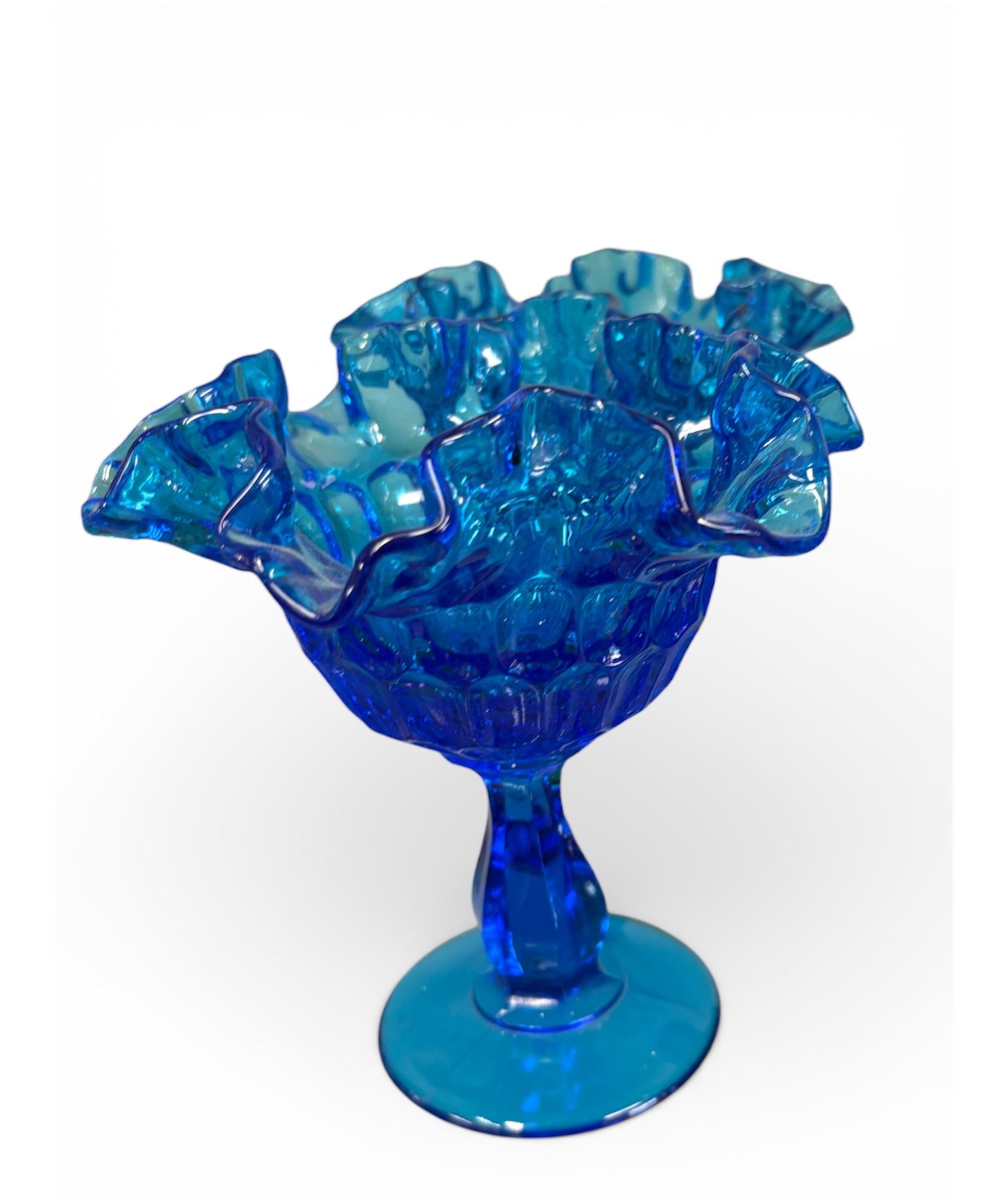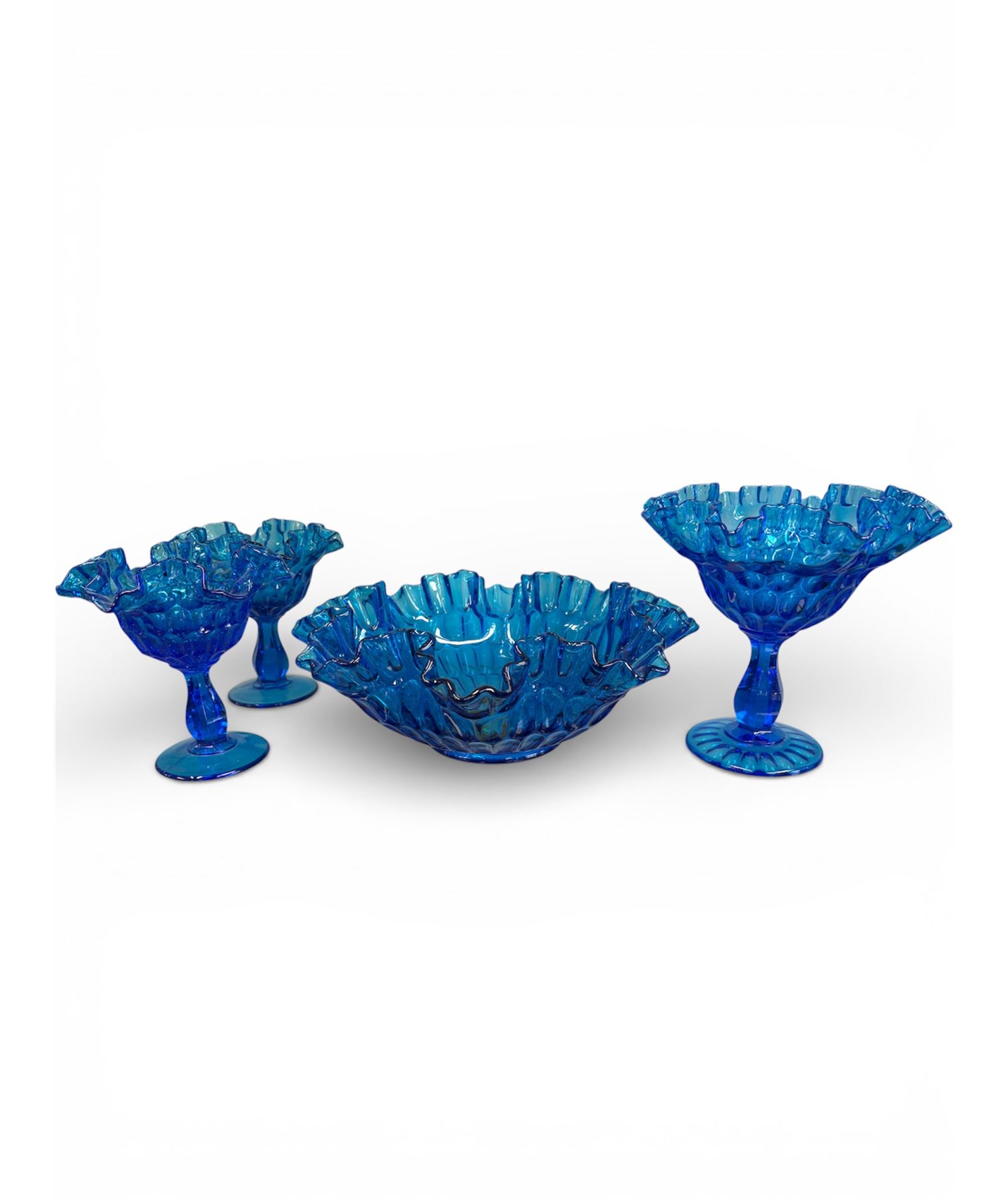 Set of four vintage Fenton glass pieces in Colonial Blue, produced between 1963 and 1970. Features ruffled edges and thumbprint pattern, with items potentially including pedestal compotes, candy dishes, or swung vases. Known for distinctive Victorian-inspired pressed glass design in true colored glass.