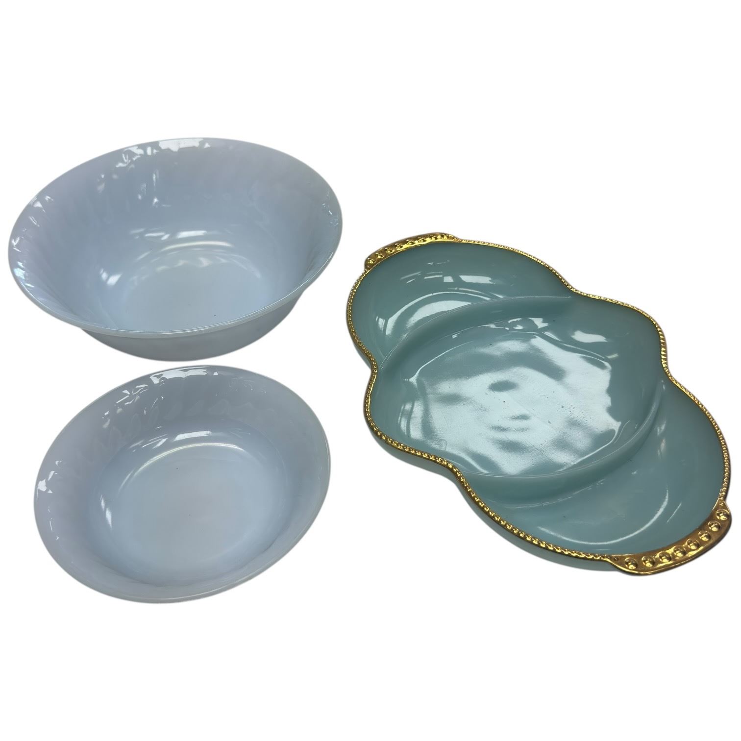Lot includes Fire King Blue Delphite pieces featuring two bowls with 8-Inch and 6-Inch diameters, and a divided relish dish. All items have a beaded rim accented with 22K gold. Blue Delphite glass from Anchor Hocking known for its opaque blue color. Item is as pictured. No chips