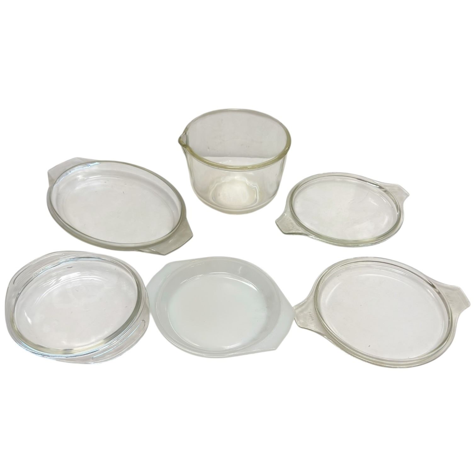 This lot includes a Fire King Sunbeam mixing bowl and assorted glass lids: JAJ, Arcopal, and three Pyrex lids.. The lids are from various glassware lines suitable for replacement or pairing. Item is as pictured. No Chips