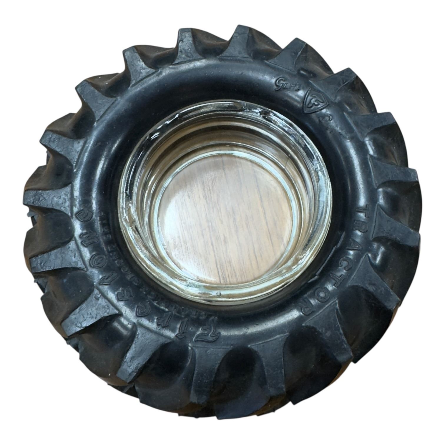 Vintage Firestone promotional ashtray featuring a tractor tire made of rubber with a glass insert. Commonly produced mid-20th century for advertising purposes. Outer tire mimics the tread pattern of a tractor tire. Item is as pictured.