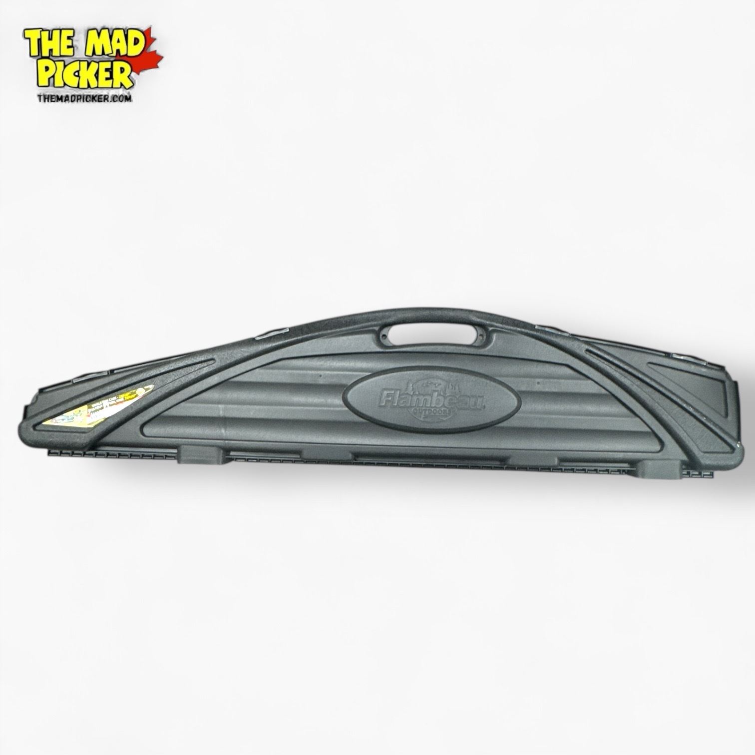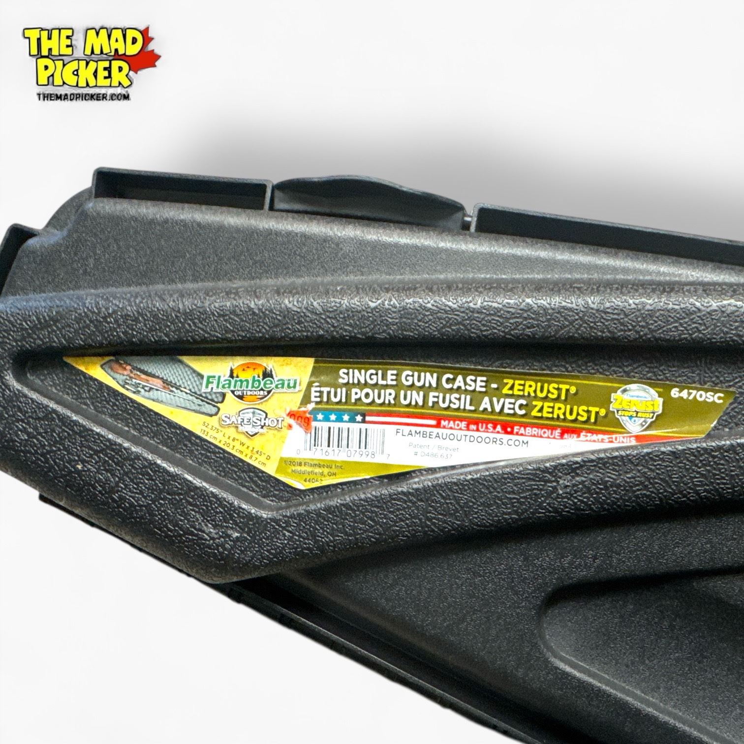 Flambeau Outdoors Safe Shot Single Gun Case featuring ZERUST anti-corrosion technology. Interior dimensions: 52.375 inches long x 8 inches wide x 3.45 inches deep. Durable construction with egg-crate foam for firearm protection. Designed for single gun storage and transport. Black finish.