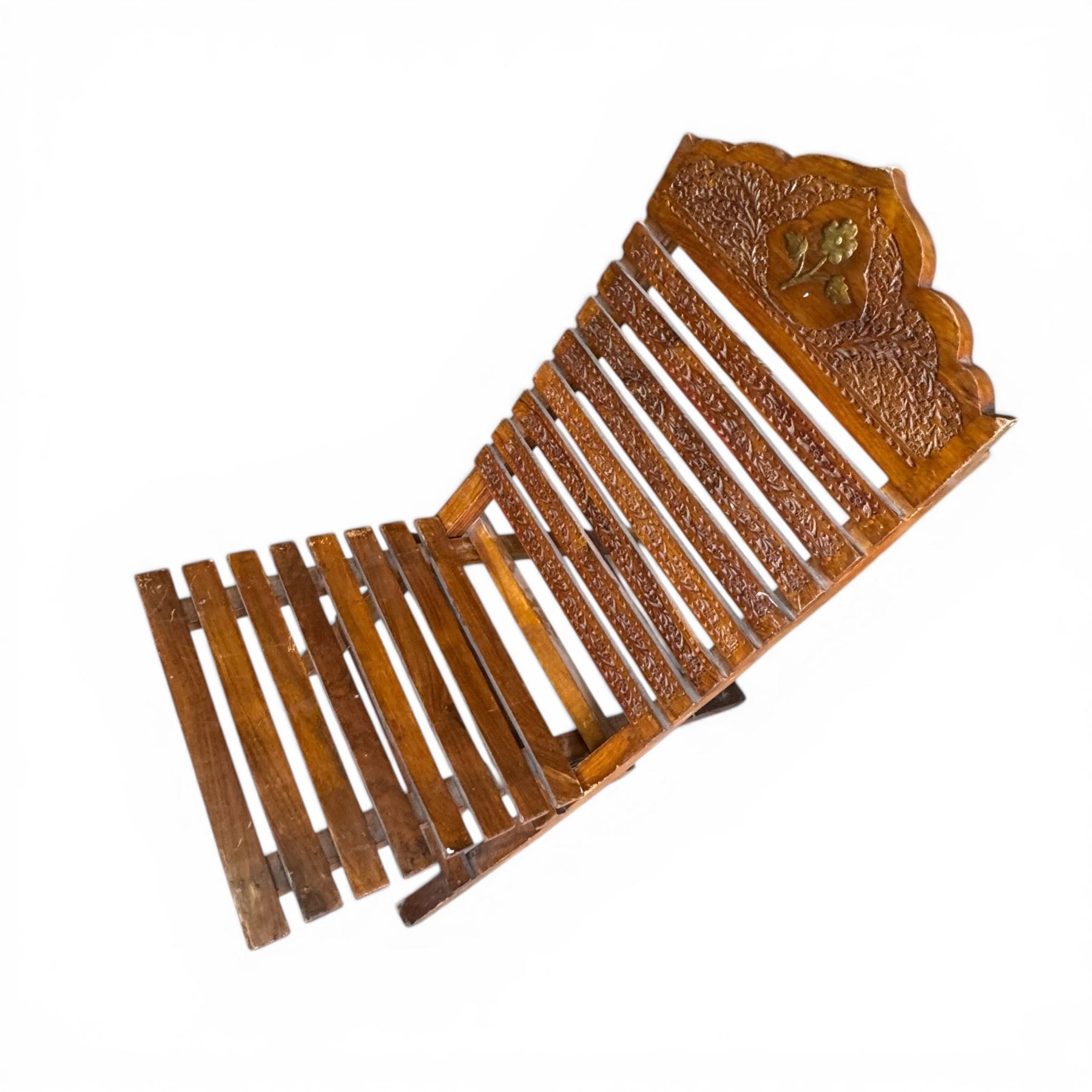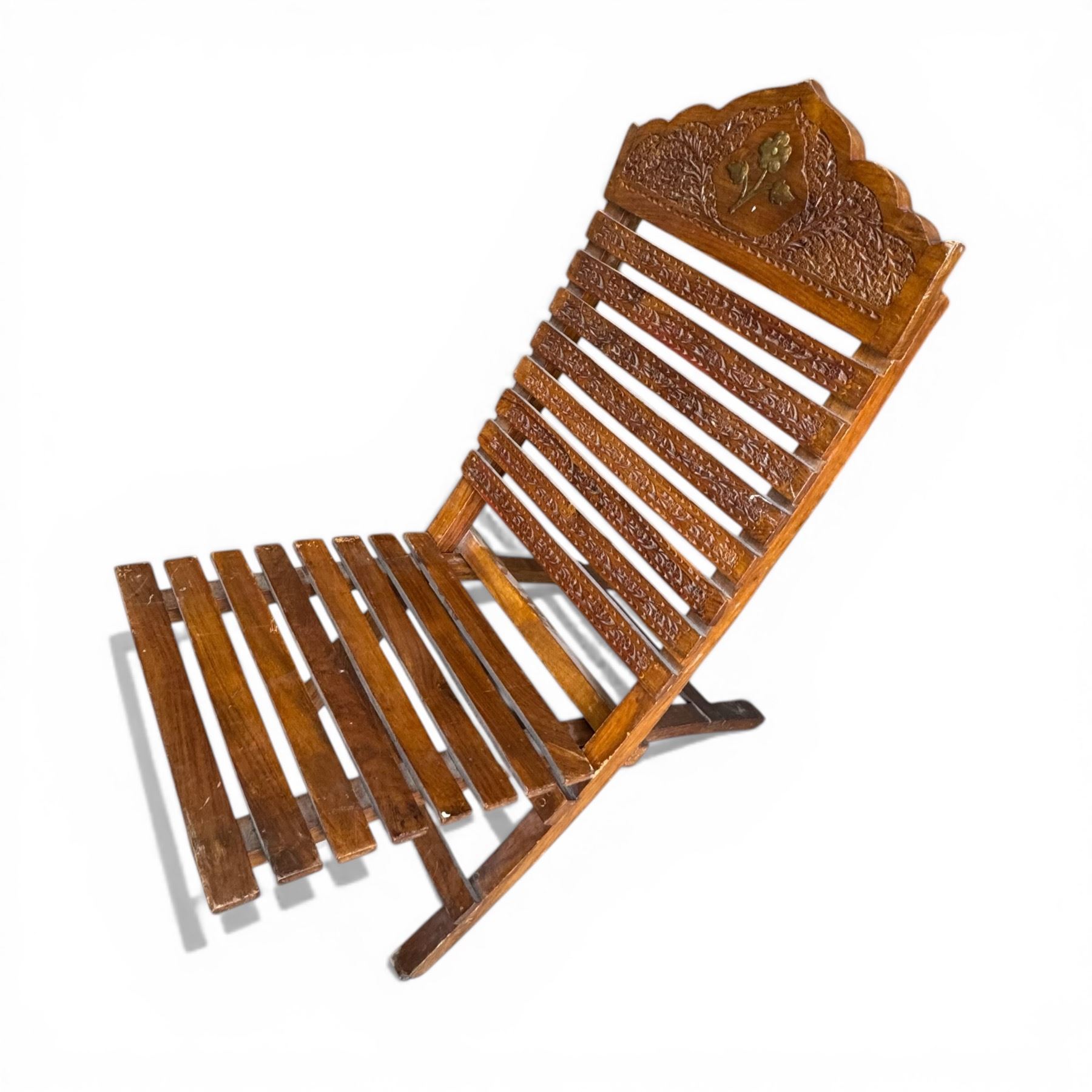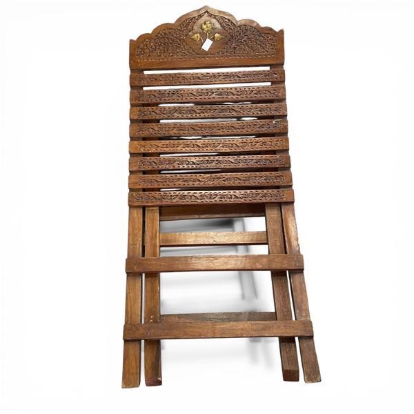 Folding Wood Chair with Carved Details and Applied Brass Flower
