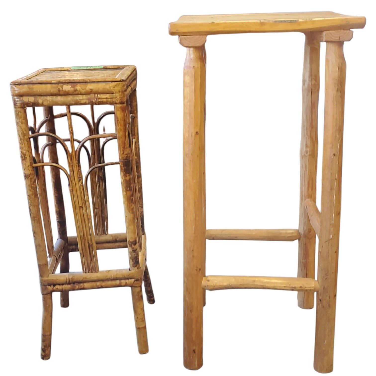 Two items in folk art style. Includes a log construction hall table measuring 15x15x32-Inch and a burnt bamboo plant stand measuring 10.5x10.5x29-Inch. Both items feature rustic craftsmanship and distinctive natural materials. Item is as pictured.