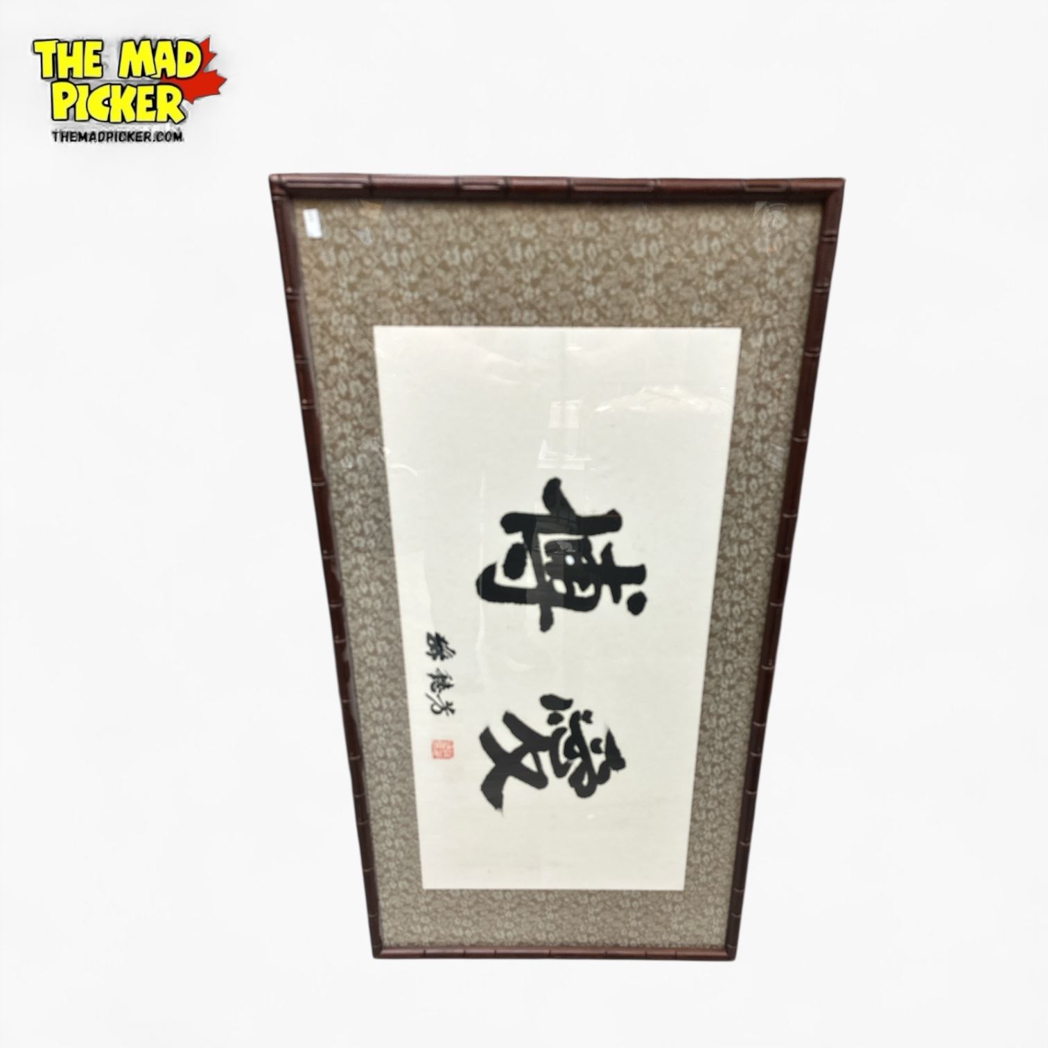 Framed Chinese calligraphy scroll measuring 19x35 inches. Features characters symbolizing 'Fate/Luck/Chance' and 'Love,' often associated with love stories. Includes side text referencing the proverb 'Fate Which Brings People Together from Thousands of Miles Away.'