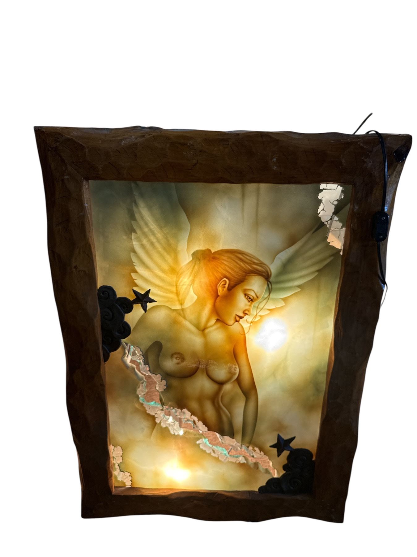 Framed Illuminated Fantasy Angel Artwork in Carved Wood Frame (Tested - Working)