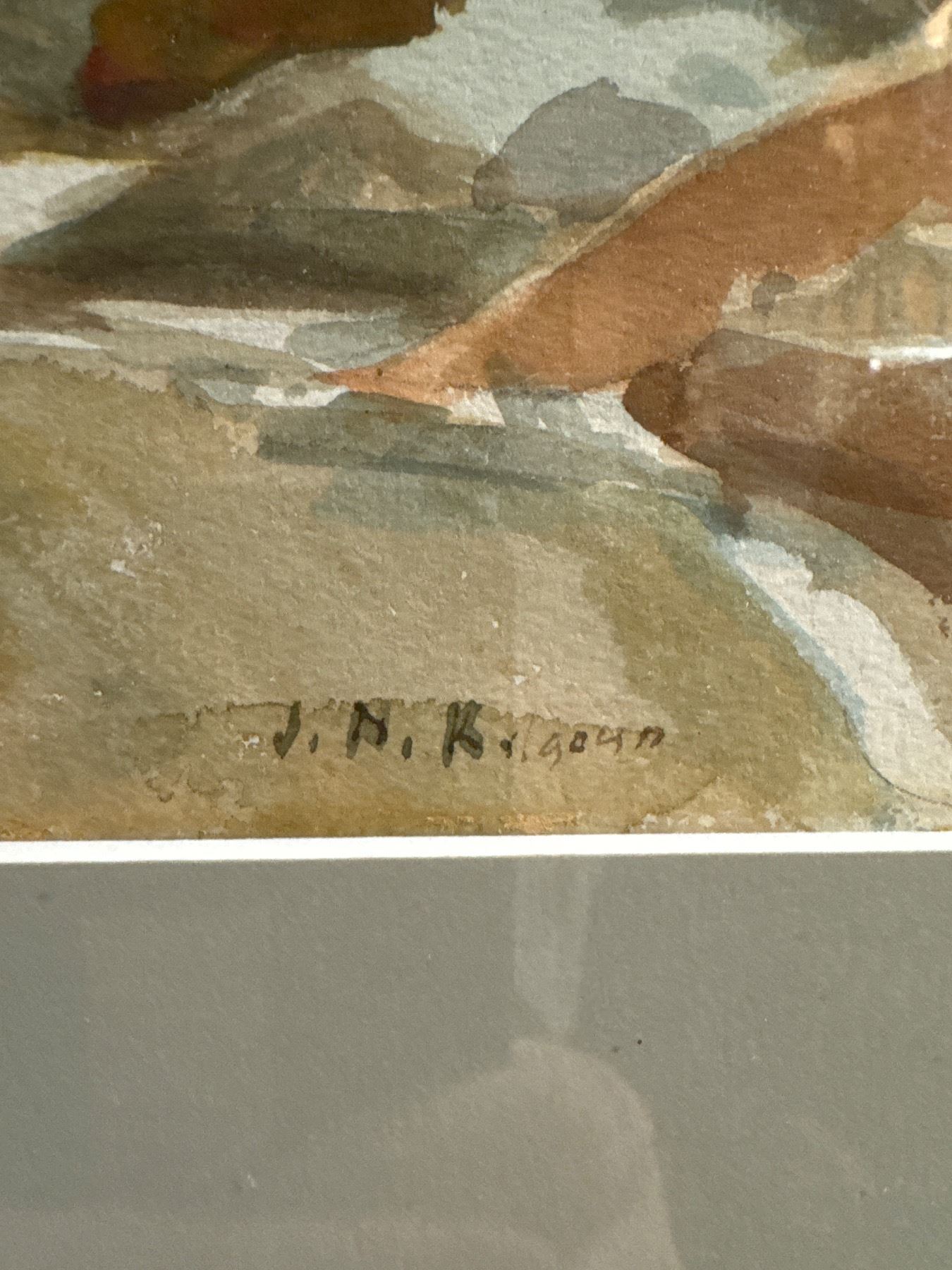 Framed landscape painting signed by J. N. Krigoun in watercolour medium. Measures 20.5-Inch in length and 17.75-Inch in width. Item is as pictured. Likely created by Australian artist Jack John Noel Kilgour (1900-1987), known for serene rural landscapes and atmospheric tonal transitions. Active 1930s-1970s.