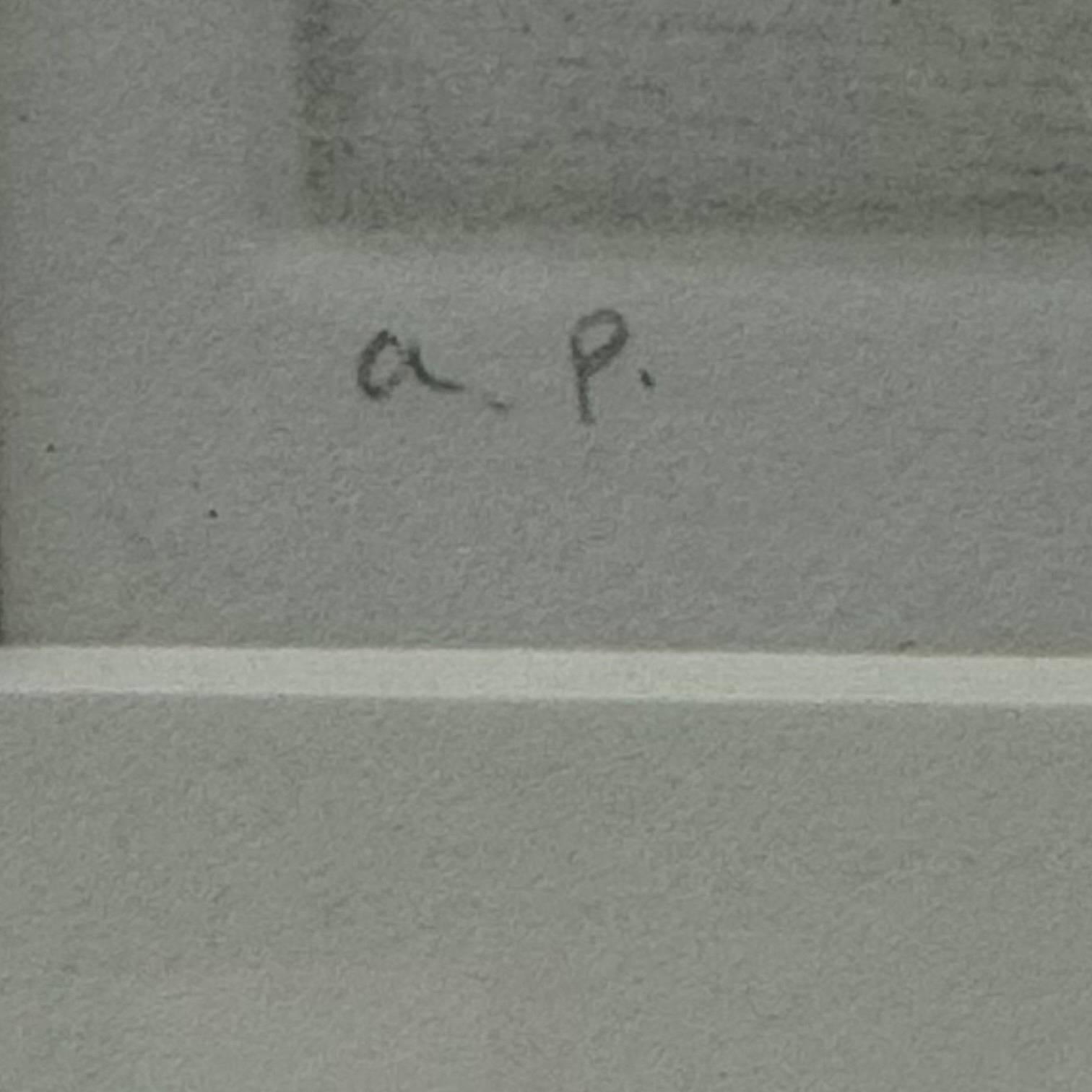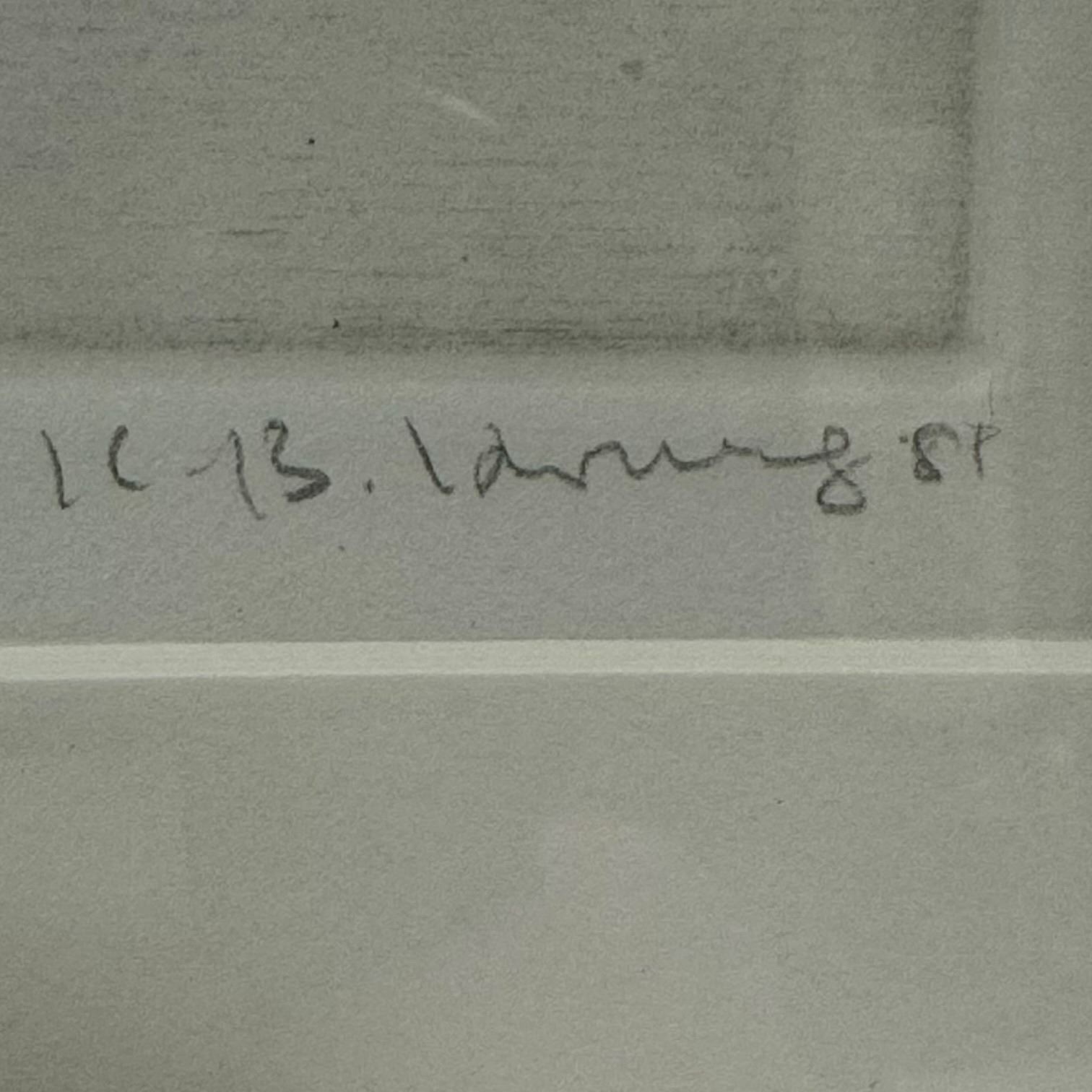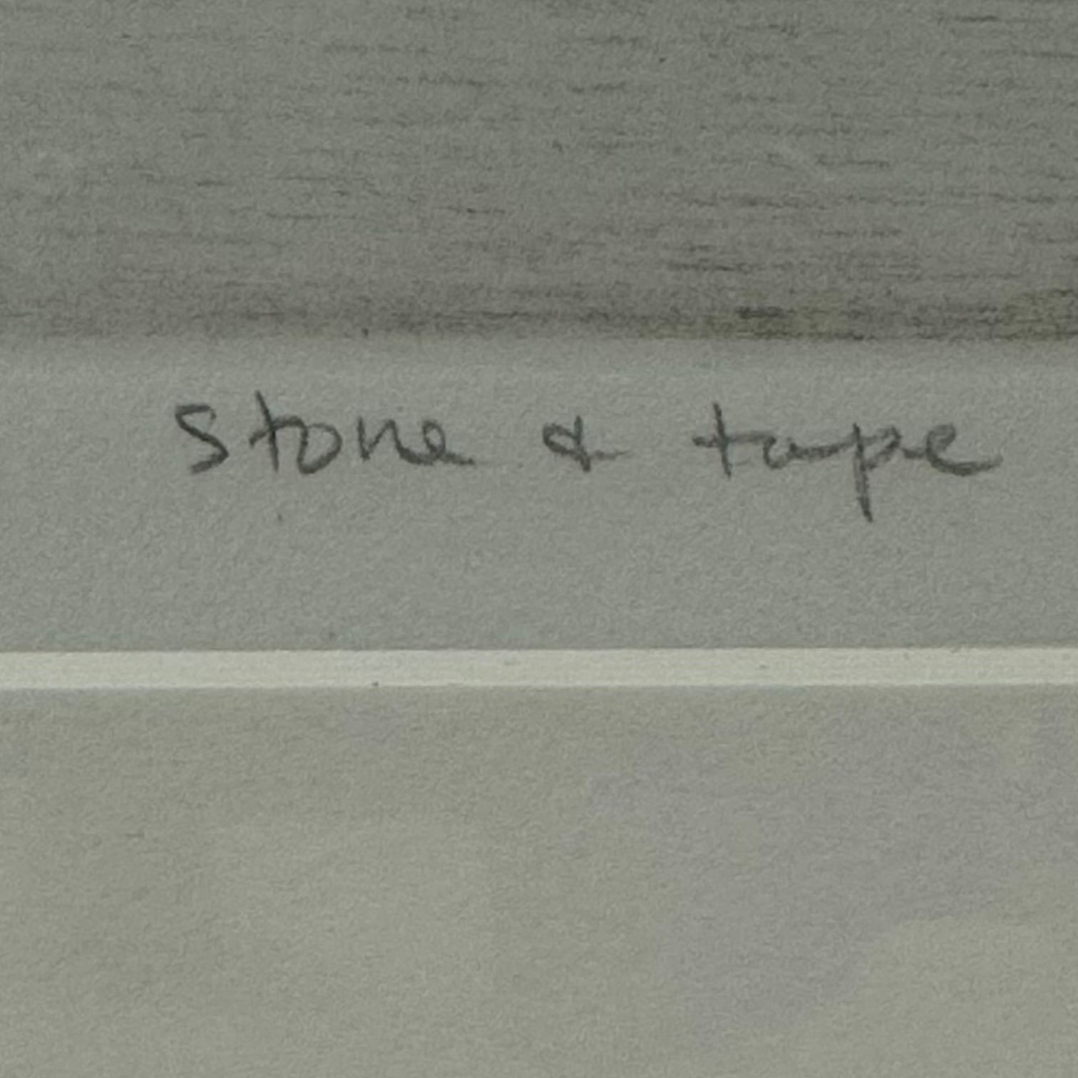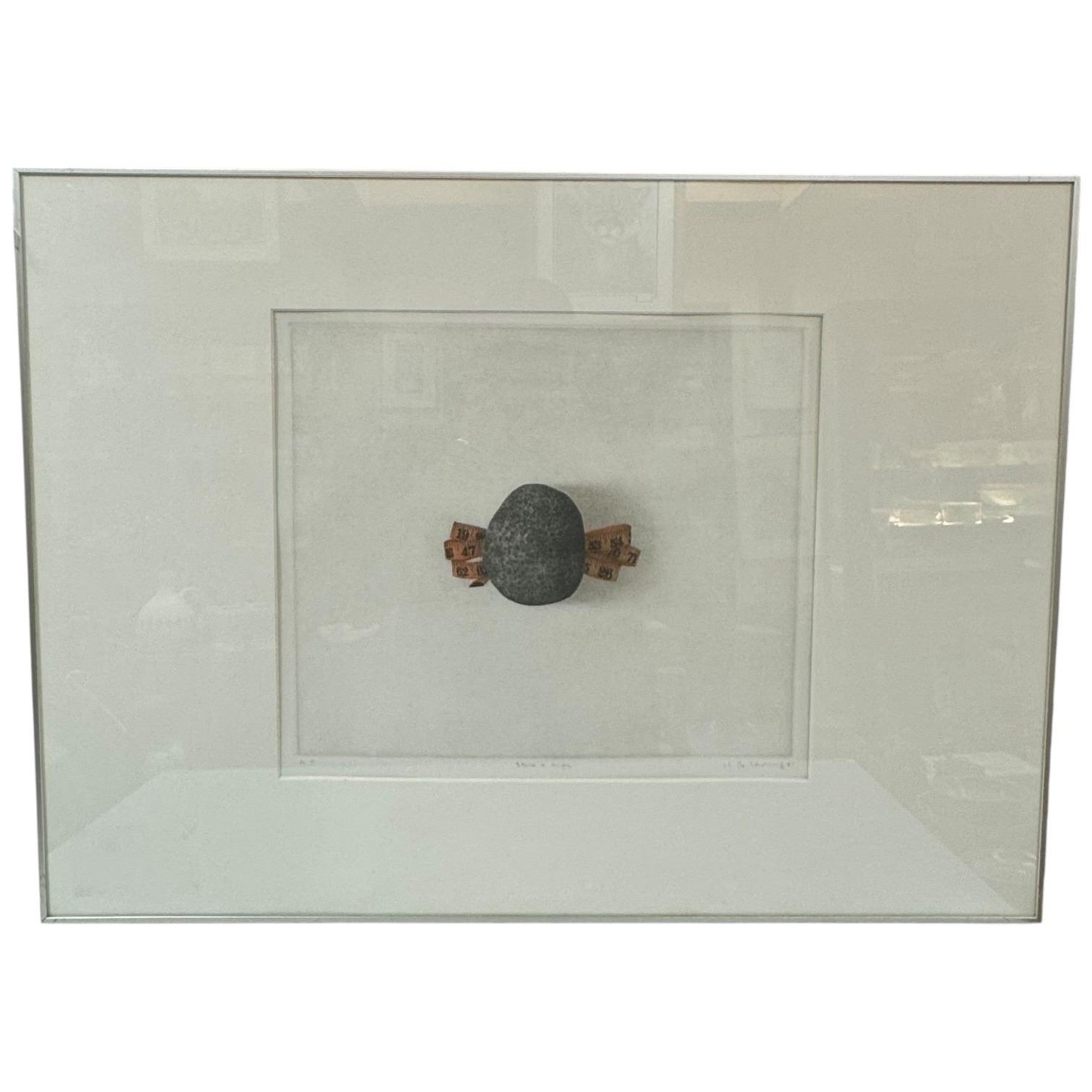 'Stone and Tape' framed print signed LEP and dated 1982. Dimensions are Length: 28-Inch and Height: 20.5-Inch. Includes a detailed frame showcasing the artwork. Item is as pictured.
