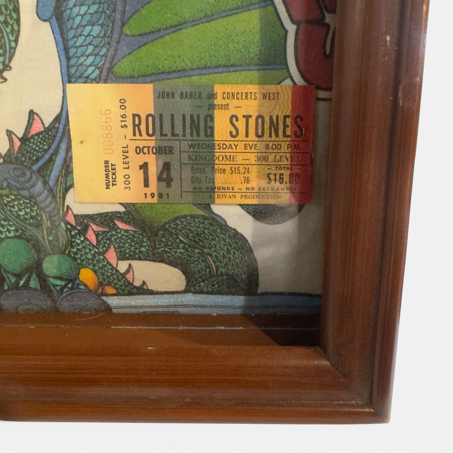 Framed Rolling Stones concert T-shirt from the Oct 15 1981 Dragon Tour. Includes authentic concert ticket from the same date. Item commemorates the band's 1981 tour known for promoting 'Tattoo You' album. Frame showcases T-shirt and ticket together. Item is as pictured.