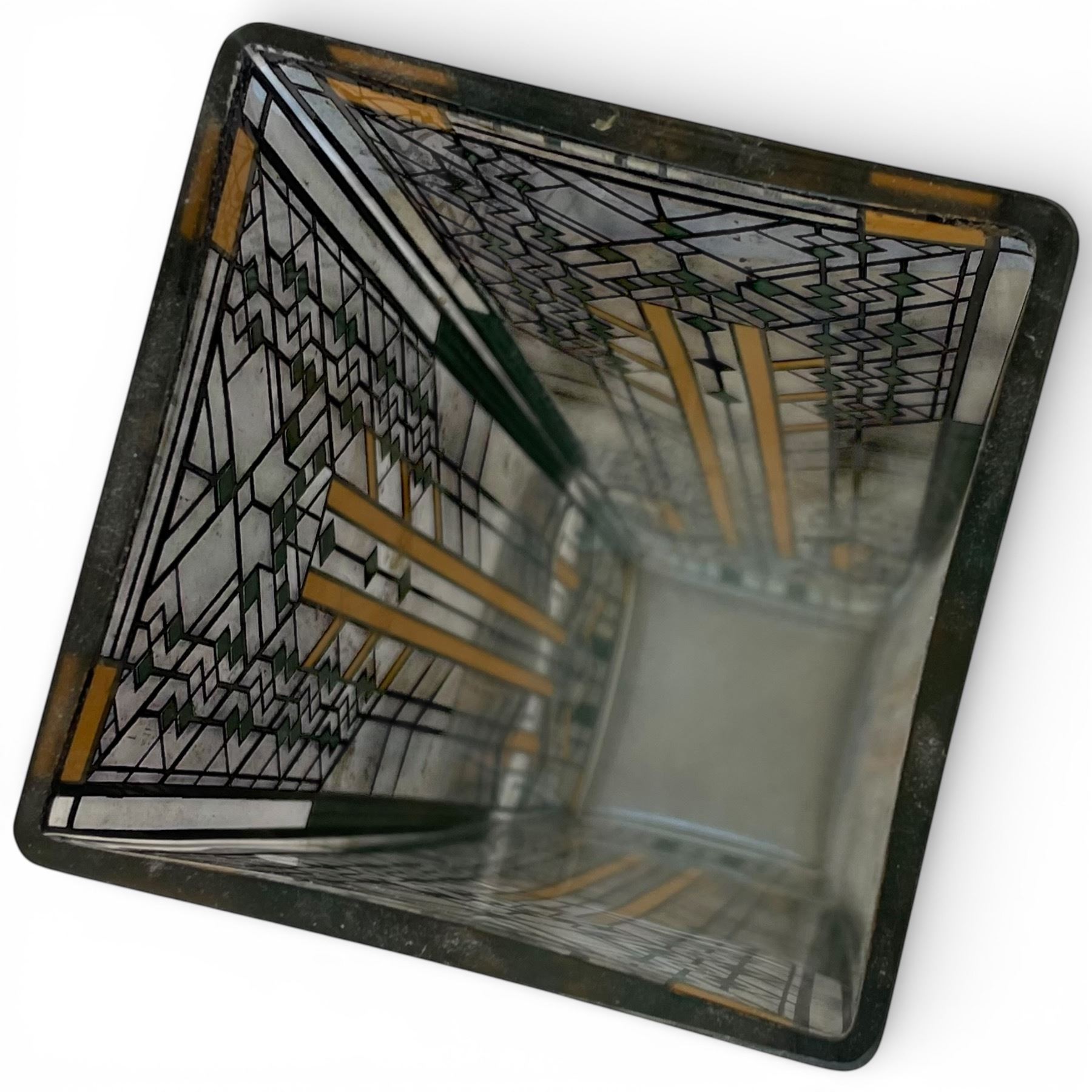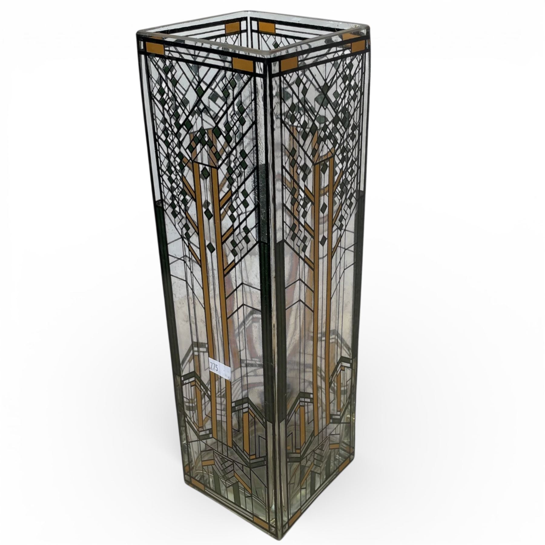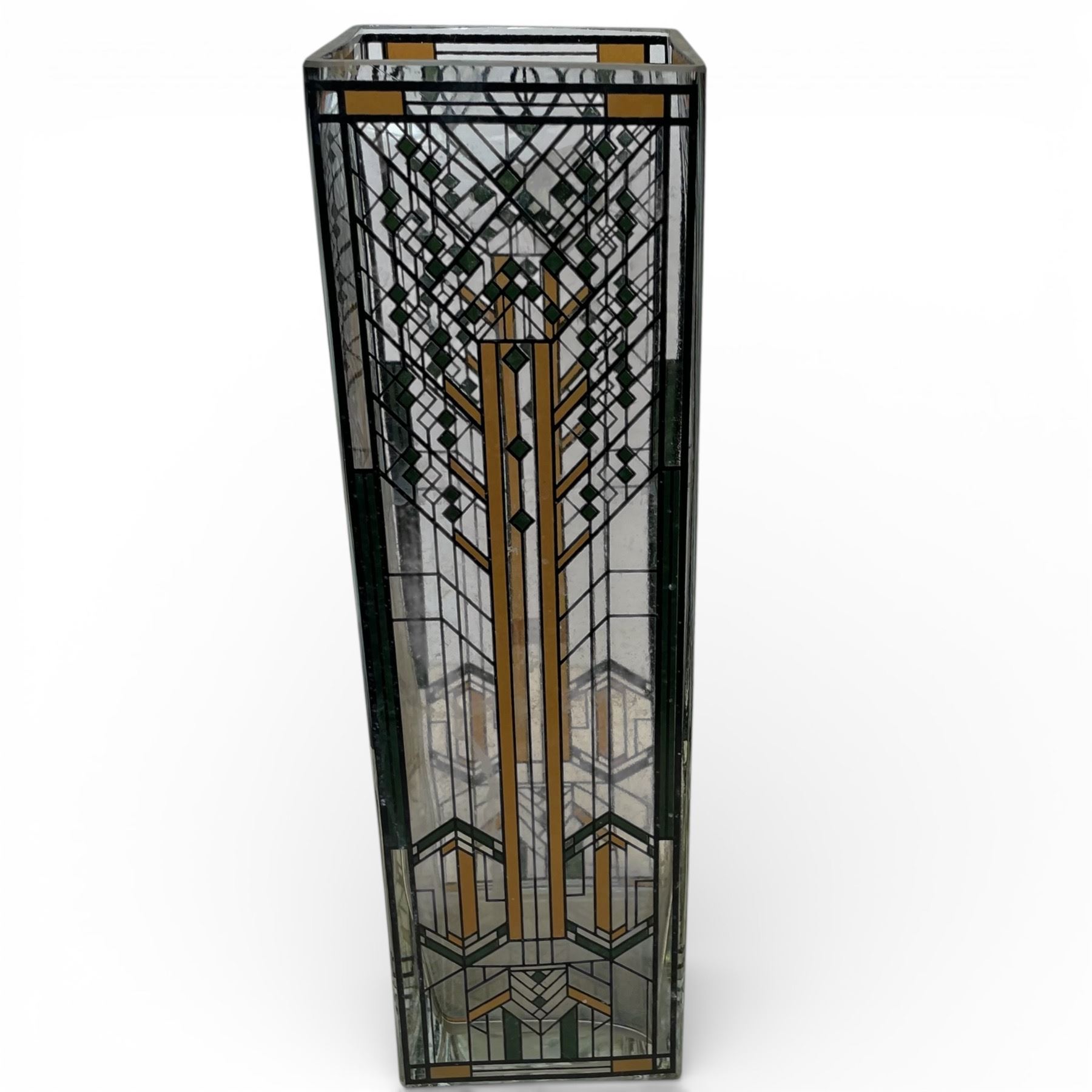 Frank Lloyd Wright Art Deco style glass vase featuring geometric design elements. Dimensions are Length: 4-In, Width: 4-In, Height: 14-In. Item is as pictured.