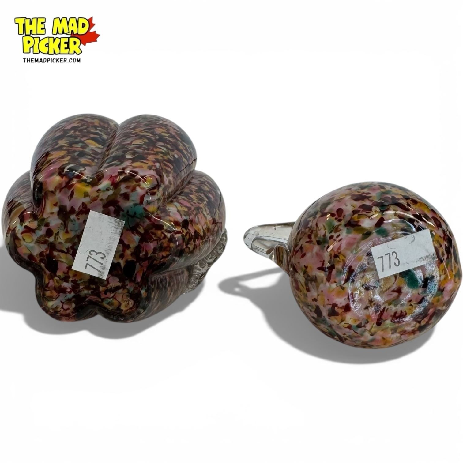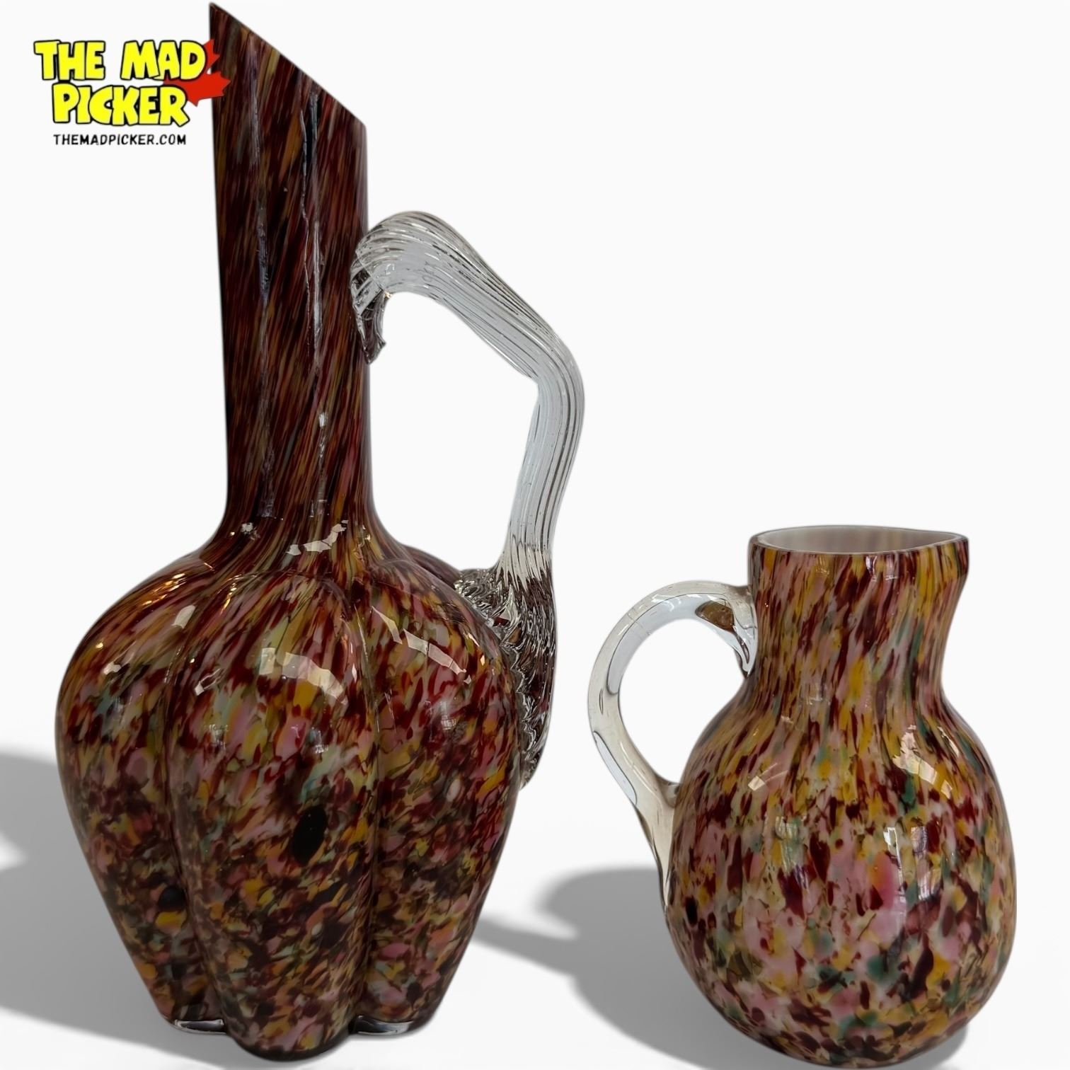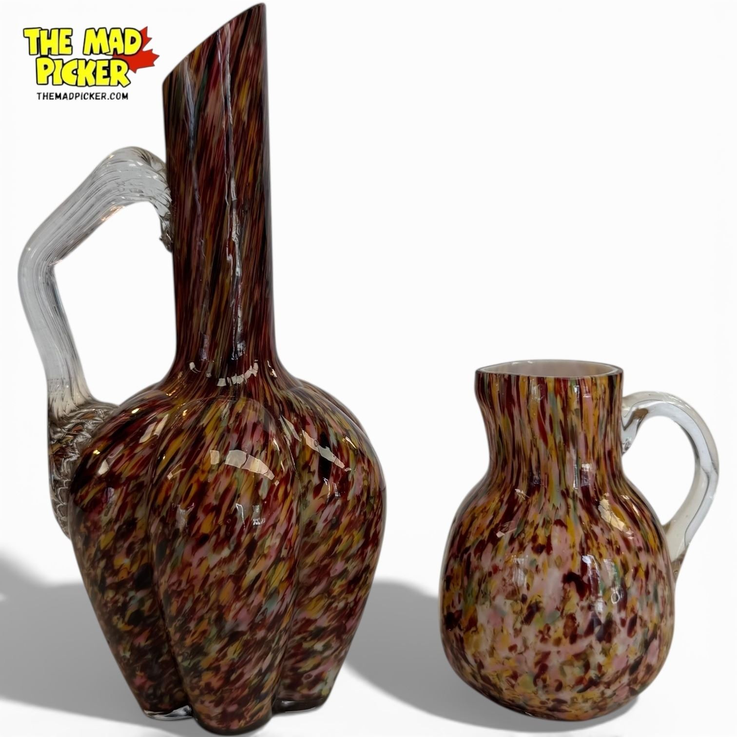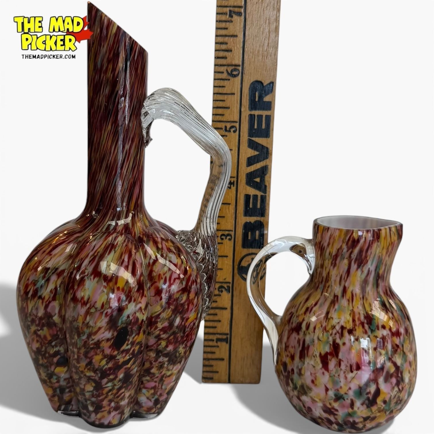 Franz Welz style cased spatter glass pitchers made in Czechoslovakia, circa 1920s Art Deco era style. Features distinctive tortoise-shell spatter pattern in rich red/brown and gold tones with clear, applied handles. Unsigned pieces reflecting Art Deco craftsmanship. Taller of the two is 7" tall.