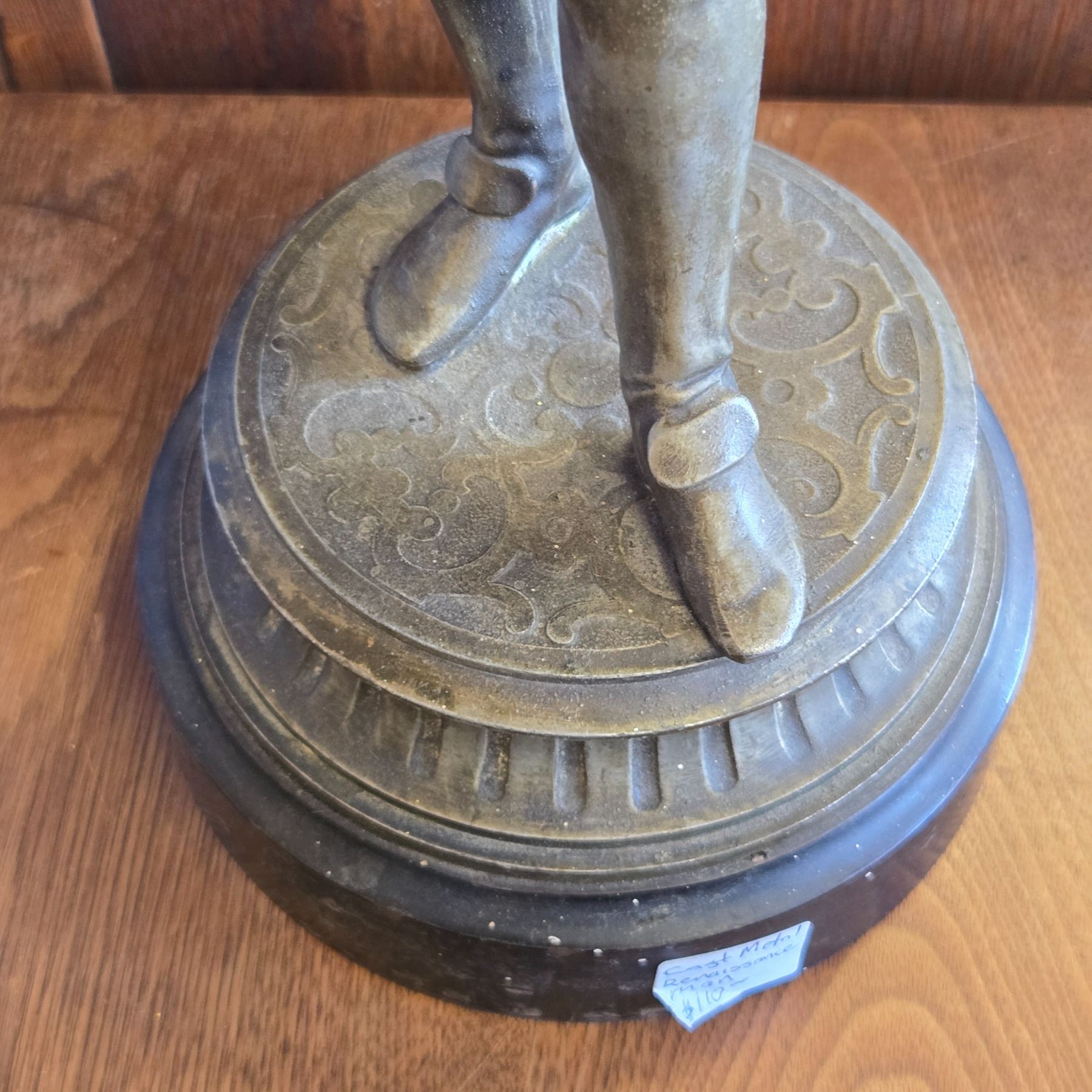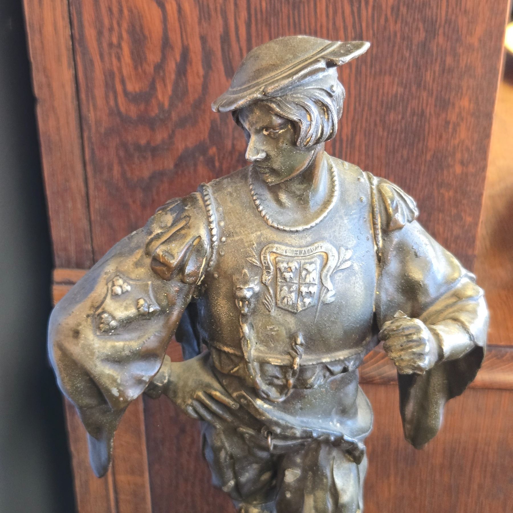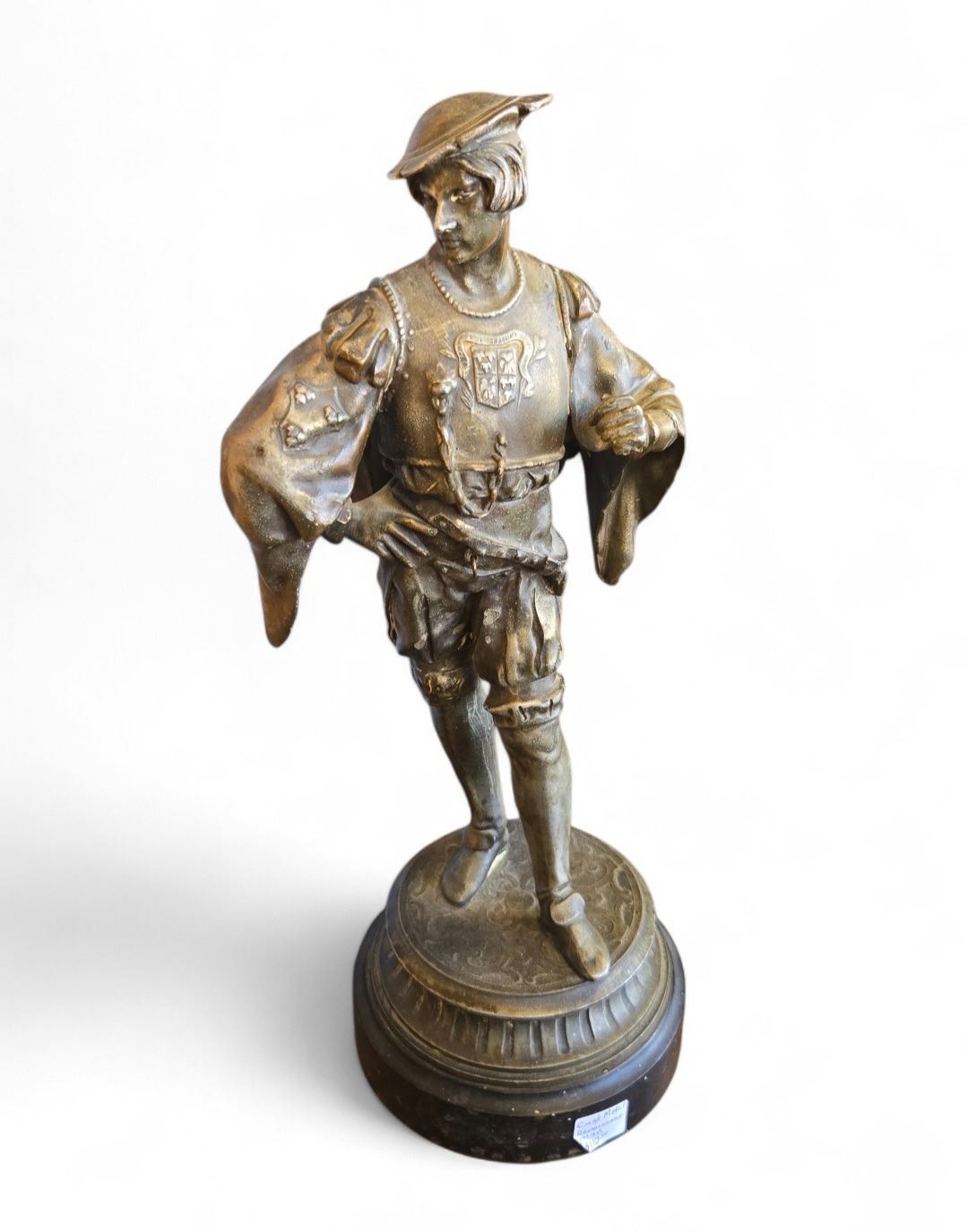 French bronze sculpture depicting a cavalier soldier standing 16-Inch tall. Detailed craftsmanship in bronze material, showcasing the soldier in traditional attire. Designed with intricate detailing and a solid bronze base. Item is as pictured.