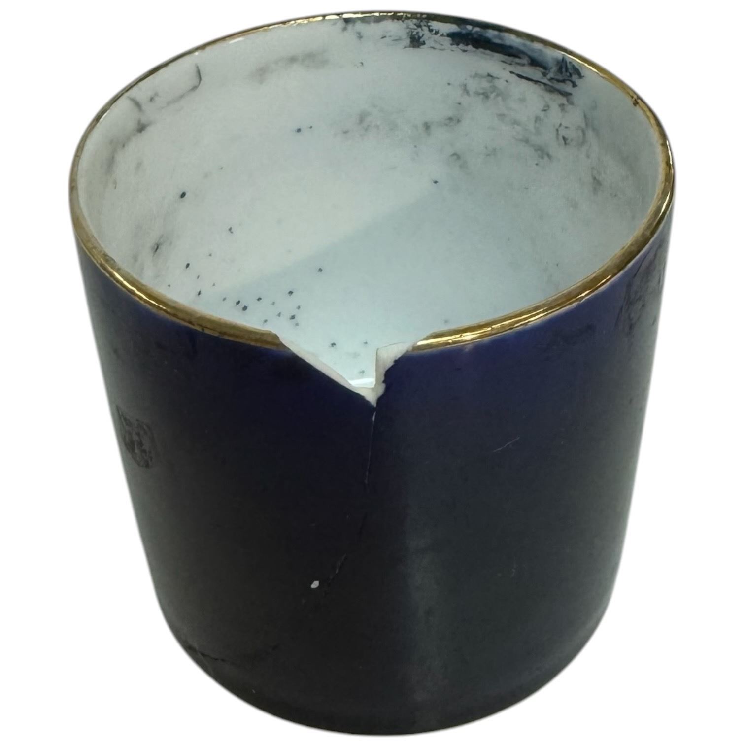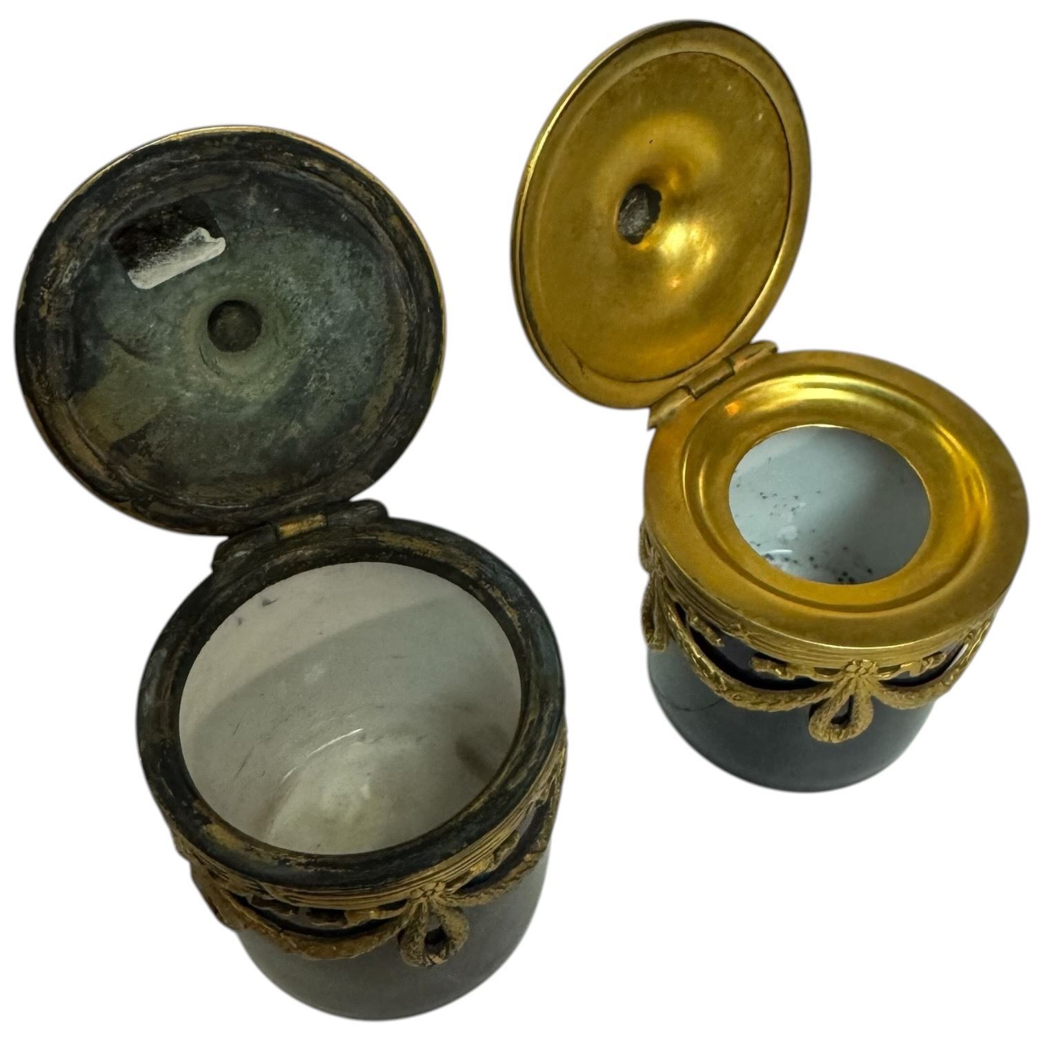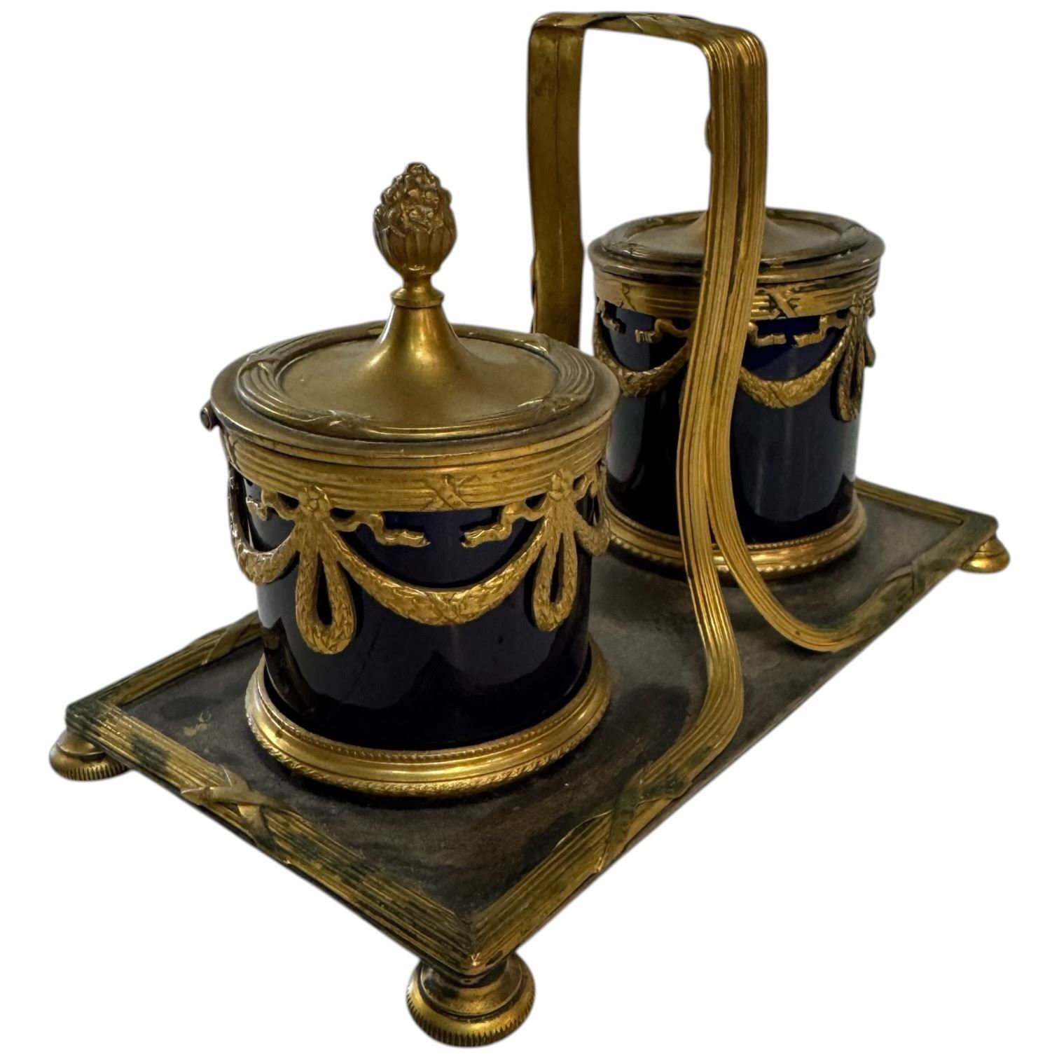 French Napoleon III Style Double Inkwell with Cobalt Glazed Pots in Stand (one pot is cracked)