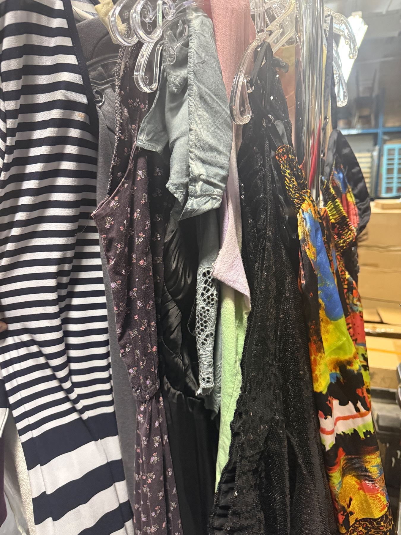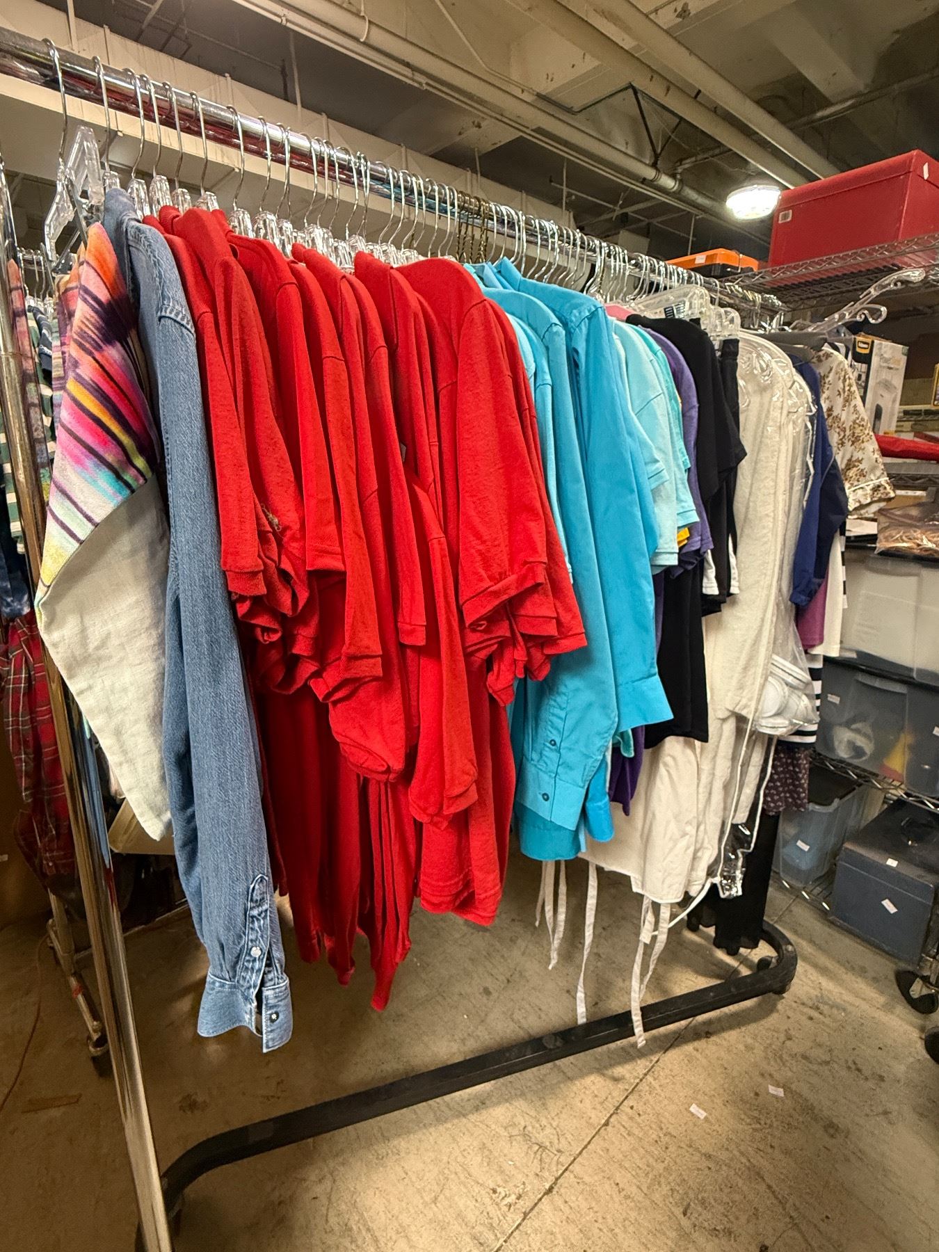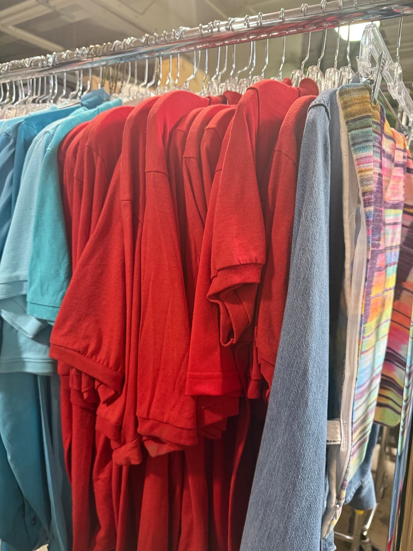 Full Rack of Apparel: Denim, Red Polos, Mixed Tops, and More (Rack Not Included)