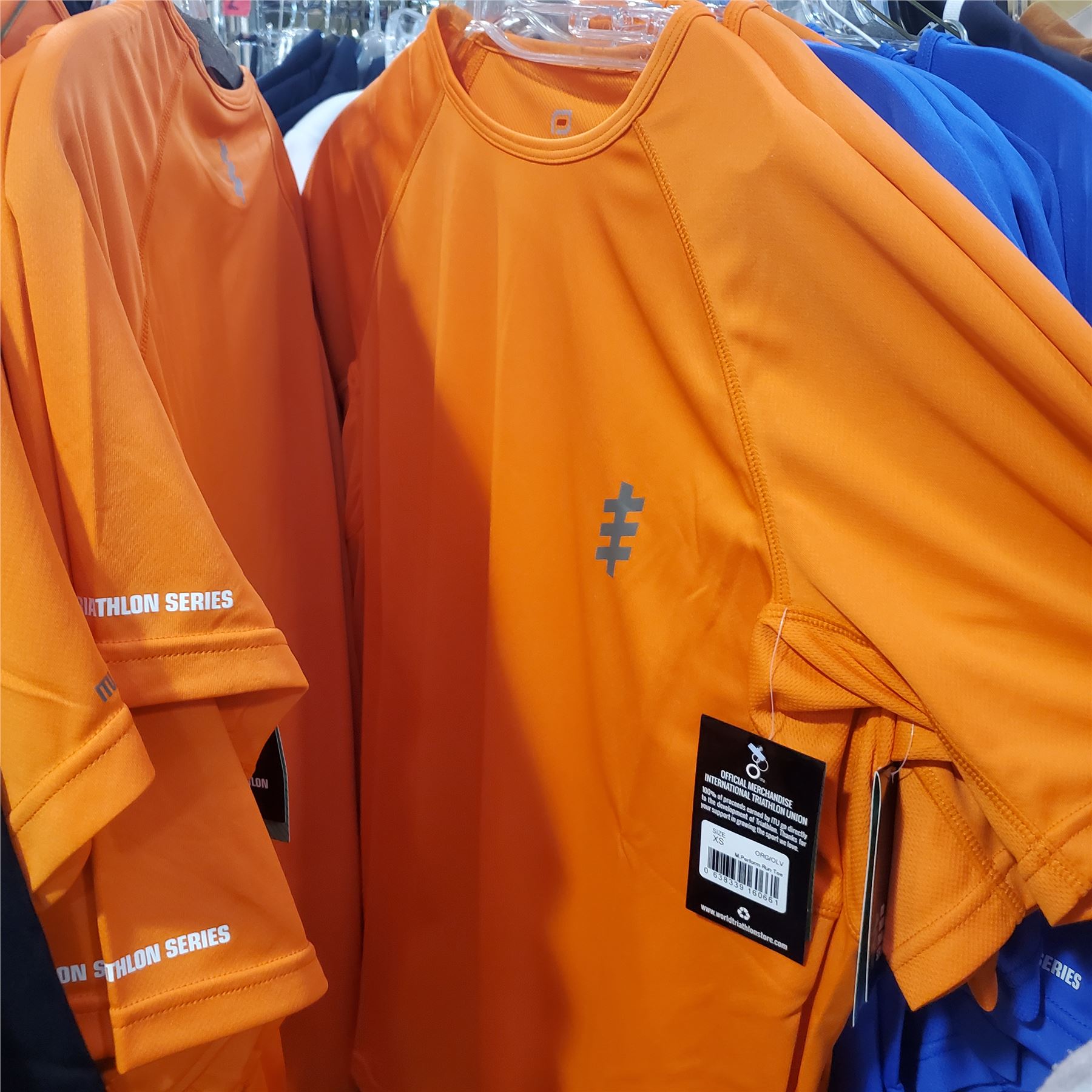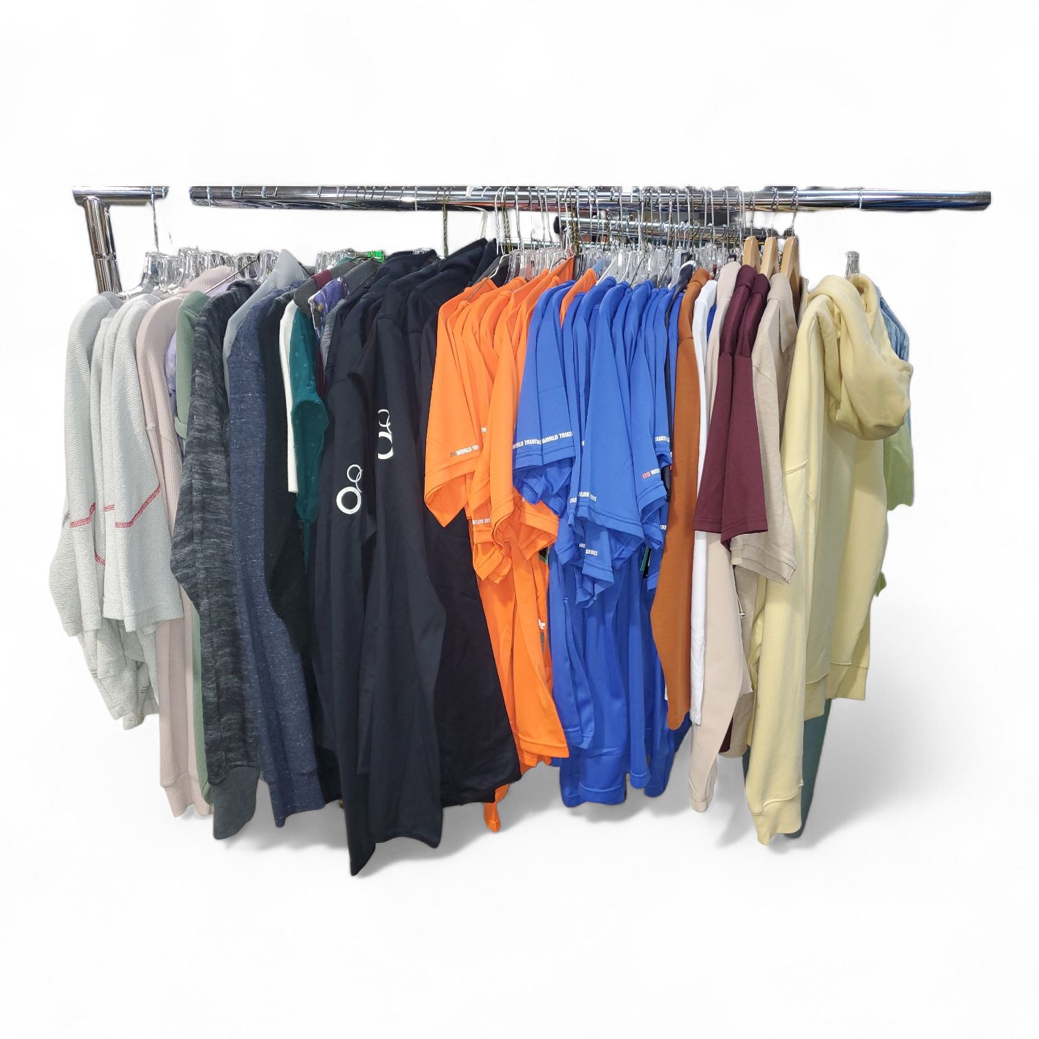 Full Rack of Branded T-Shirts & Hoodies - Orange, Blue & Neutral Colors, Assorted Sizes - Rack Not Included