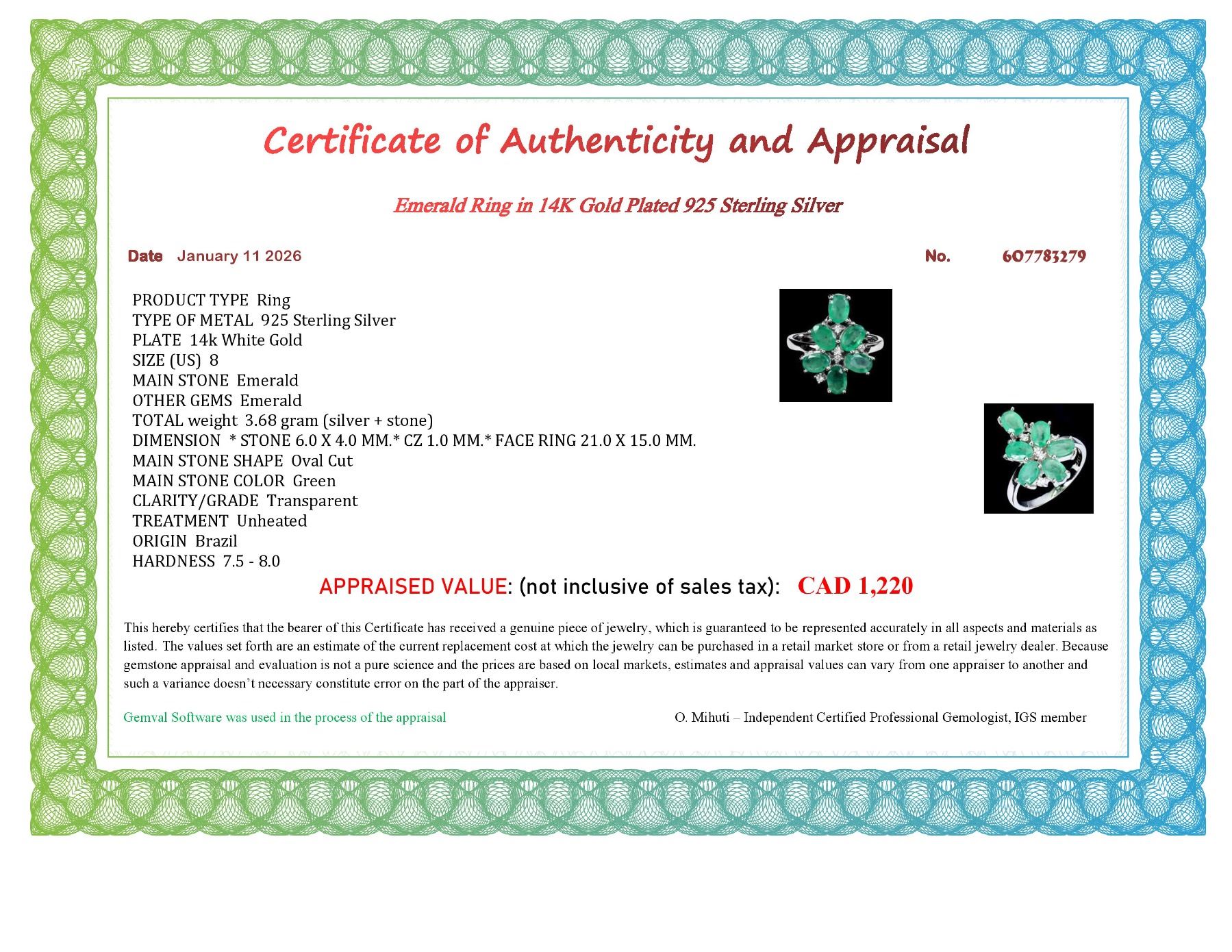 GOOD CLARITY EMERALD RING IN 14K WHITE GOLD PLATED OVER 925 STERLING SILVER - SIZE 8 - APPRAISED REPLACEMENT VALUE CAD 1,220