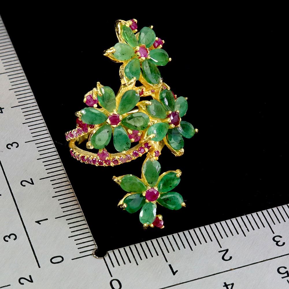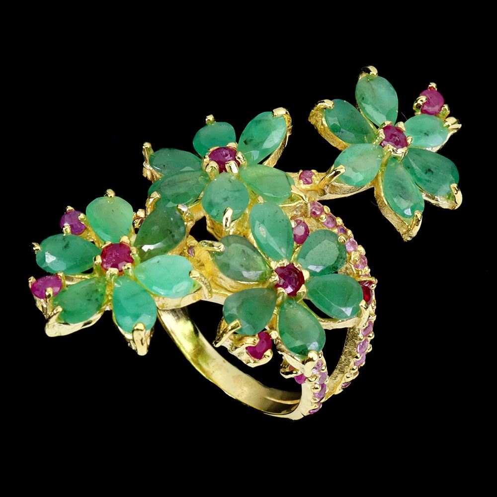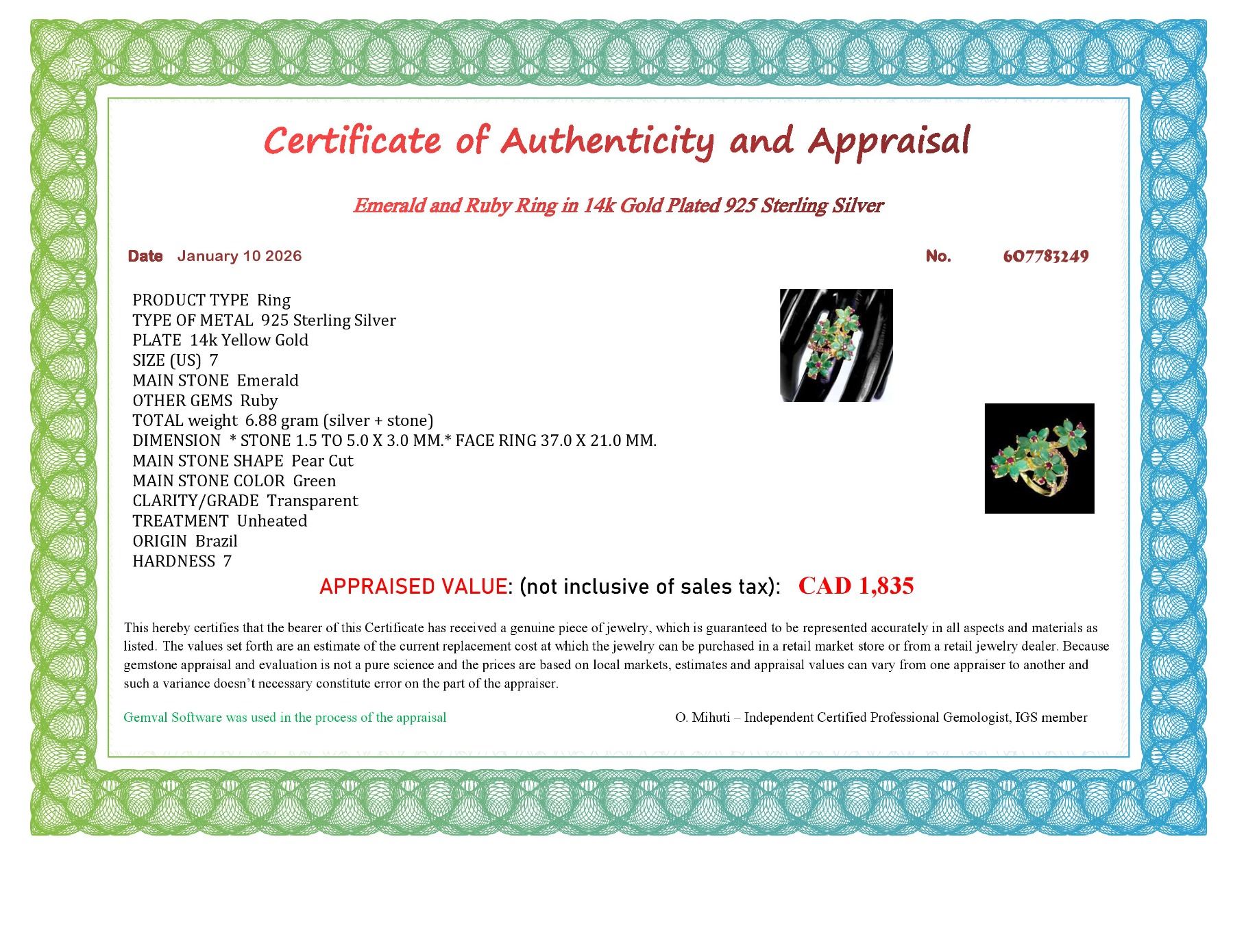 GORGEOUS EMERALD AND RUBY RING IN 14K YELLOW PLATED GOLD OVER 925 STERLING SILVER - SIZE 7 - APPRAISED REPLACEMENT VALUE CAD 1,835