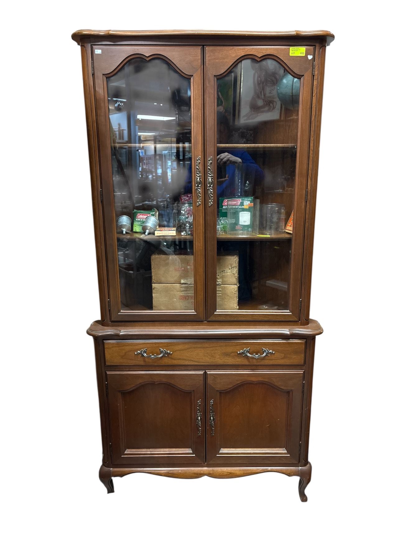 Vintage corner china cabinet by Canadian furniture maker Gibbard. Constructed from solid wood, it measures 36in X 73in X 20in. Features include a corner design ideal for space efficiency and durable craftsmanship. Item is as pictured.