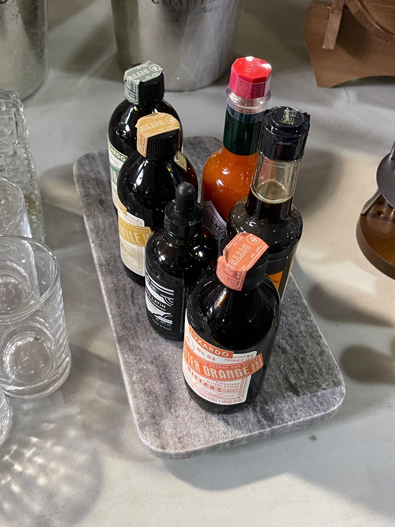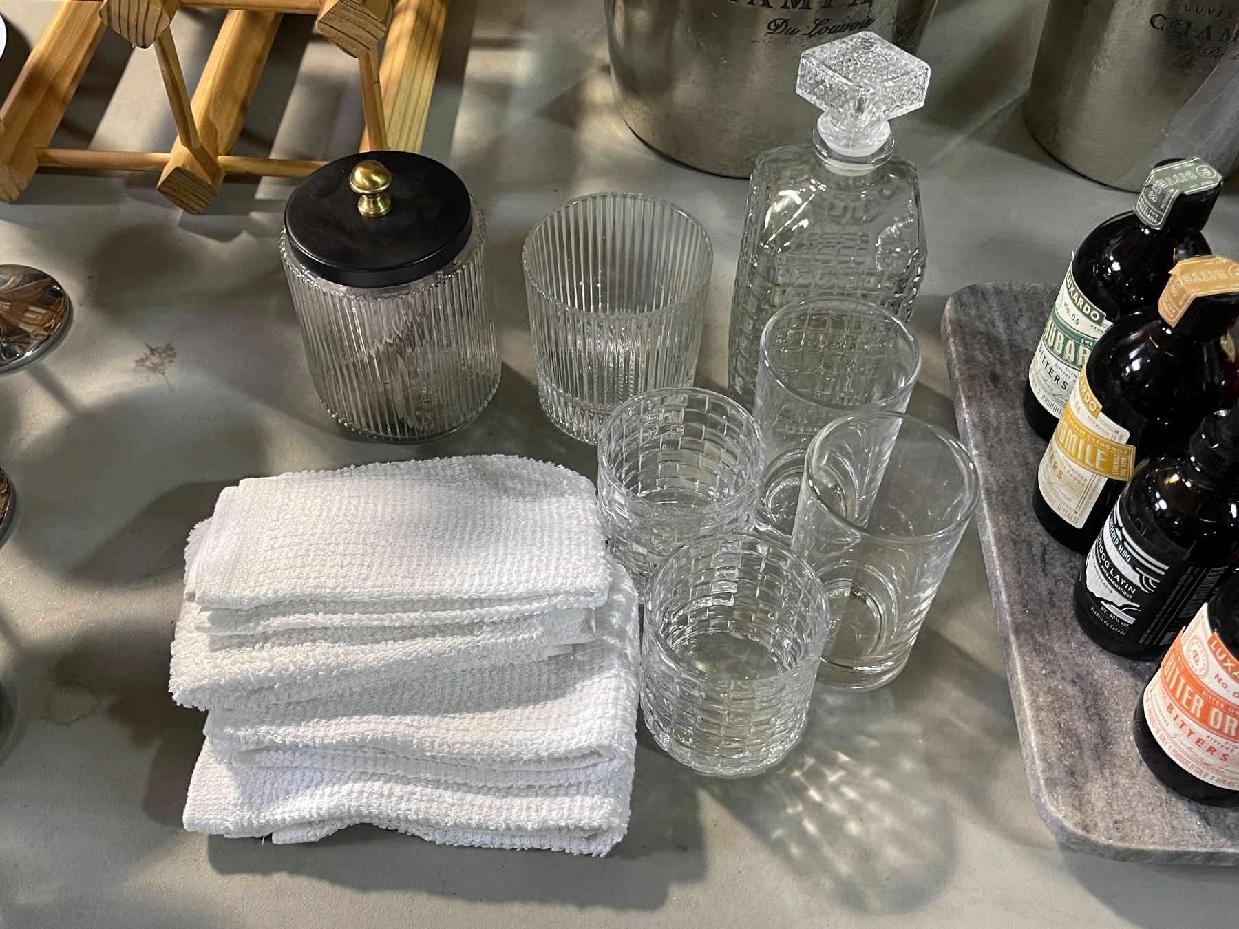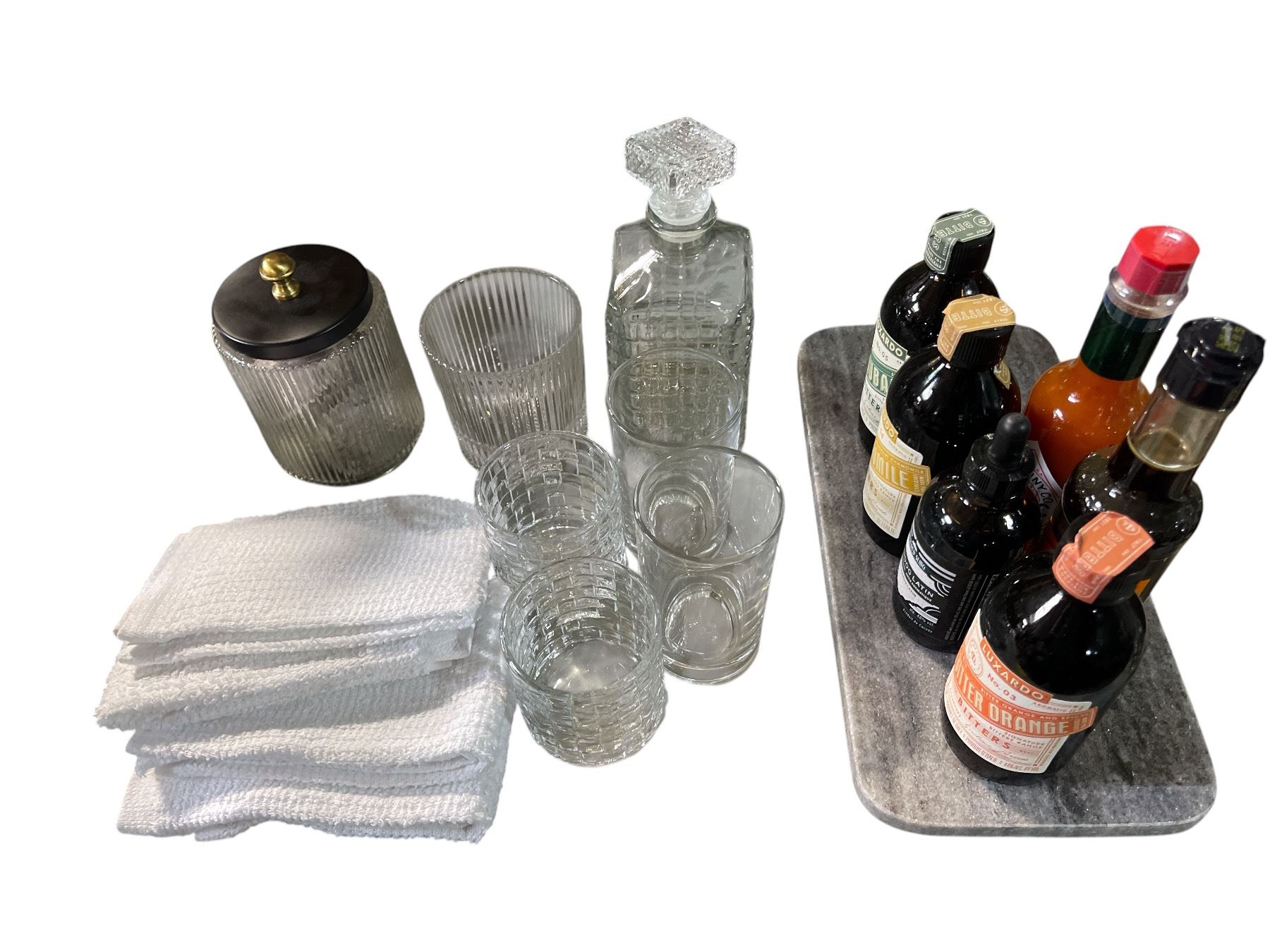 Glass Decanter, Rocks Glasses, Luxardo Bitter Bottles, Marble Tray, and More