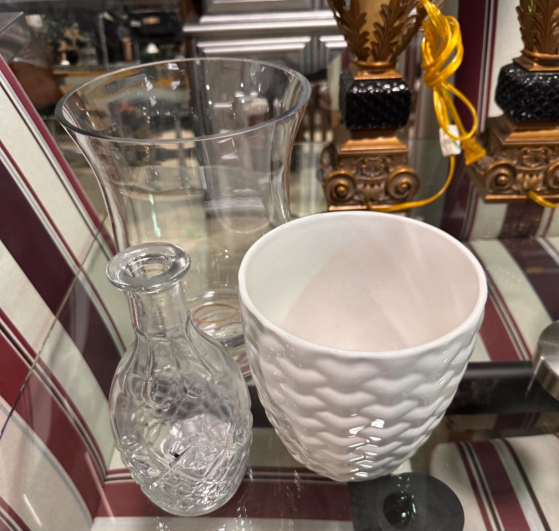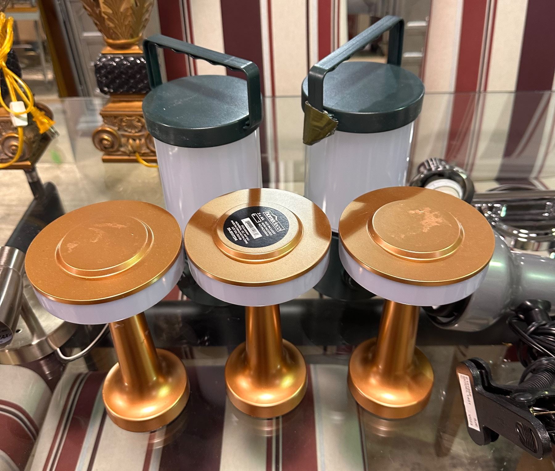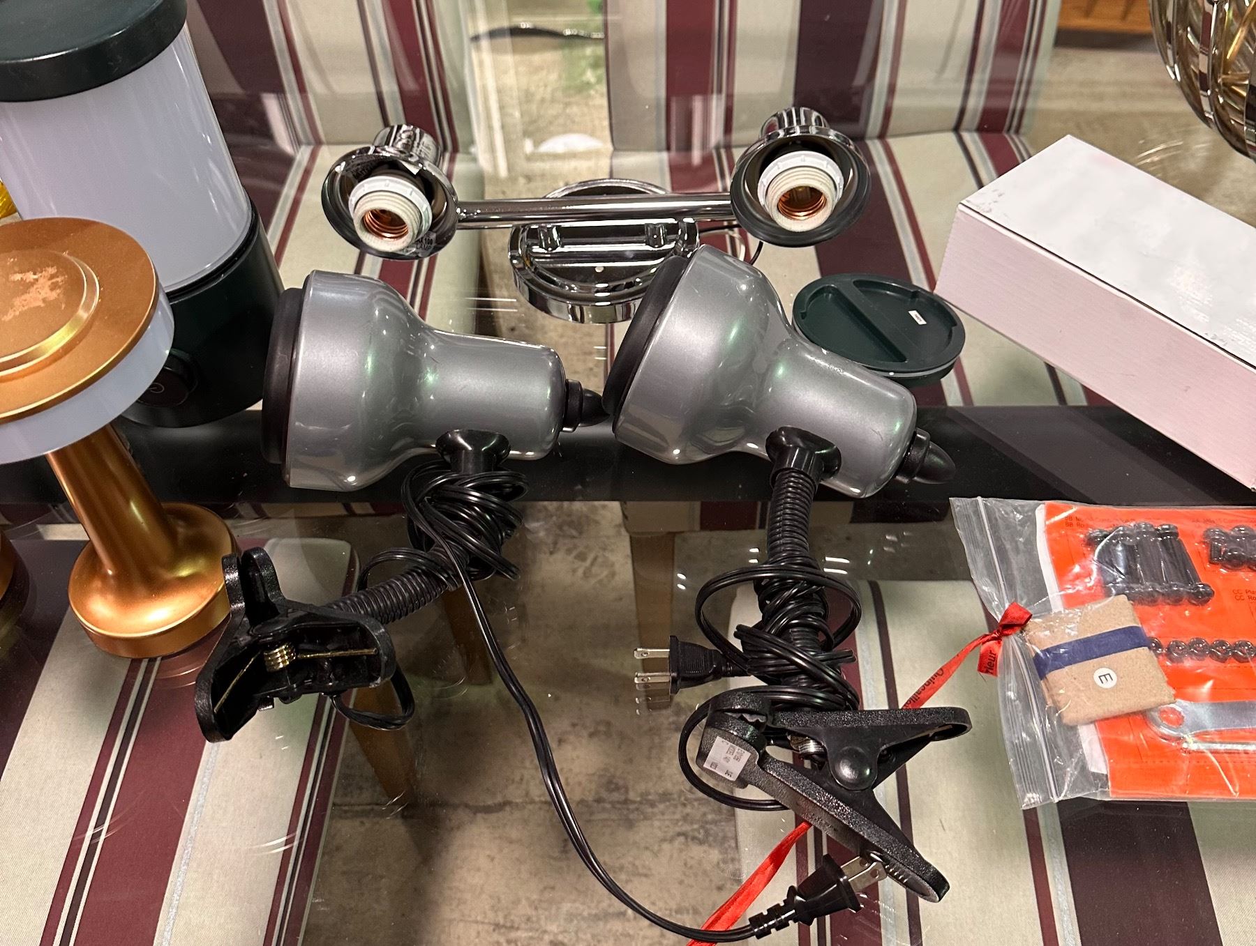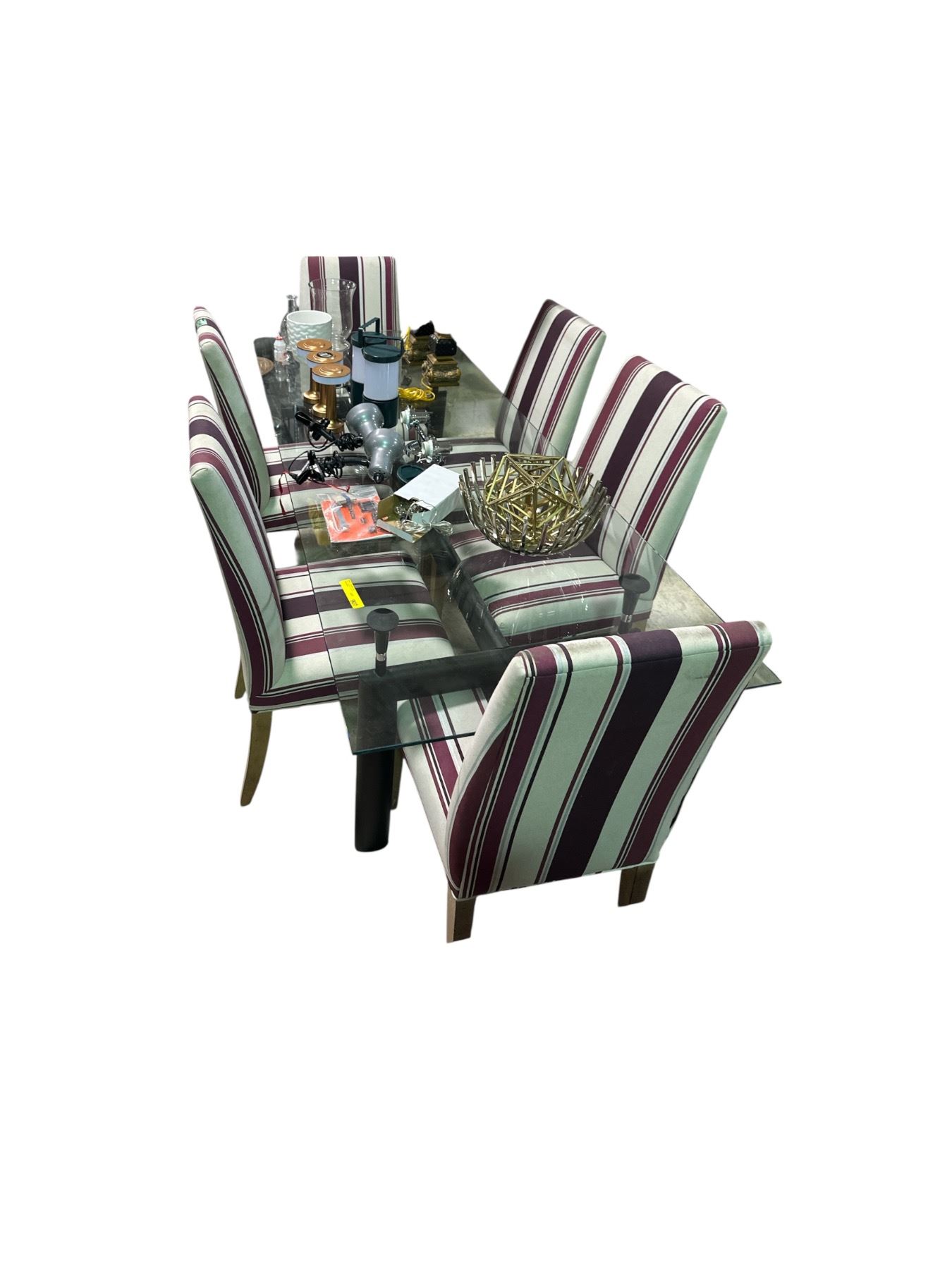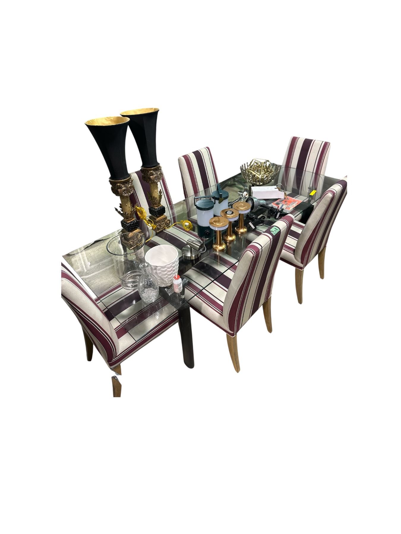 Glass Top Dining Table with Six Upholstered Dining Chairs & Assorted Decor Items - Lights, Vase, Decor Lamps