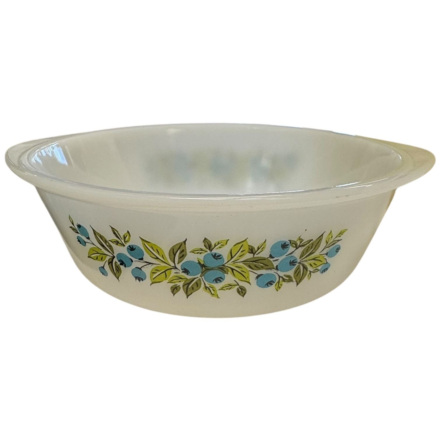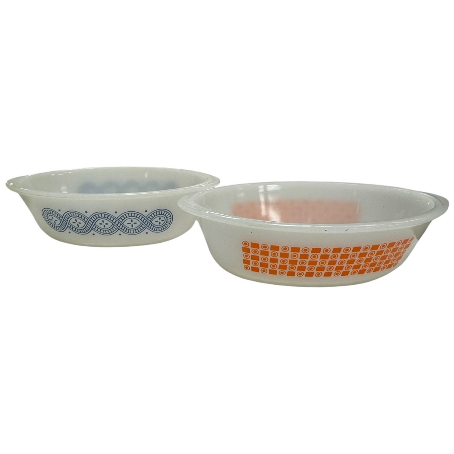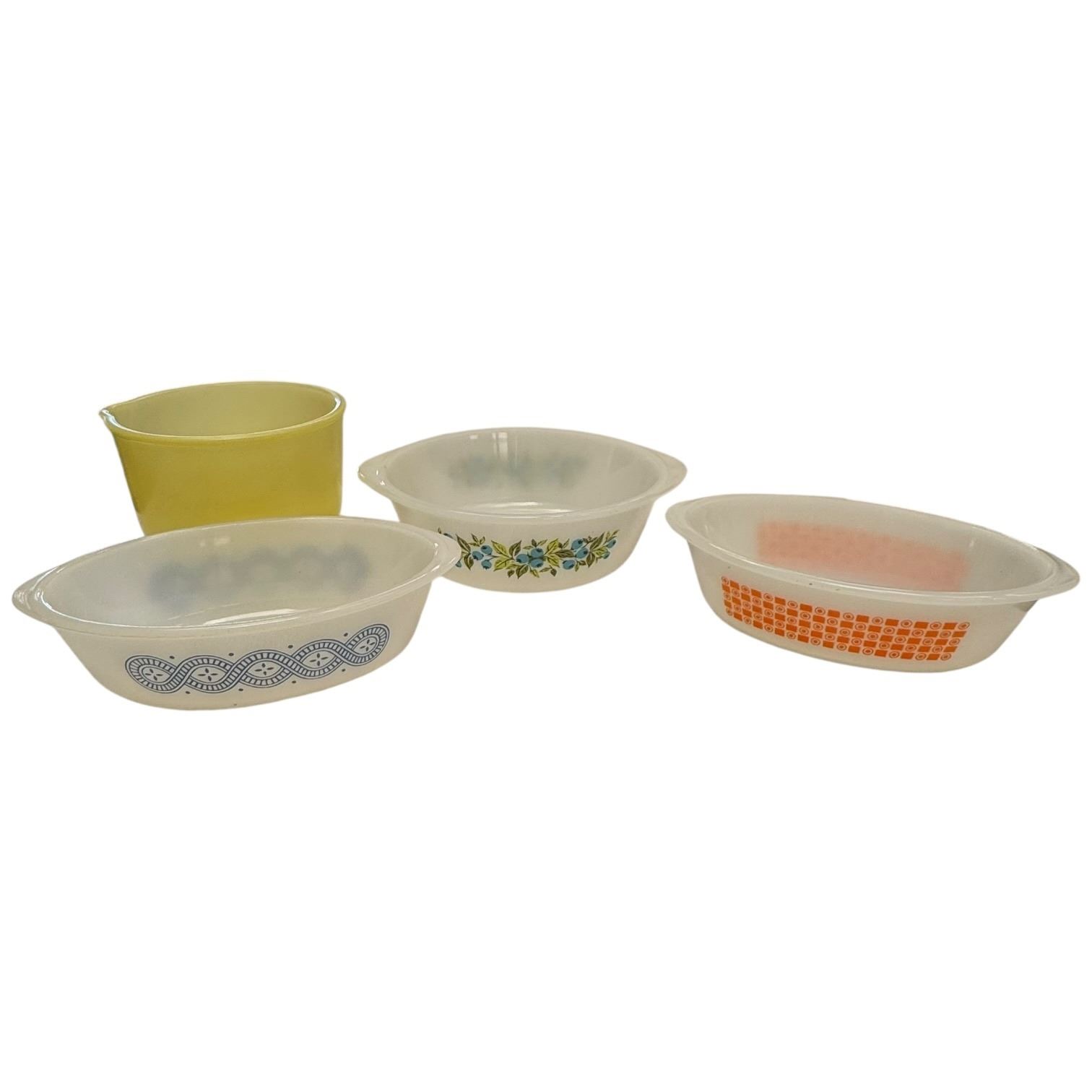 This collection includes Glassbake bakeware featuring Blue Onion, Orange Pattern, and Blueberry casserole dishes. Additionally, a Sunbeam mixing bowl is included. Glassbake items are known for their vintage charm and durability. Item is as pictured. No chips.