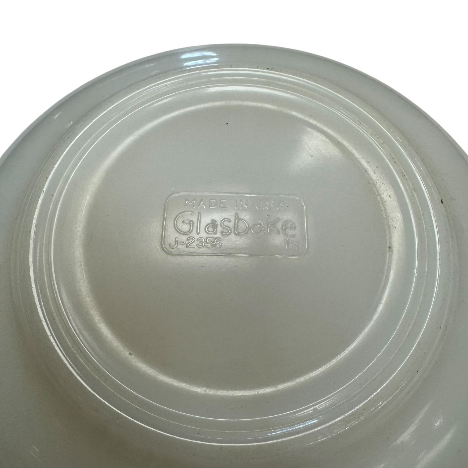 Glasbake mixing bowl model J-2356 featuring the green Herbs pattern. Made of oven-proof glass, this bowl measures 9.5-Inch in diameter. Glasbake was a line of glassware manufactured by McKee Glass Company from the 1930s to 1950s. Item is as pictured.