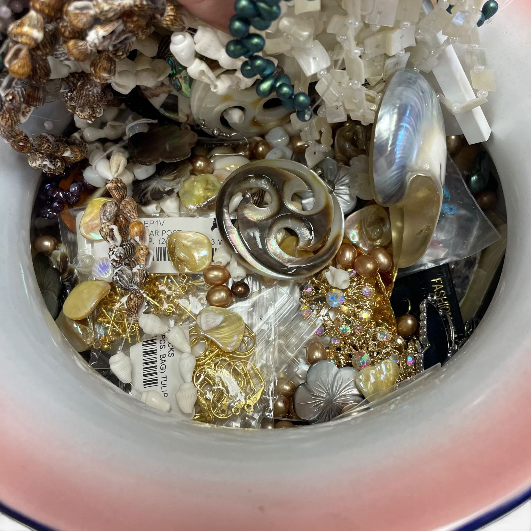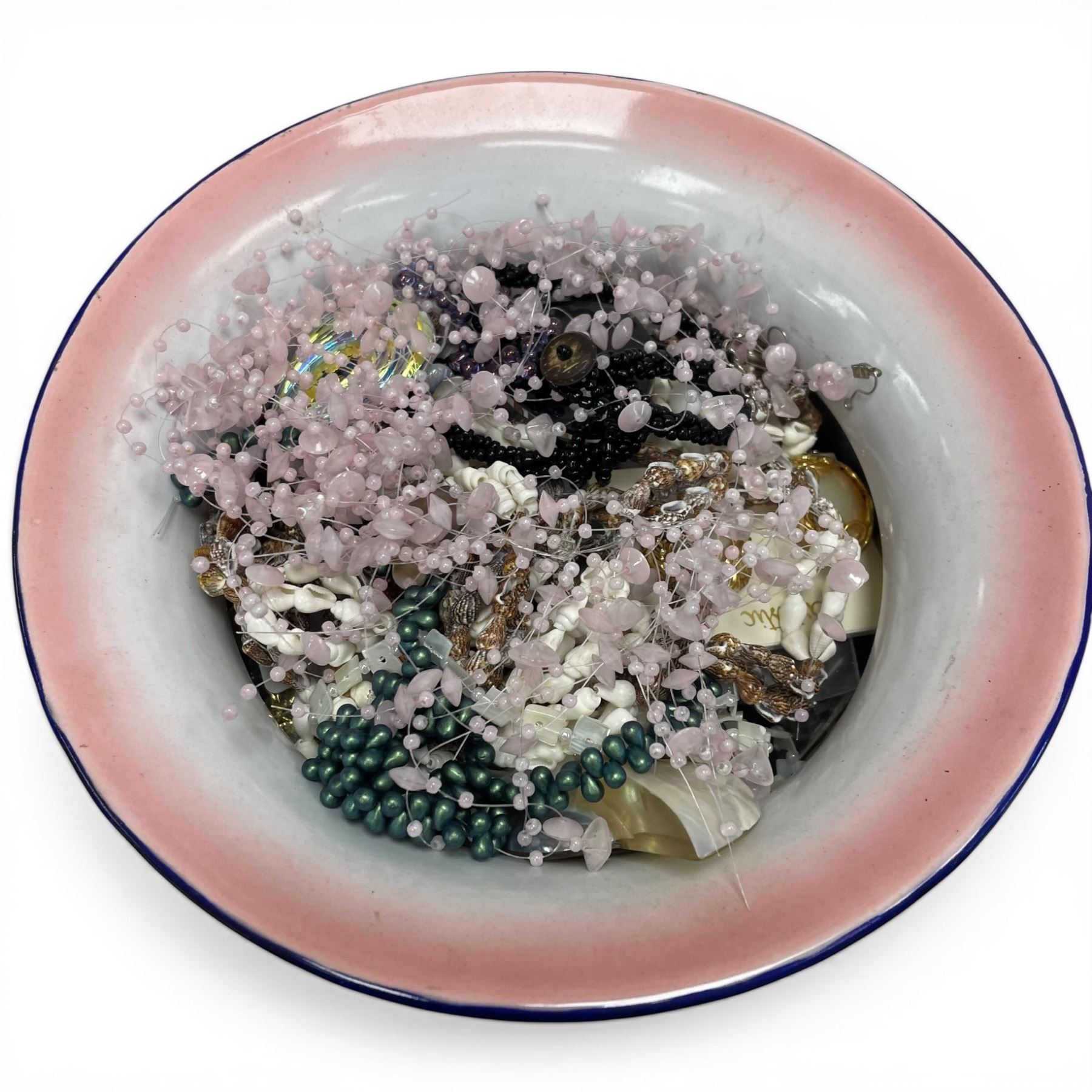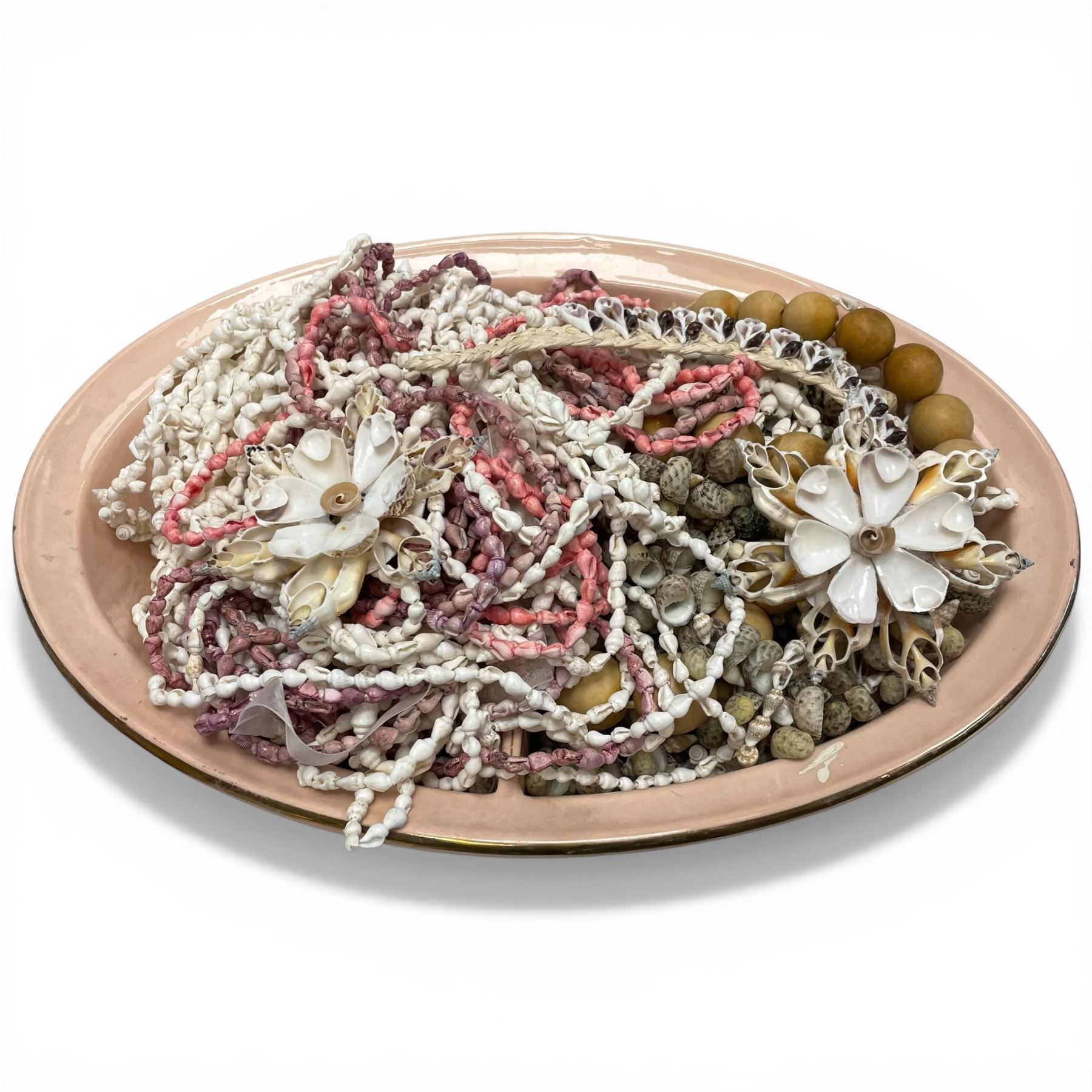 Glazed Ceramic Bowl and Dish Full of Bead and Shell Jewelry (Oval dish is 11" x 14" x 4" deep)
