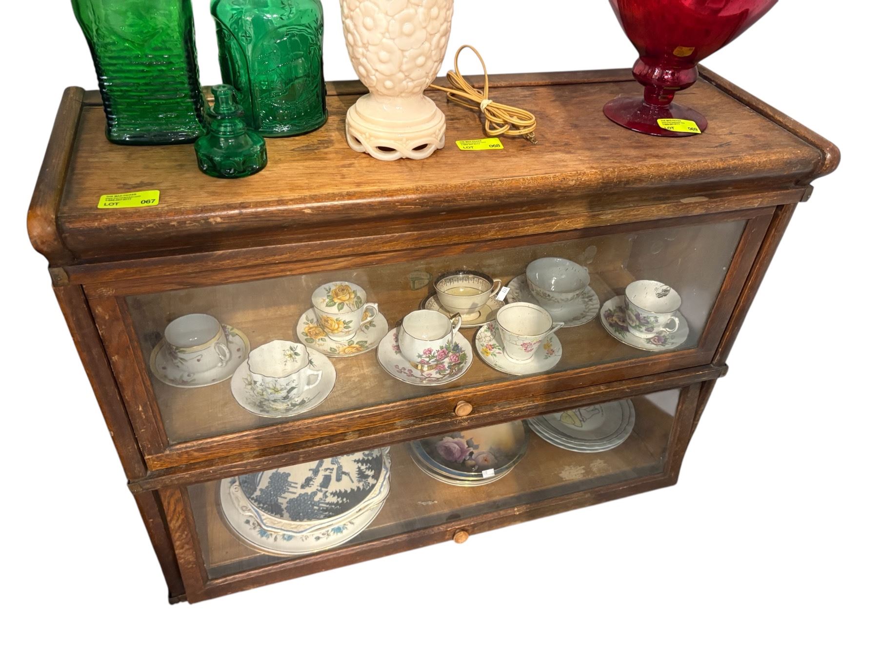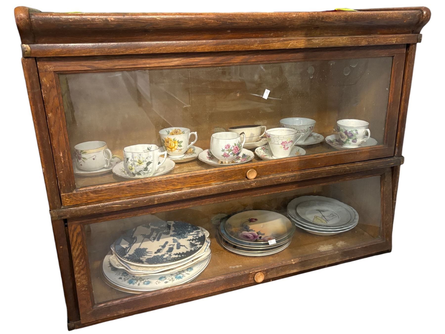 Globe-Wernicke Co. barrister bookcase in dark stain, measuring 26x36x12 inches. Incomplete set including two shelves, top cap, and two glass-fronted doors. Known for modular stacking design, Globe-Wernicke bookcases were produced in Cincinnati, Ohio, in the early to mid-20th century. Contents not included.