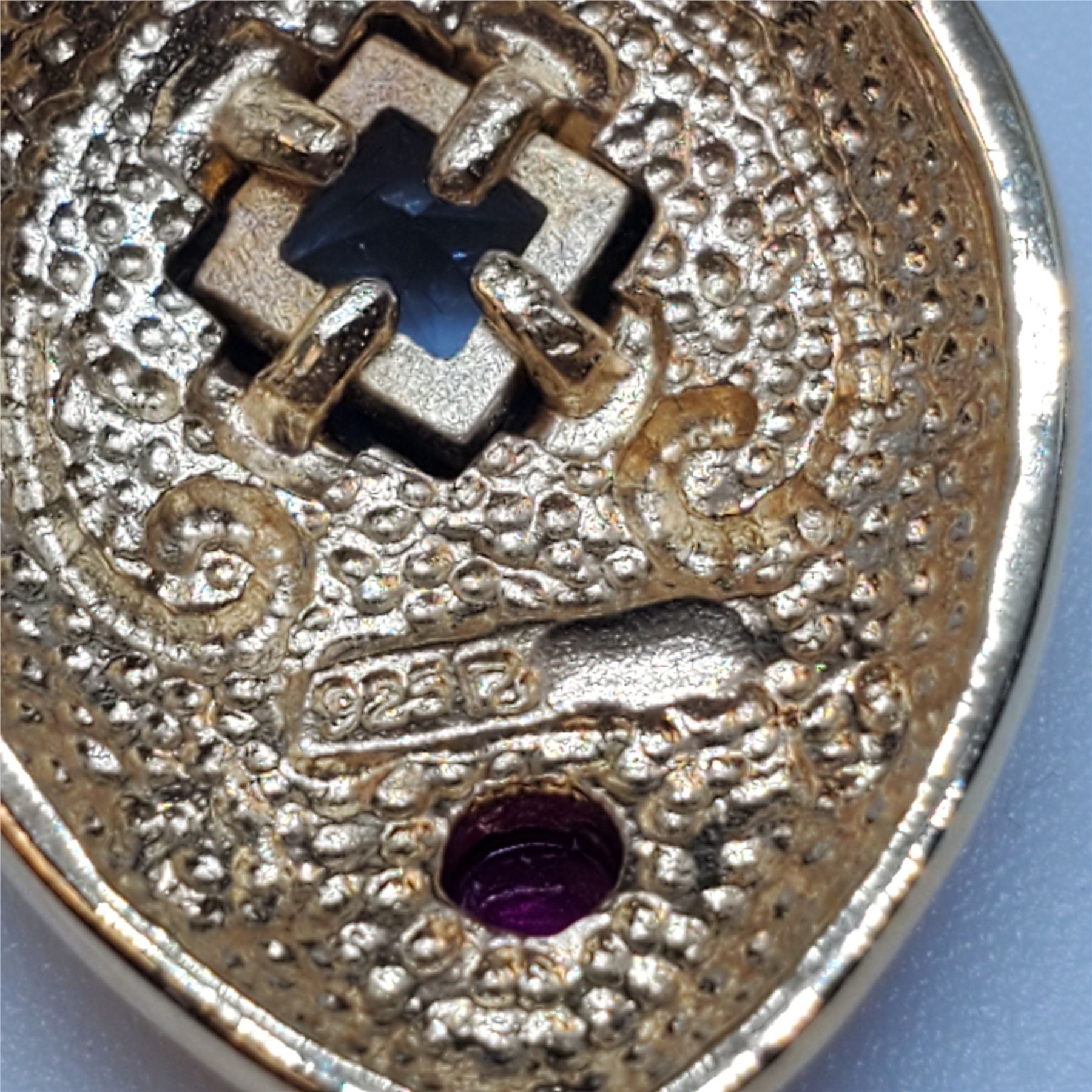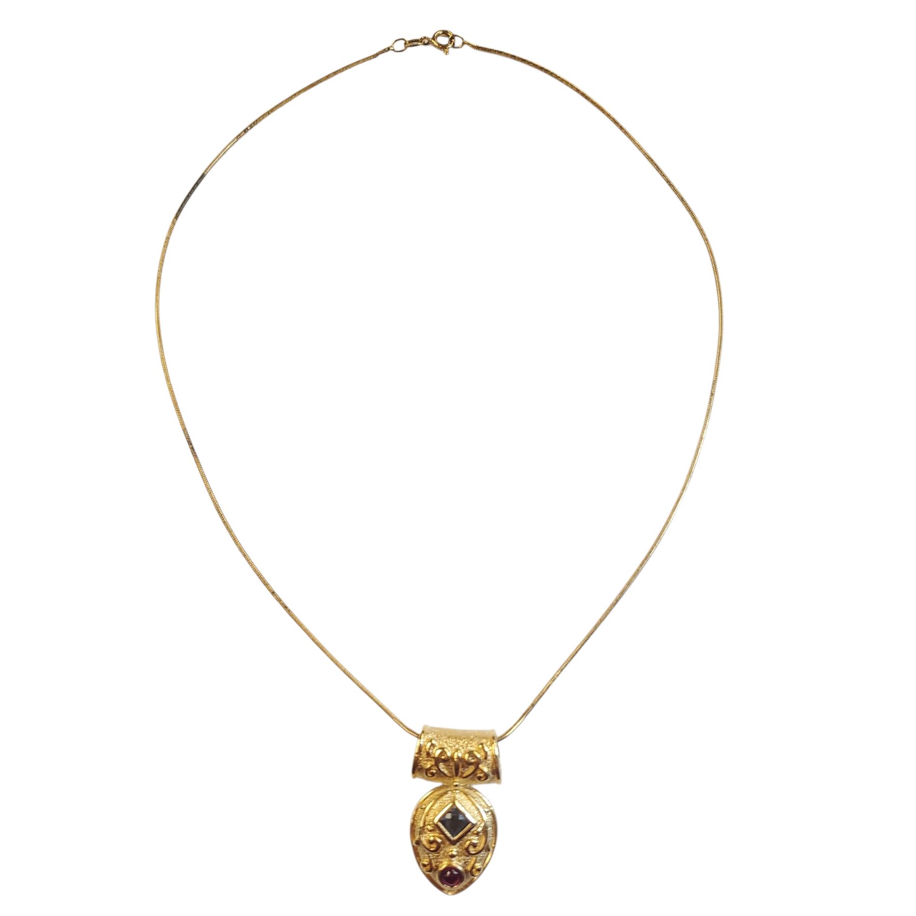 Gold Plated Sterling Silver Pendant Necklace with Blue Crystal & Garnet Gemstone - 34" x 1.25" Pendant on a 17" Chain - Weight: 13.3 grams