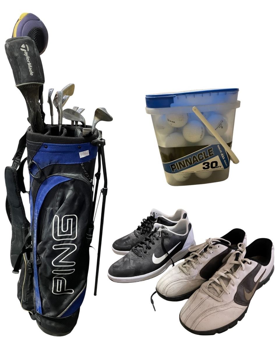 Golf Set Lot with Ping Bag, Clubs, Balls & Nike Athletic Shoes (2 Pairs)