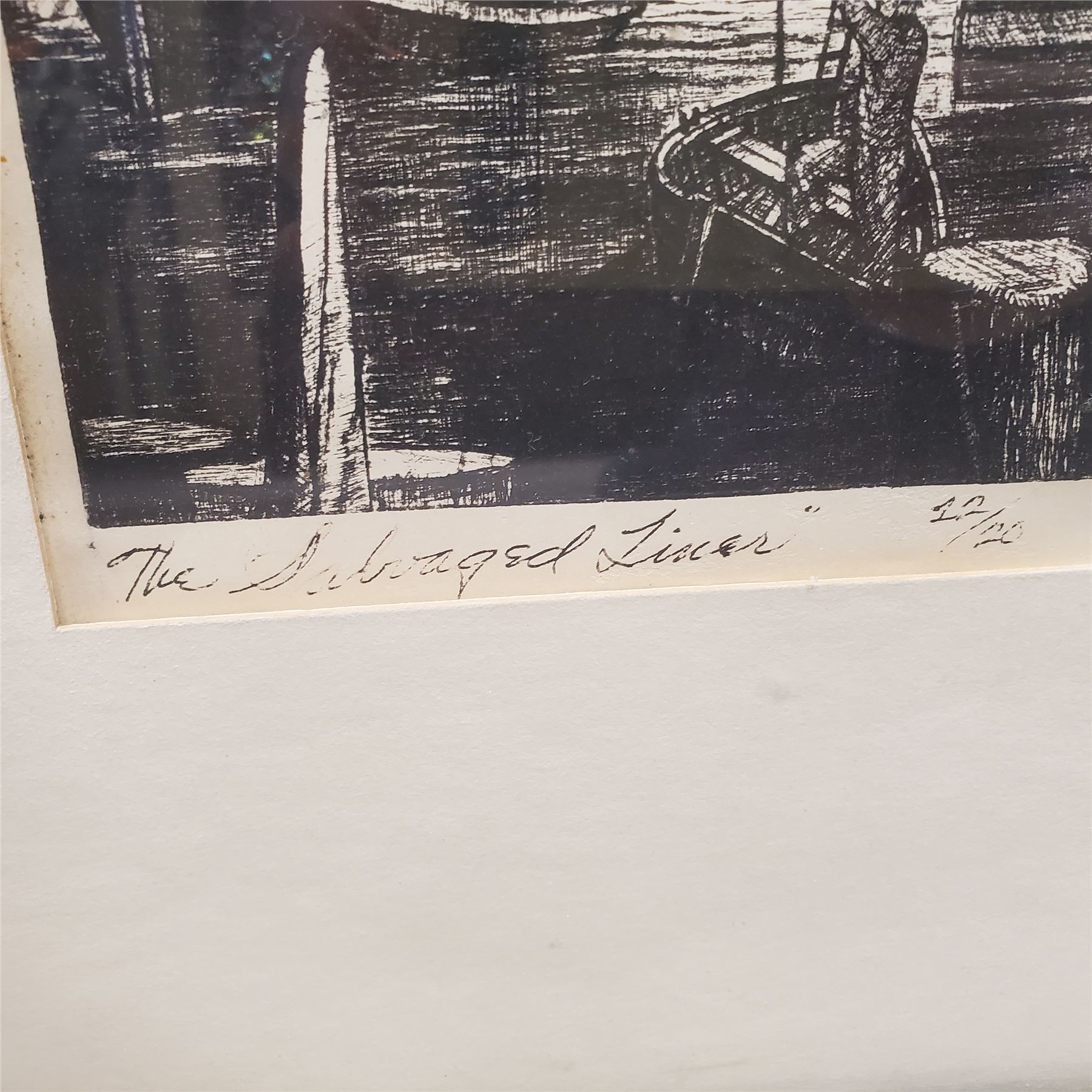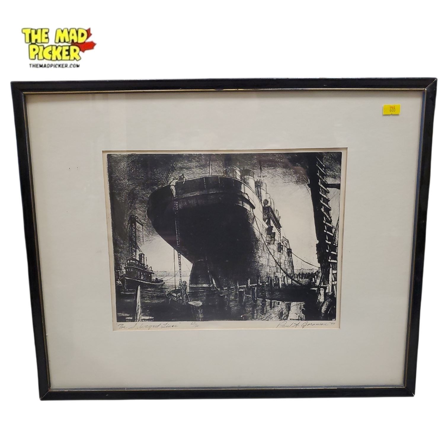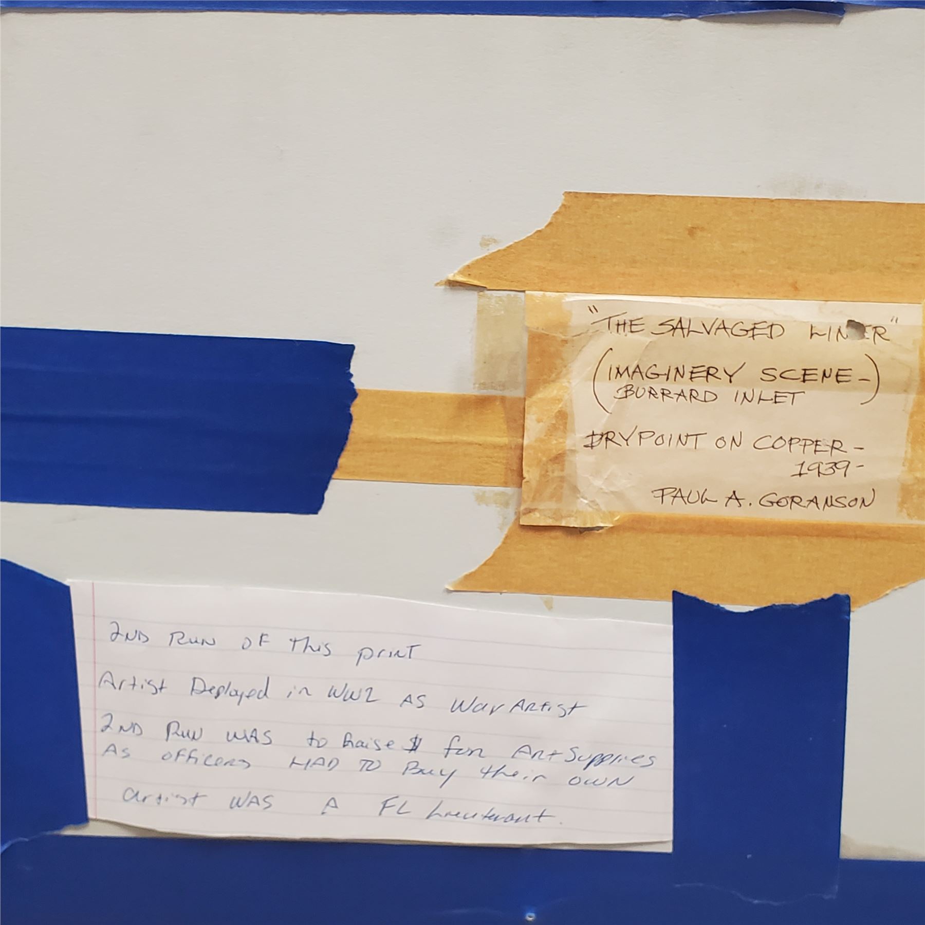 The composition features a partially salvaged ocean liner set against the industrial backdrop of Burrard Inlet-an evocative blend of realism and artistic invention. The print captures the tension between decay and renewal, a theme that resonated strongly in the late 1930s as global conflict loomed. Goranson's ability to merge technical precision with atmospheric storytelling makes this piece a standout example of pre‑war Canadian printmaking.