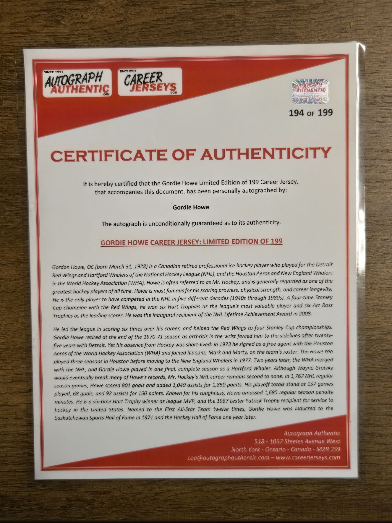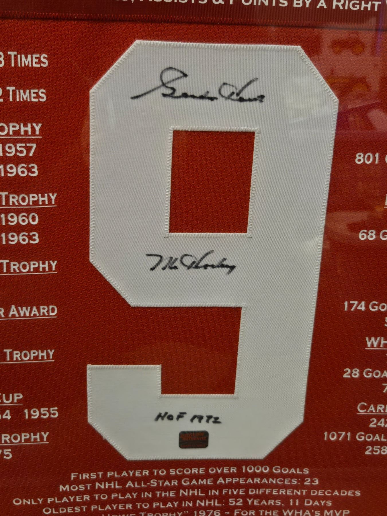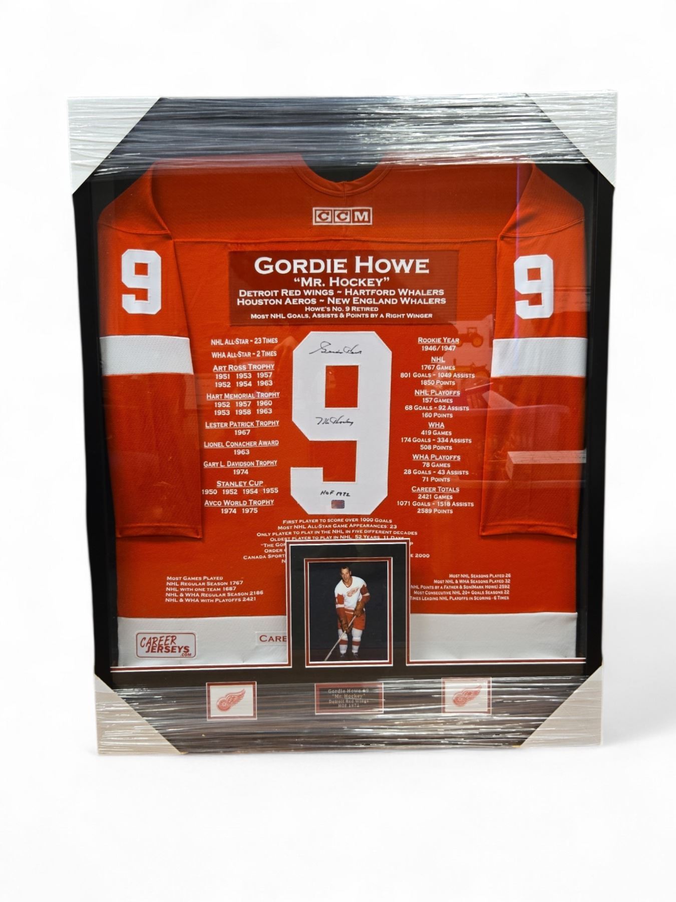 Gordie Howe #9 "Mr. Hockey" Detroit Red Wings "HOF 1972" Limited Edition of 199 Career Framed Jersey Hand-Autographed - with COA (Frame: 33 1/2" L x 42" H x 2" D). Estimated retail value is $2000-$3500! Check out Icons.com for the value of this and similar products. Perfect for Christmas and an investment that will hold it's value. This is 194/199 in a limited edition run. Careerjerseys.com