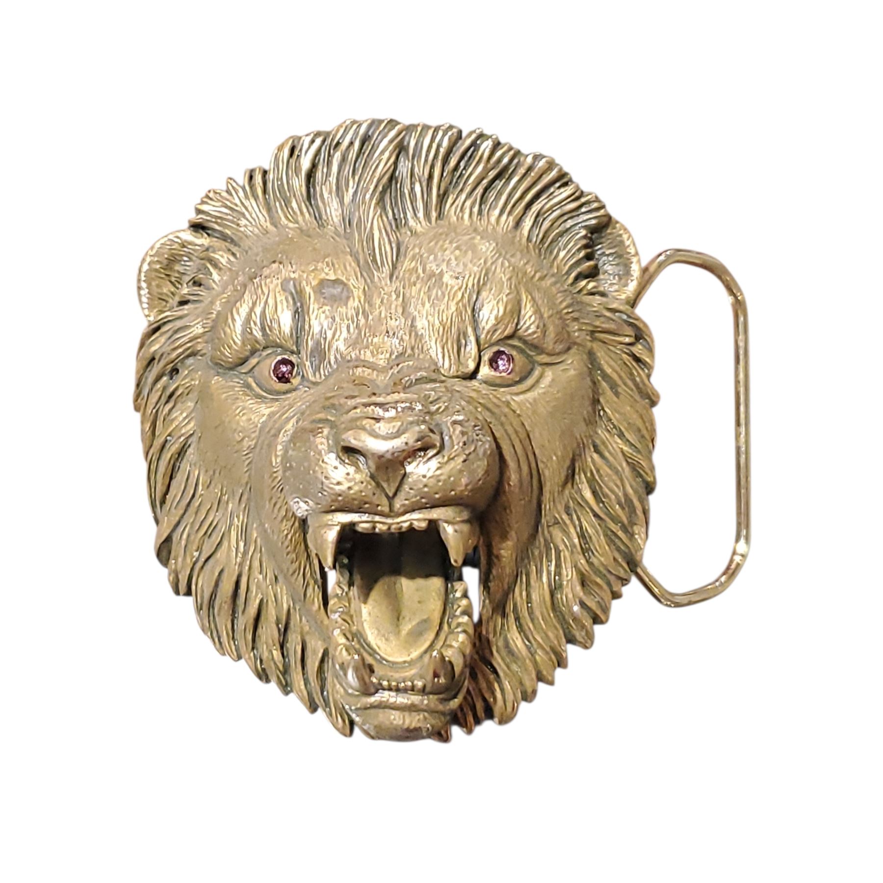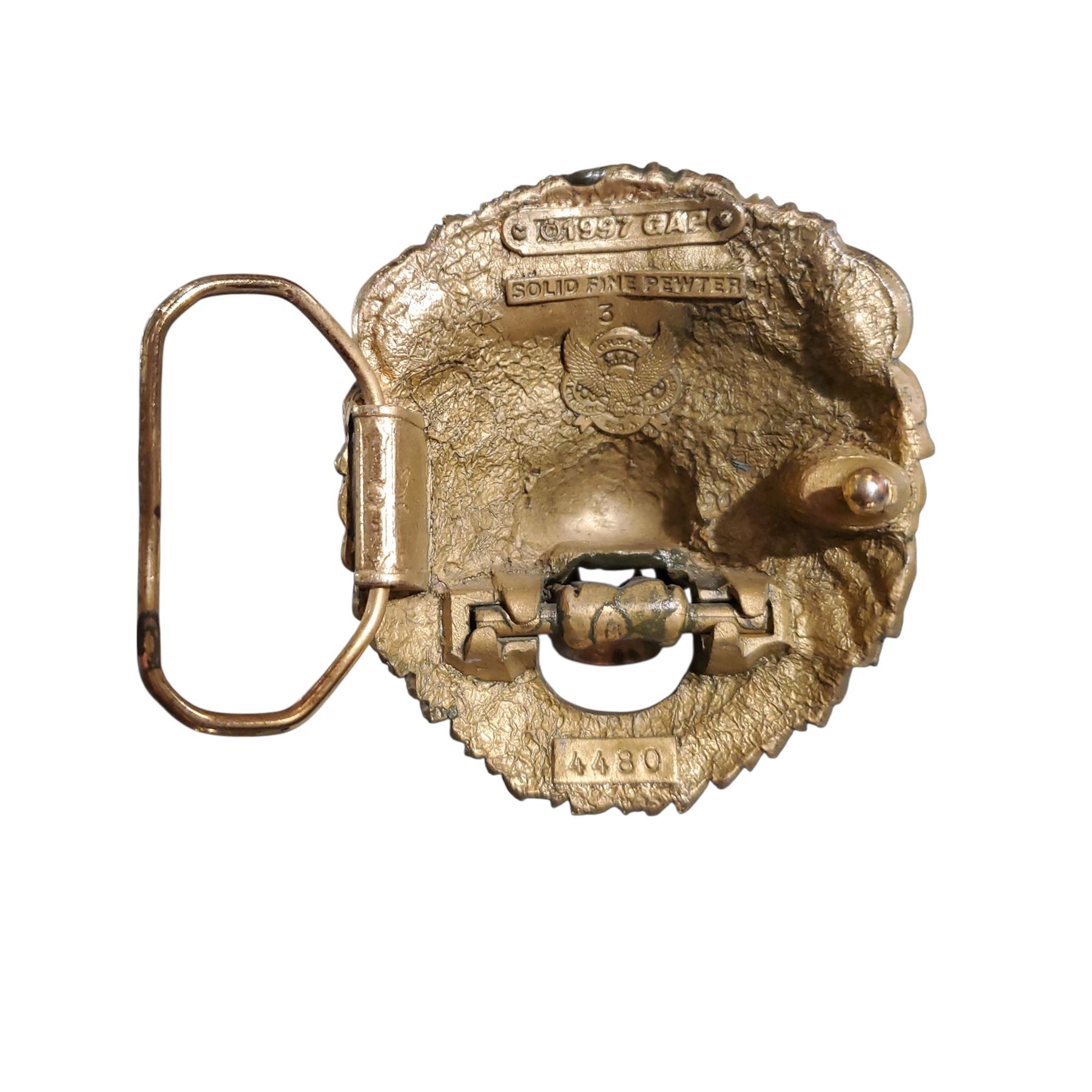 Great American Pewter belt buckle from 1997 featuring a roaring lion design with an articulating mouth. Made of pewter and marked GAP on the reverse. Notable for its detailed craftsmanship depicting the lion's fierce expression and functional movable jaw feature.