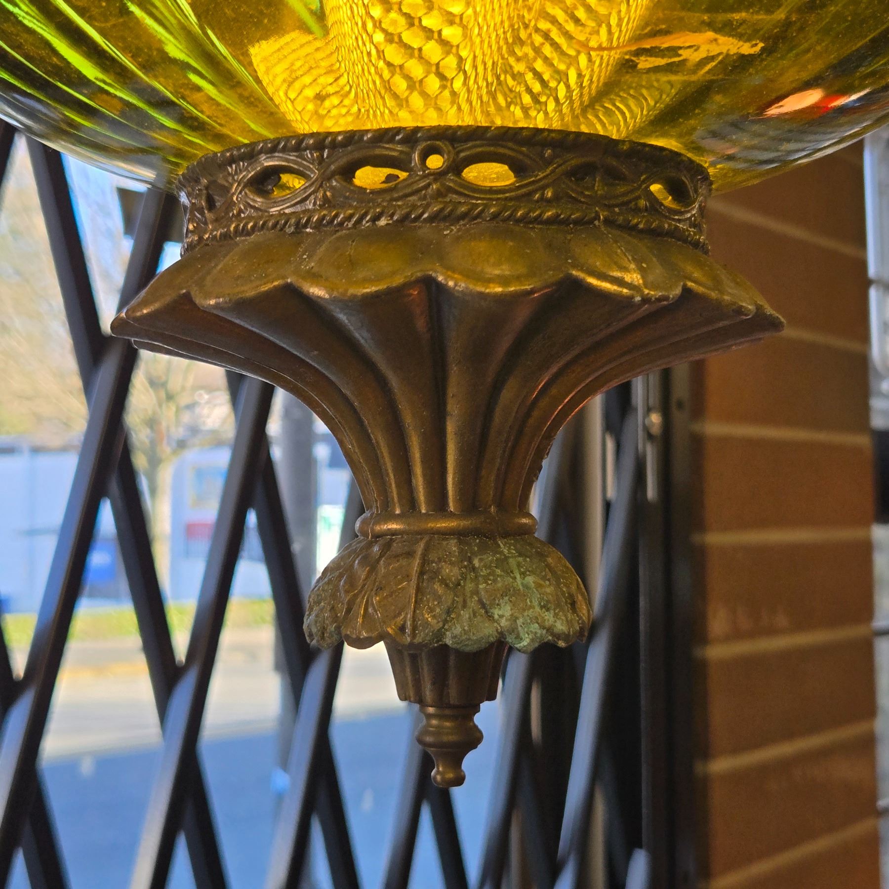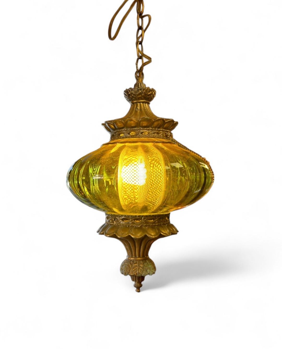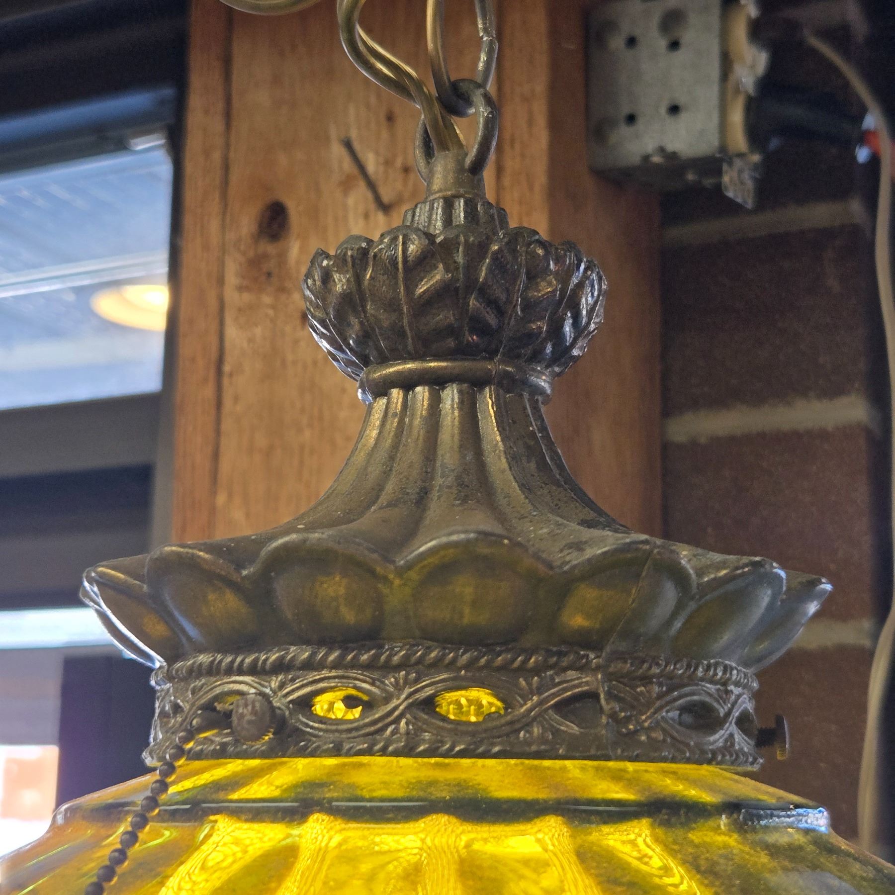 Mid Century Modern swag lamp featuring green glass shade. Designed for hanging with chain and cord mechanism typical of the era. Glass emits soft illumination when lit. Vintage design piece suited for ceiling mount installations. Item is as pictured.
