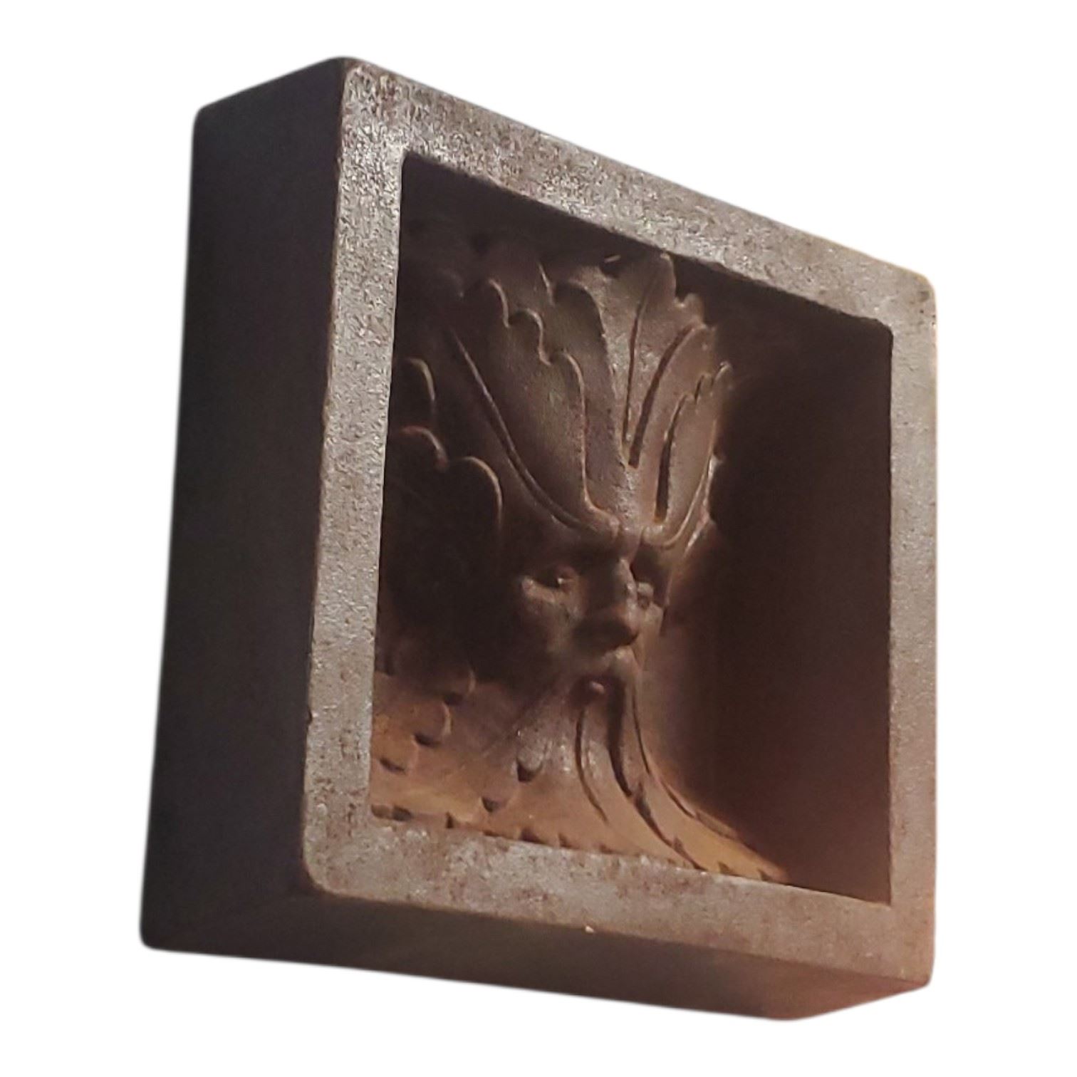 Green Man relief wall hanging plaque made from cast iron. Measures 8x8x2.5-Inch. Features a detailed depiction of the Green Man, often associated with natural and mythological symbolism. Cast iron construction ensures durability. Item is as pictured.