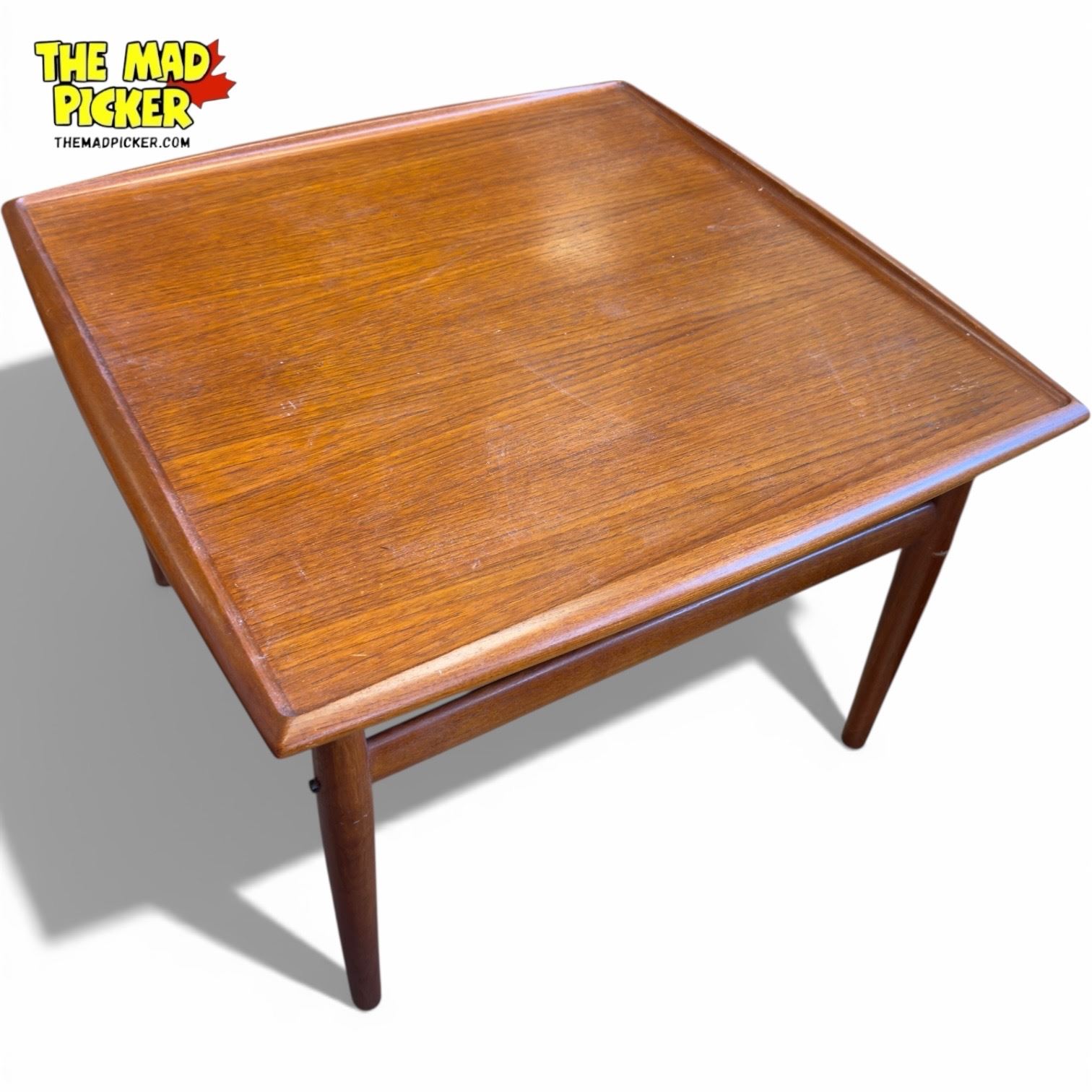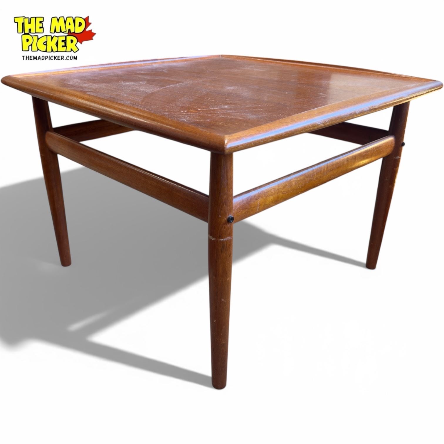 Mid-century modern teak coffee table designed by Grete Jalk for Glostrup M-belfabrik. Square top with clean lines and minimalist design, exemplifying Danish modern style. Made in Denmark. Dimensions: 26 1/2in x 26 1/2in x 19in tall. Iconic piece reflecting mid-20th-century craftsmanship.