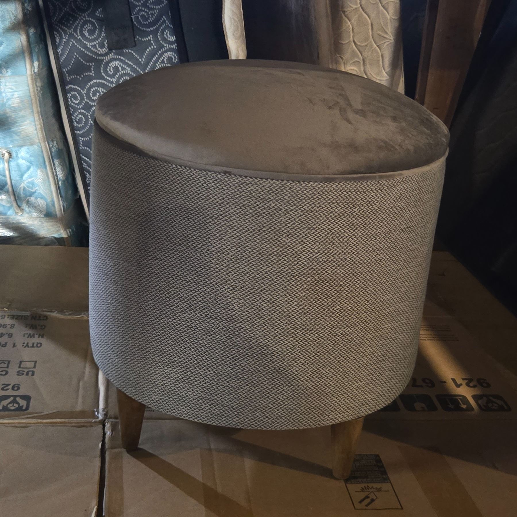 Grey Suede & Fabric Ottoman w/ Wood Legs - 17x19"