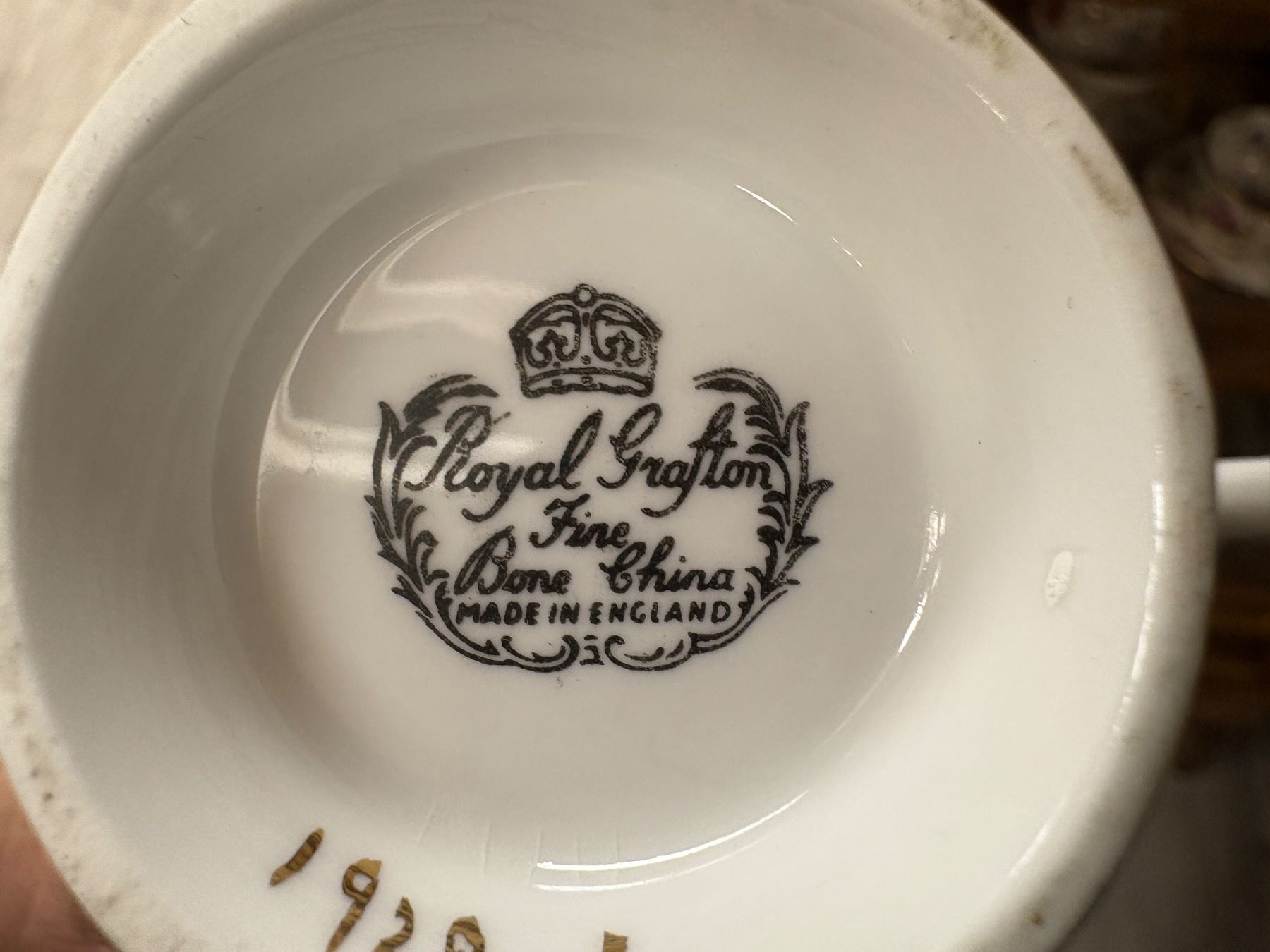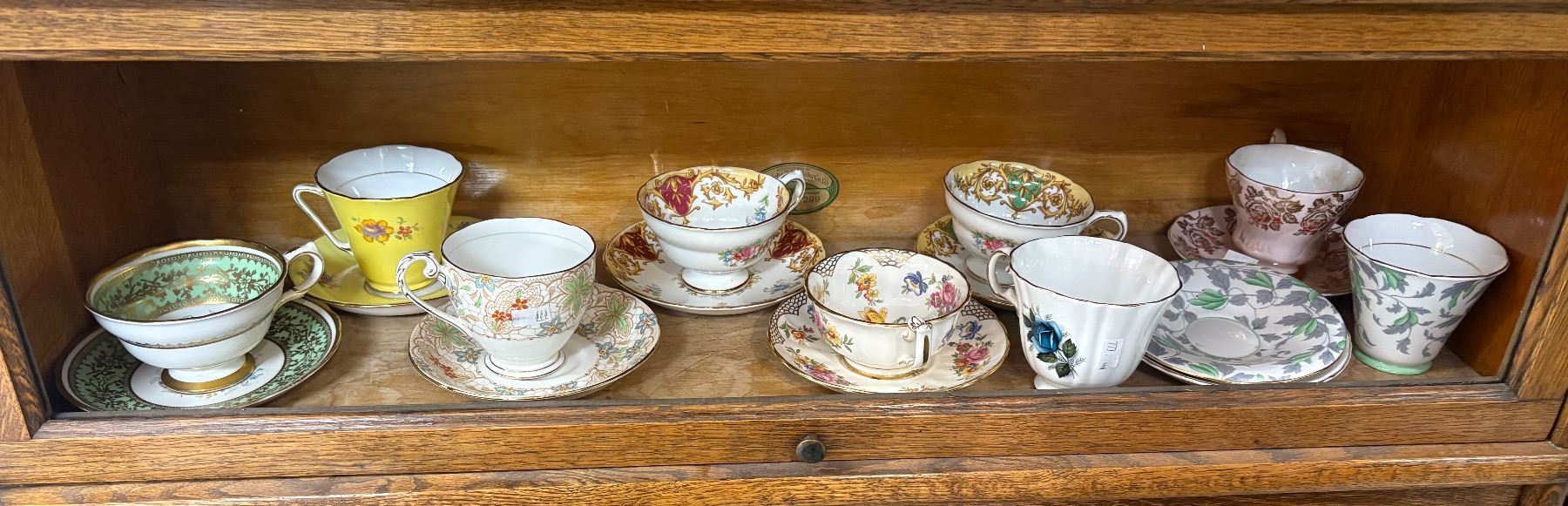 Set of 9 matching tea cups and saucers featuring Grosvenor and Crafton designs. Crafted in fine bone china with floral patterns and detailed rims. Each cup and saucer displays elegant craftsmanship associated with these English makers. Ideal for tea service or display.