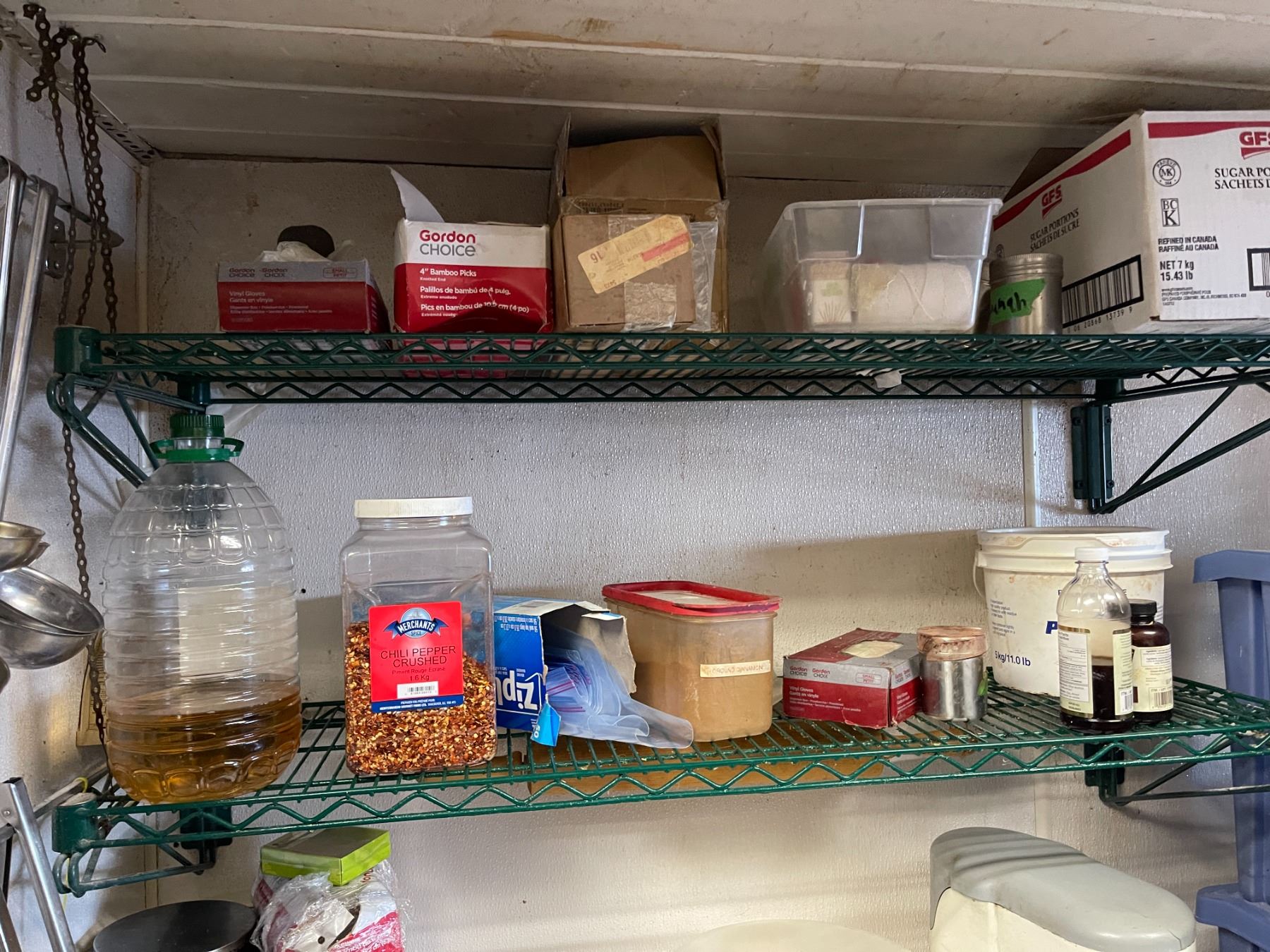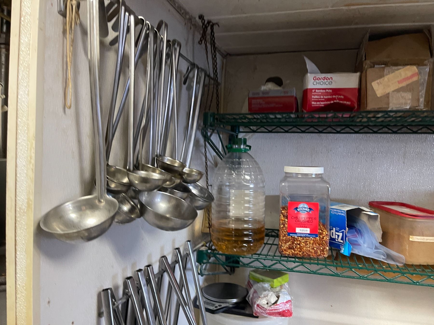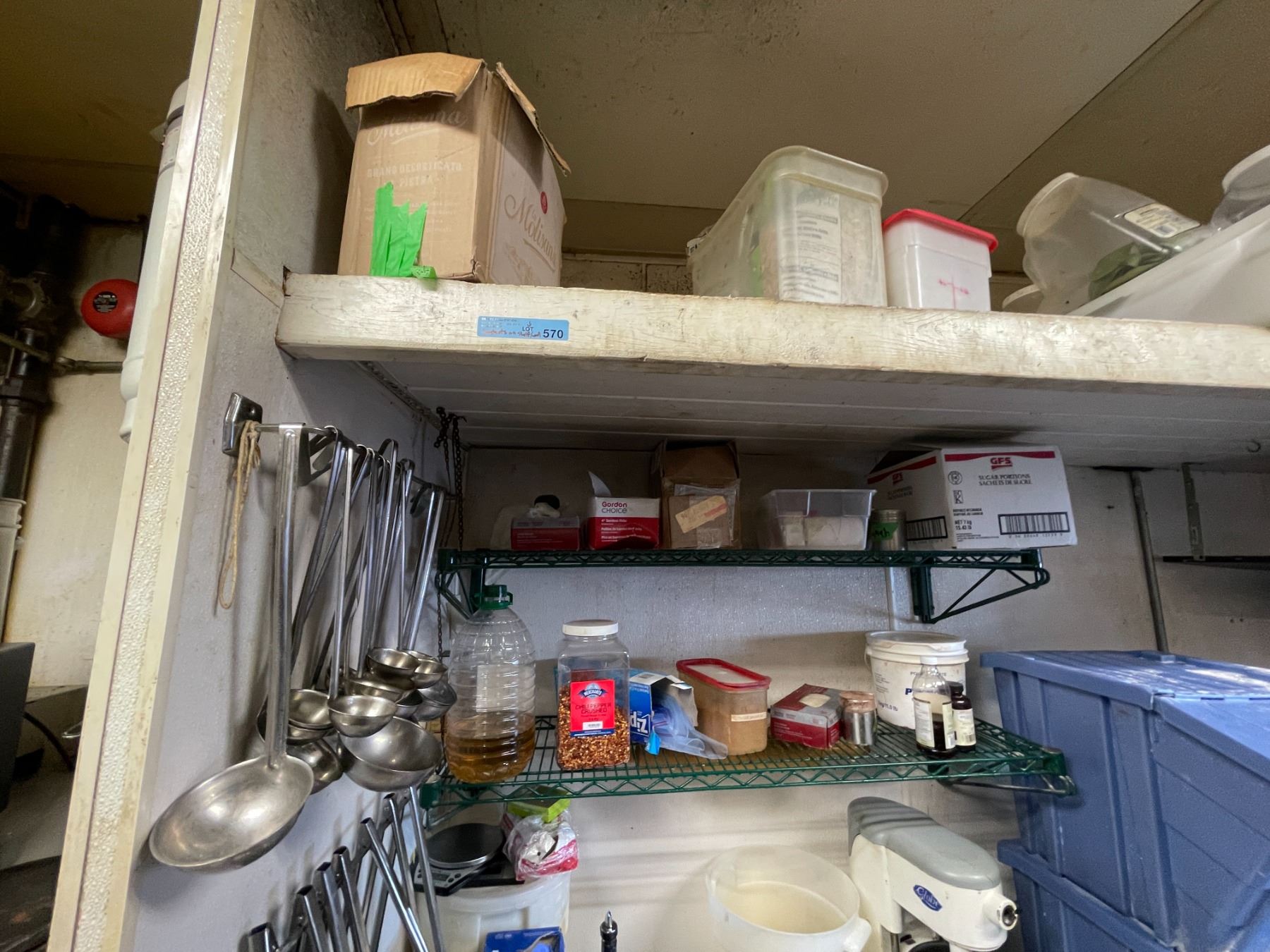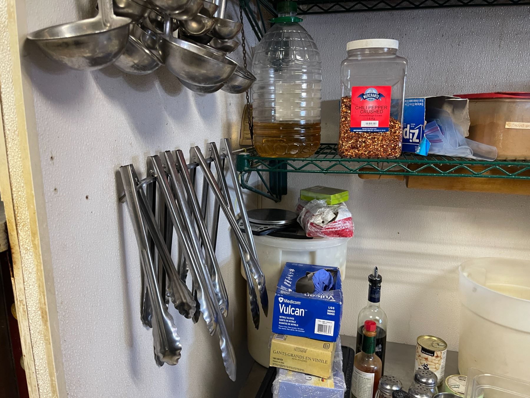 Group - Contents on wire shelf & wall including tongs, ladles, ingredients