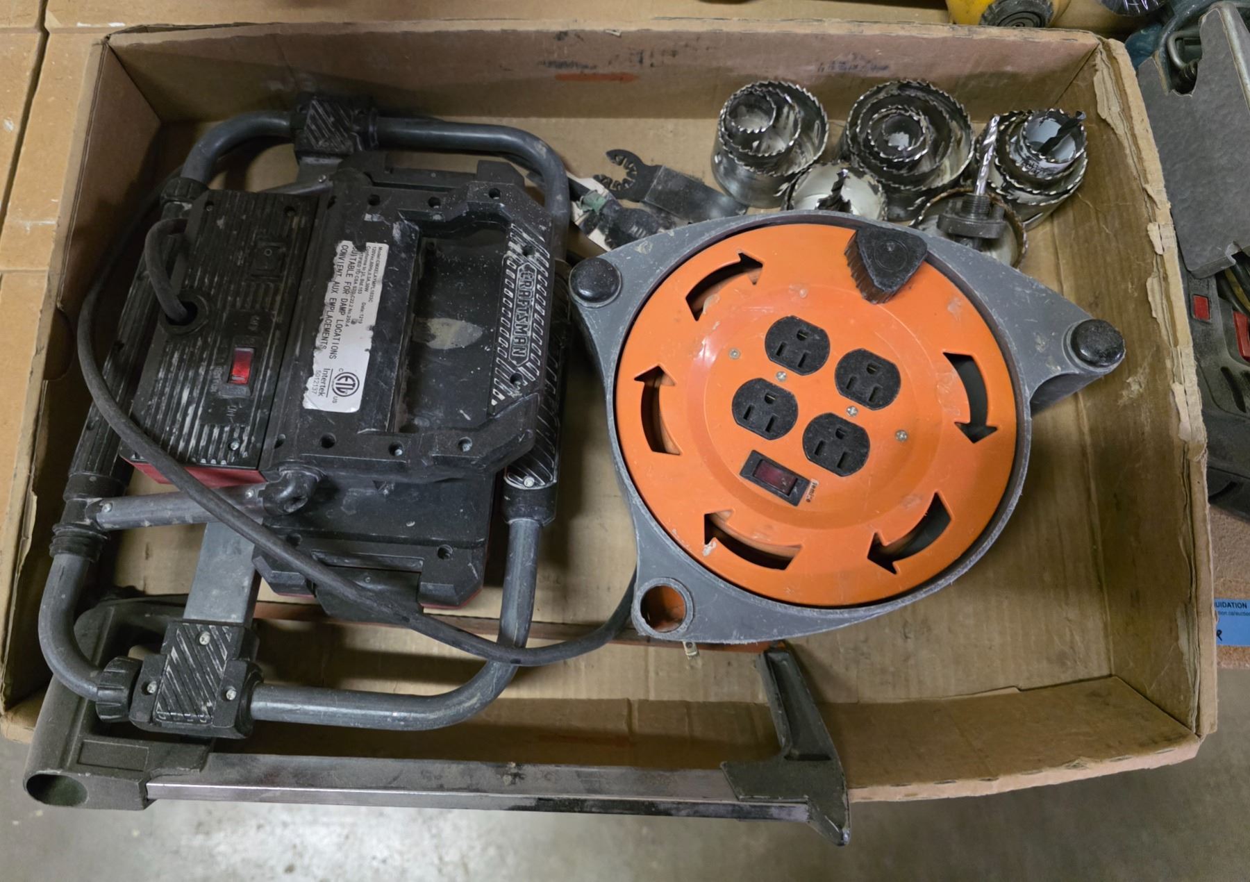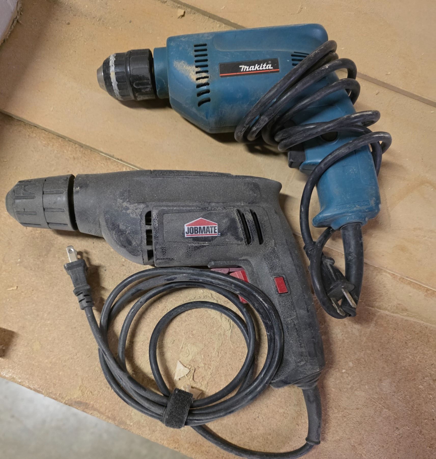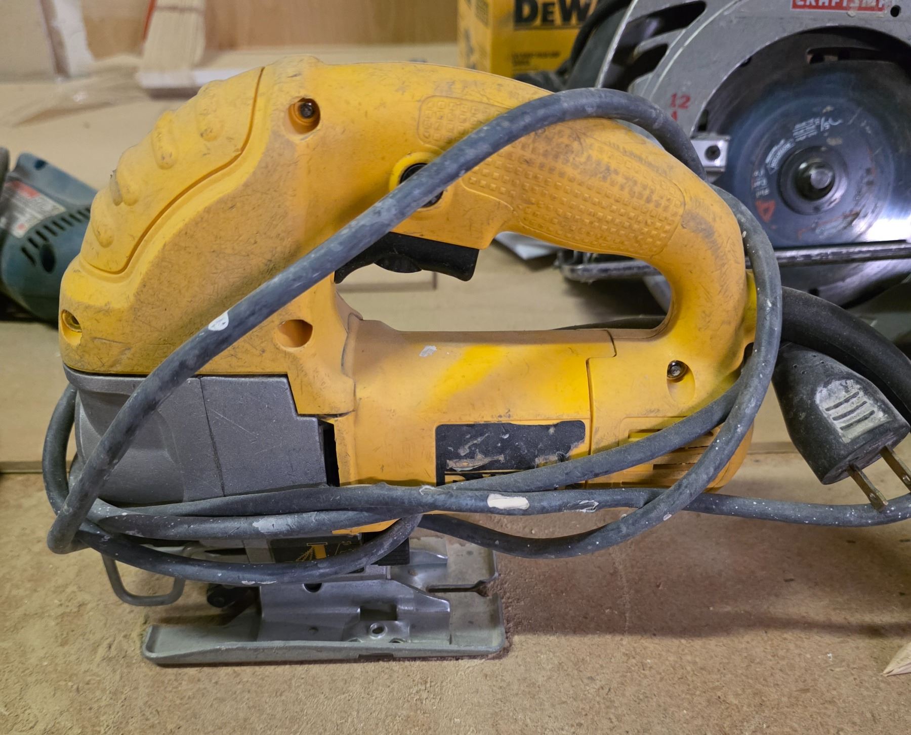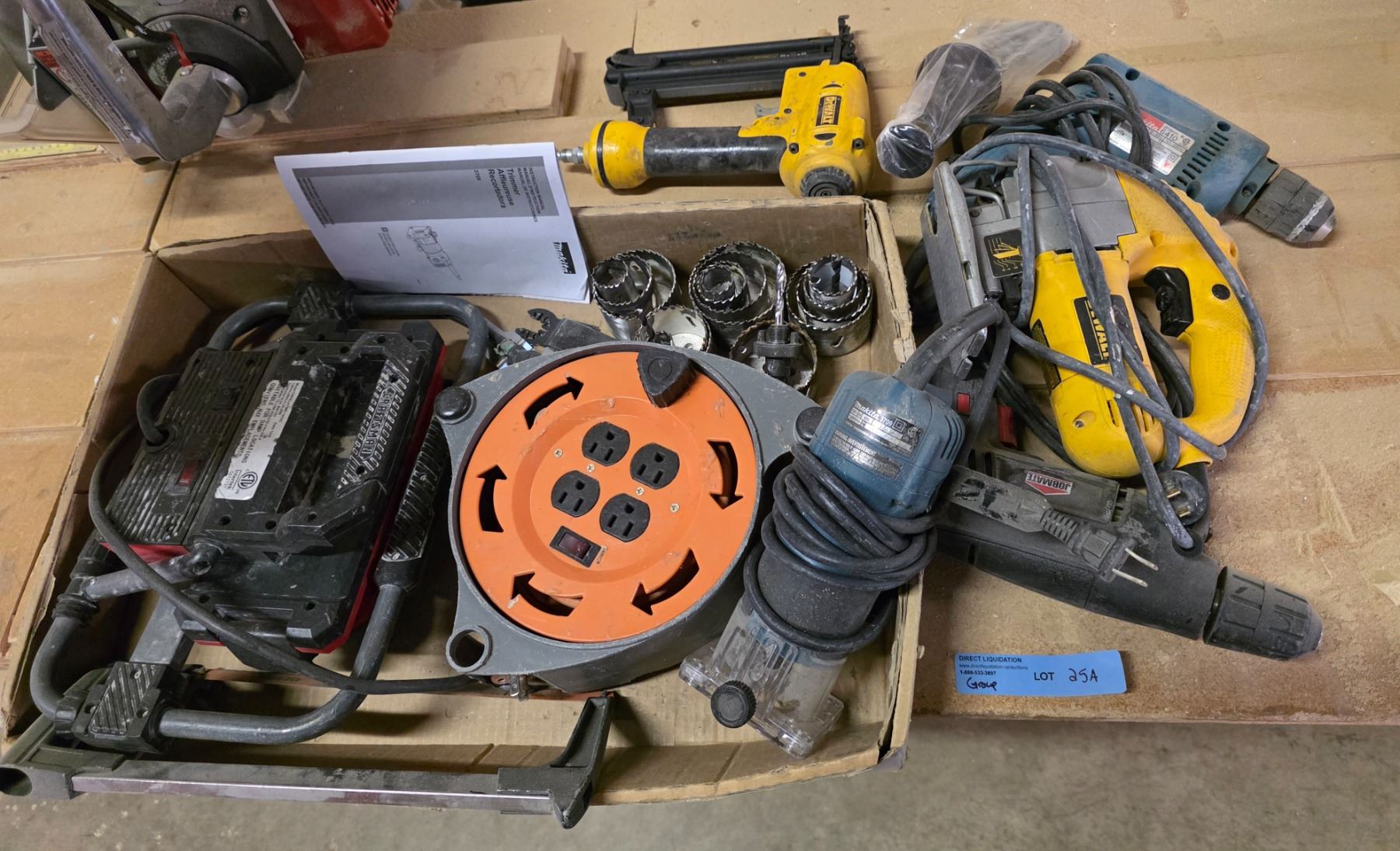 Group - DeWalt nail gun & jigsaw, Makita drill, work light, extension cord, etc.