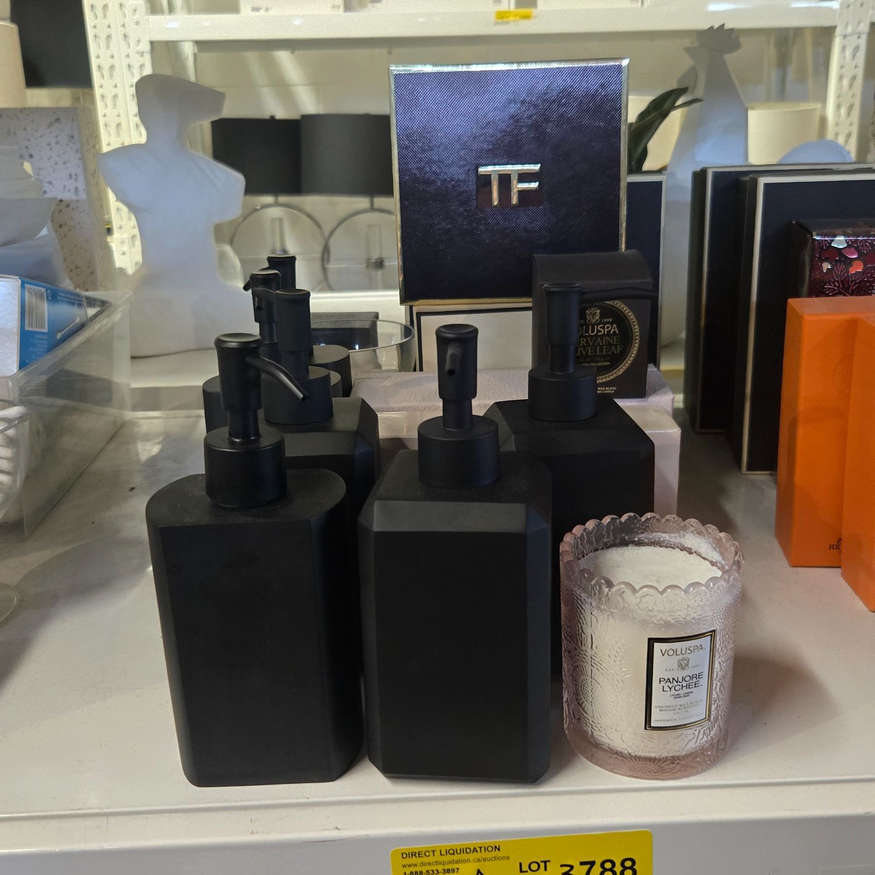 Group - Hand Soap/Lotion Black Pump Bottles, Candle & Empty Designer boxes