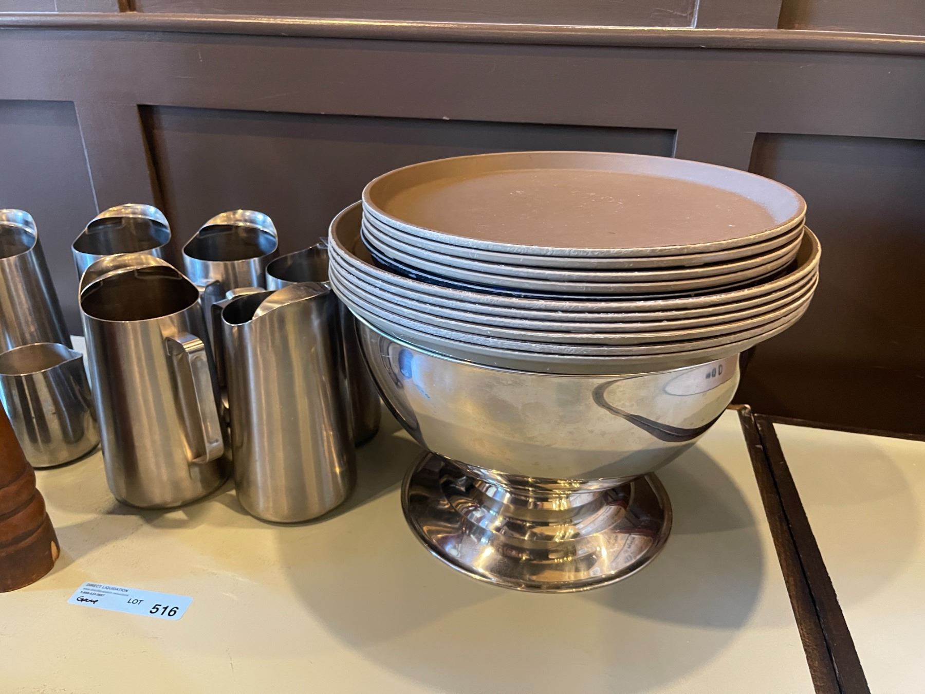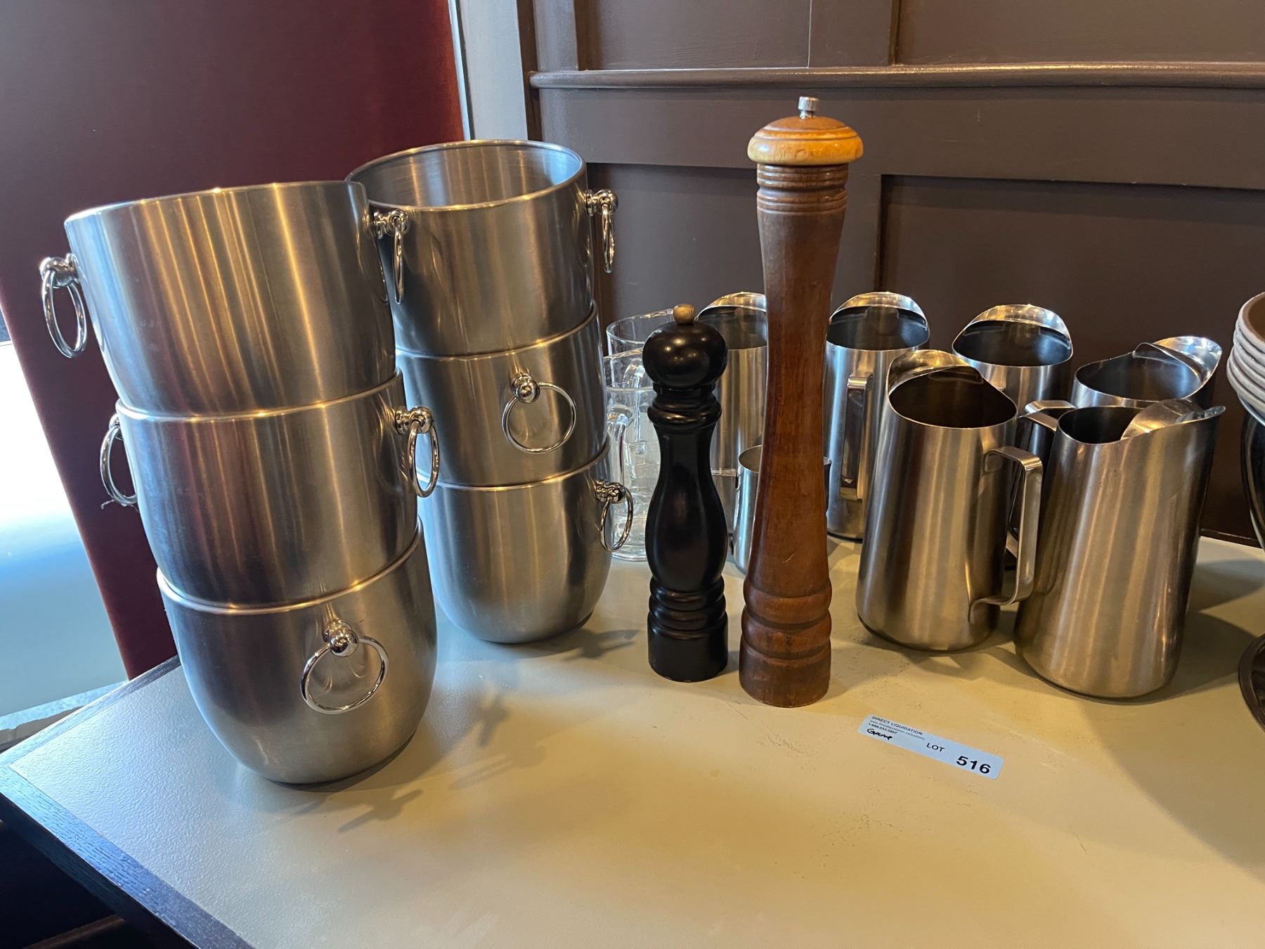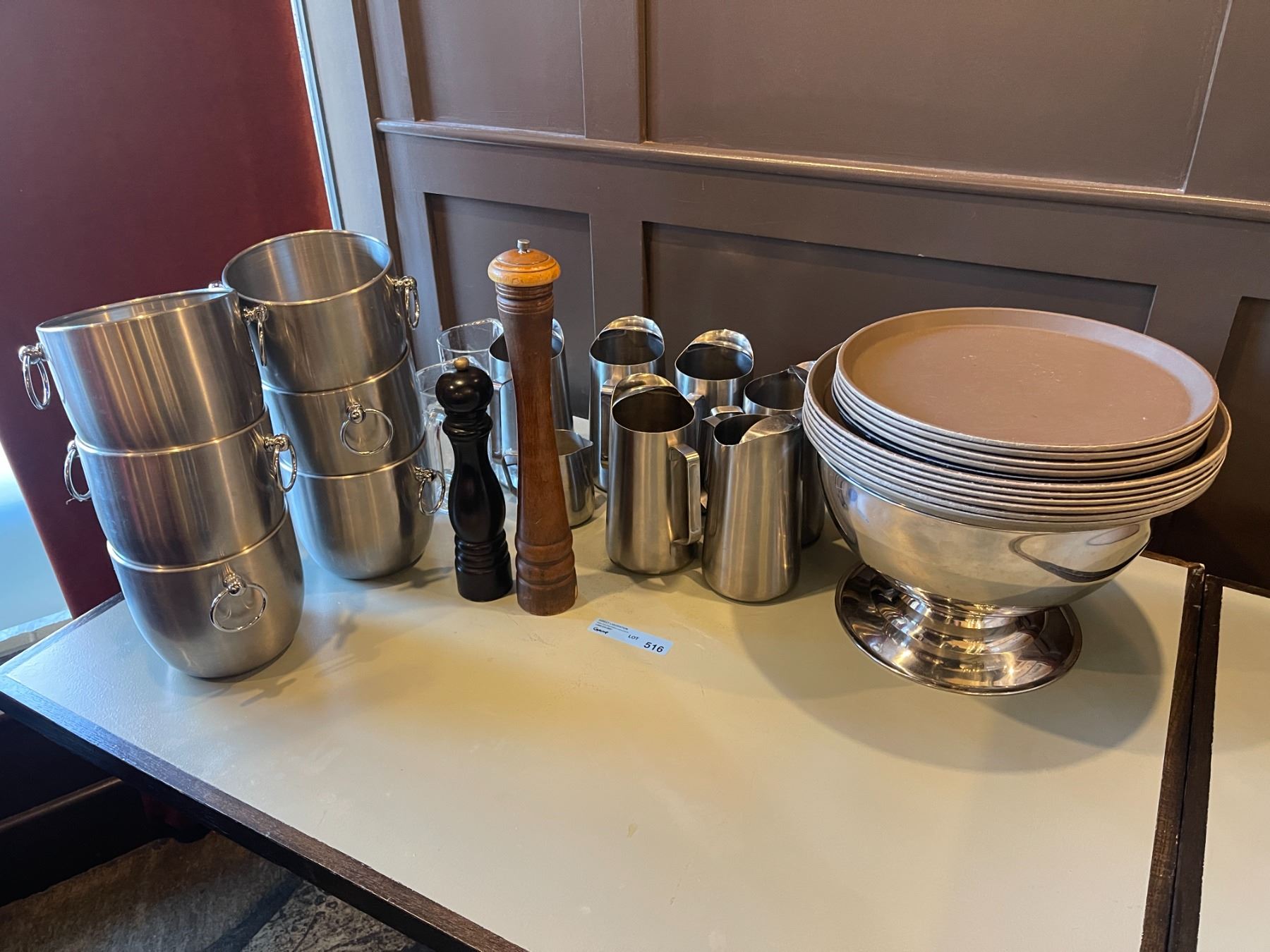 Group - Ice buckets, trays, S&P mils, water pitchers & large stainless bowl