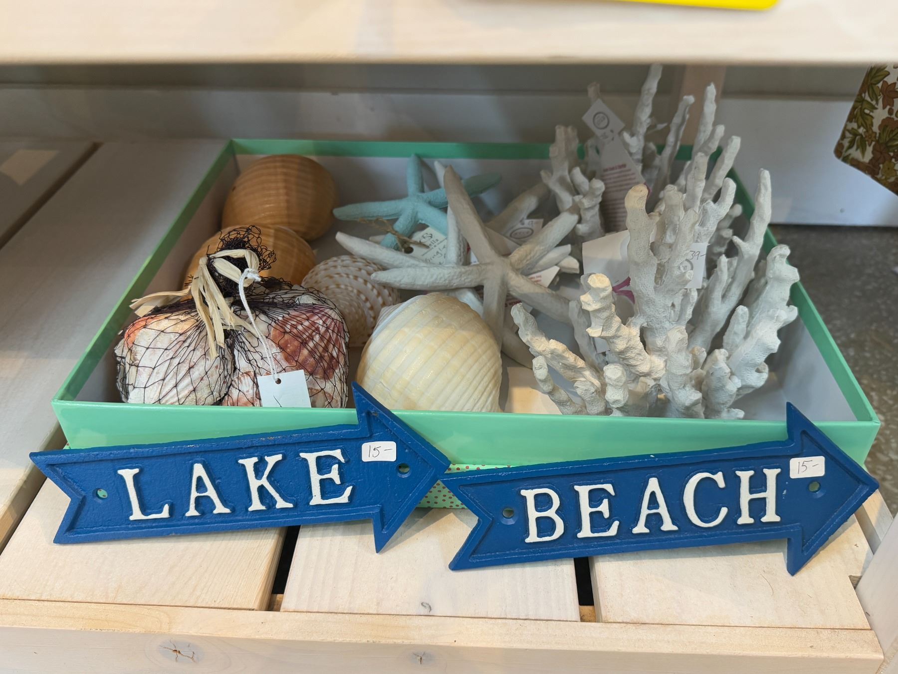 Group - Misc. seaside / lakeside beach décor including seashells, beach/lake cast iron plaques, coral, etc.