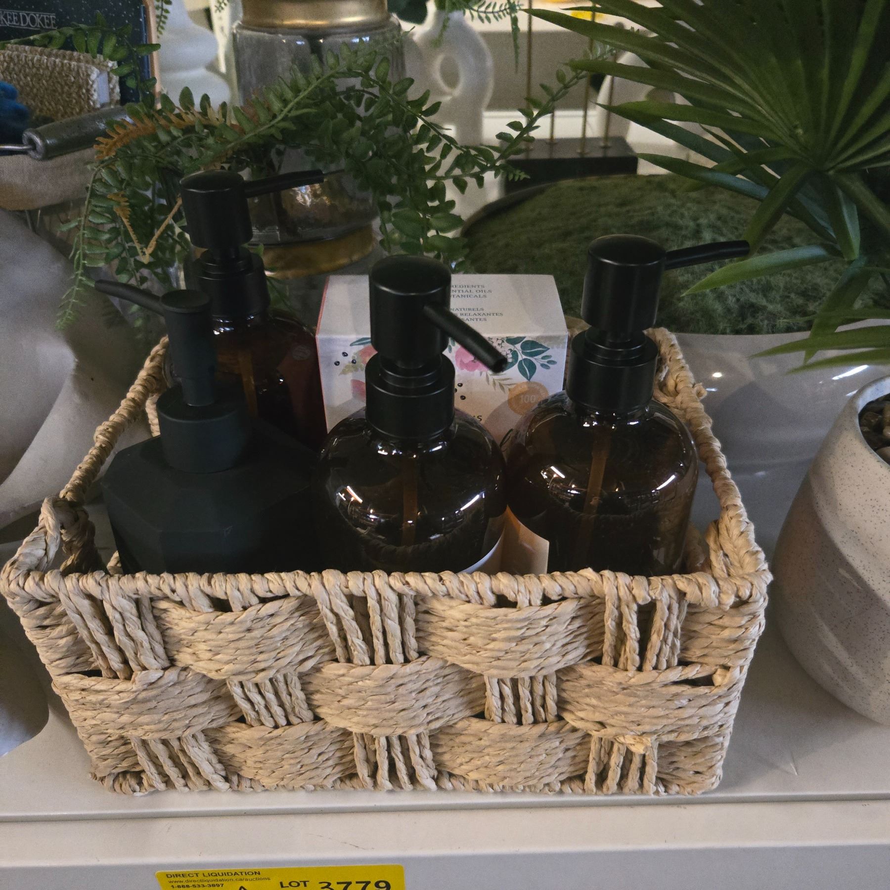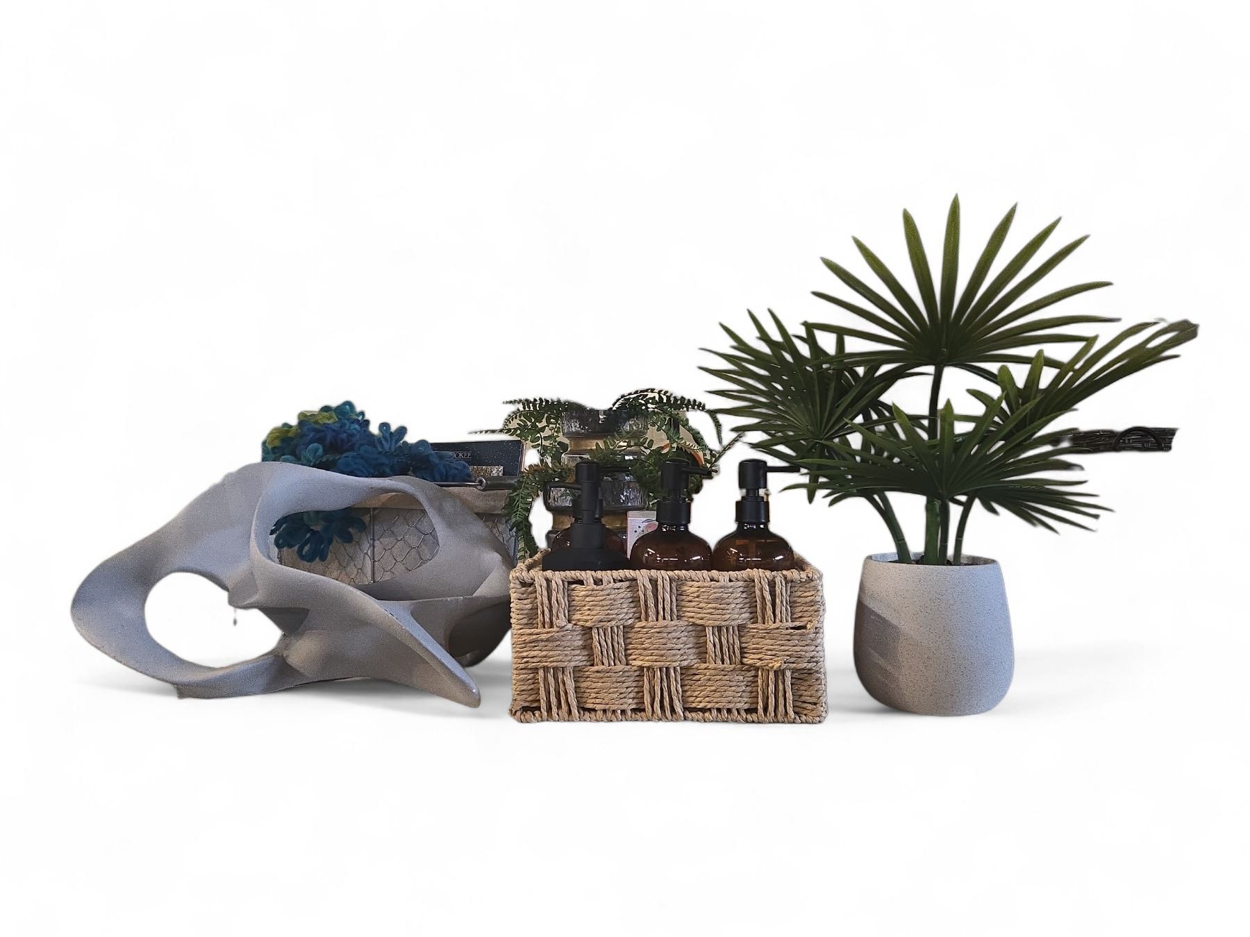 Group - Modern Décor Piece, Vases, Faux Plants, Wicker Basket w/ Pump Bottles, etc.