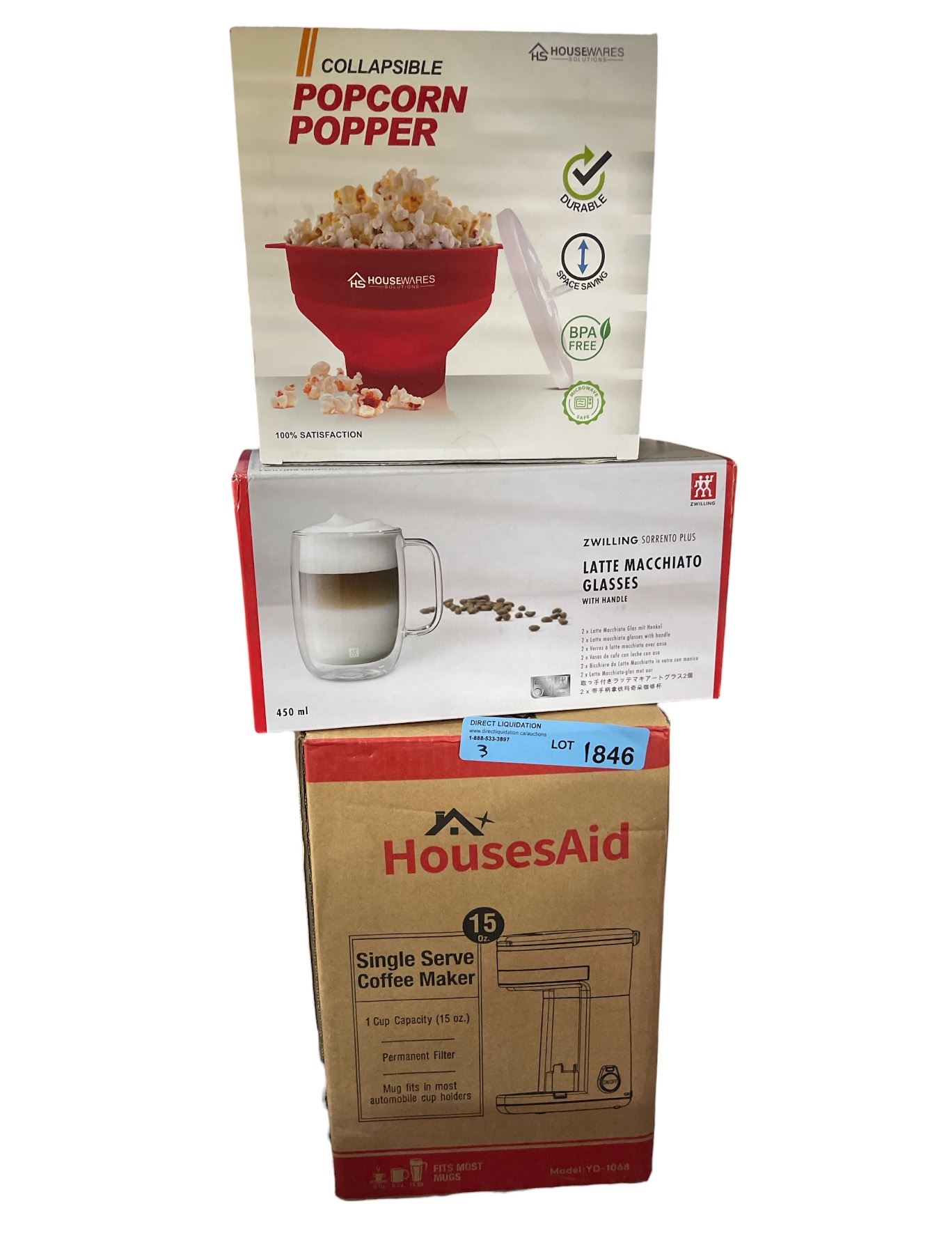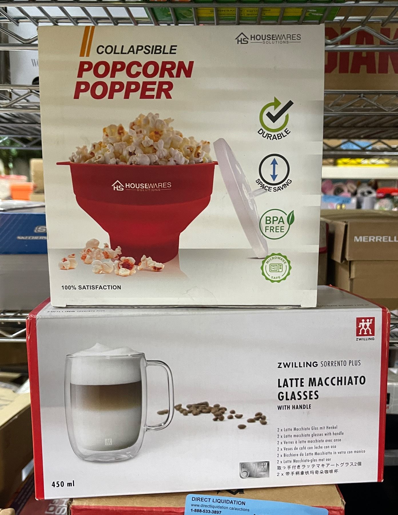 Group - Popcorn popper, Zwilling latte machiato glasses & House Aid coffee maker
