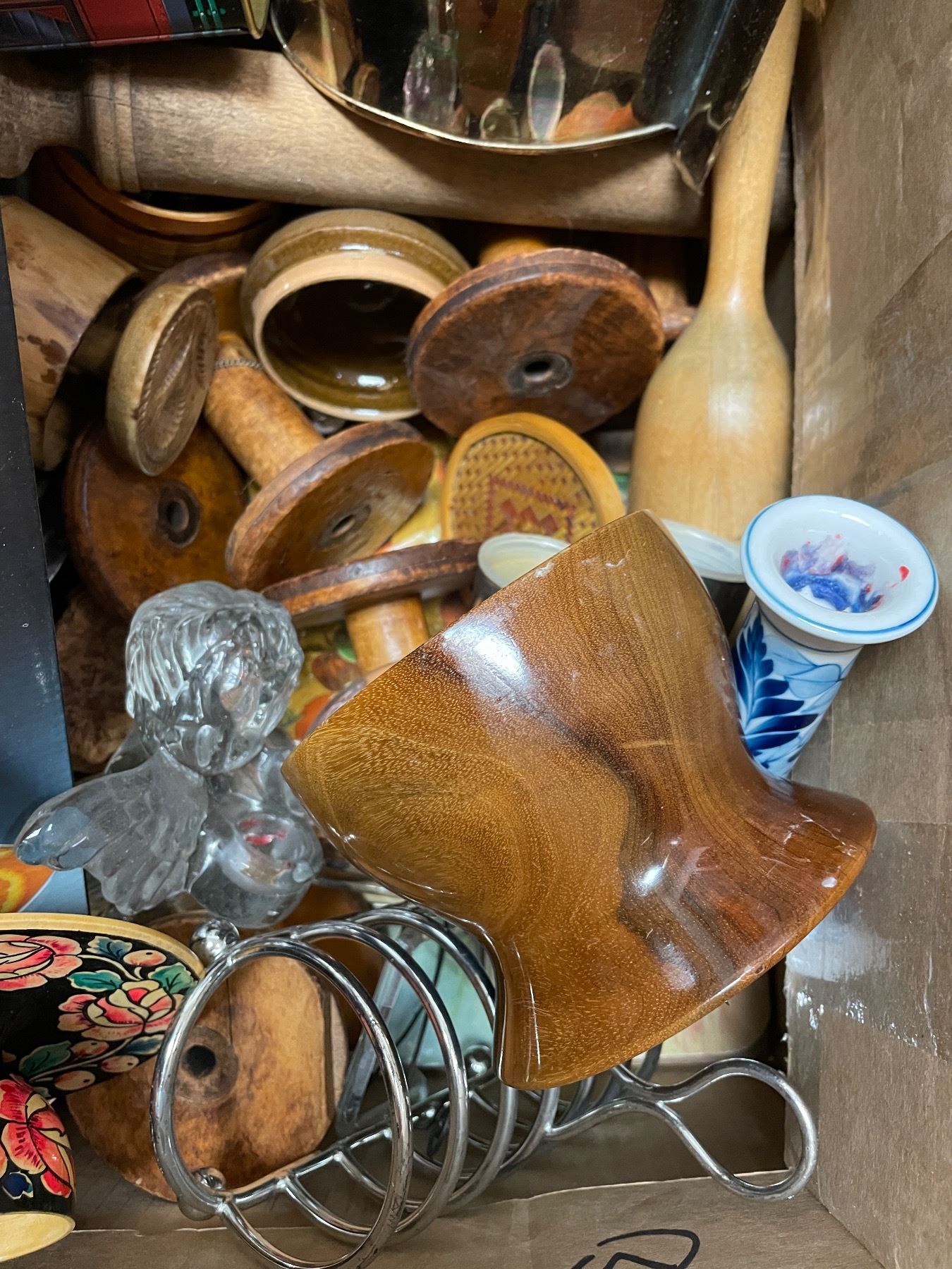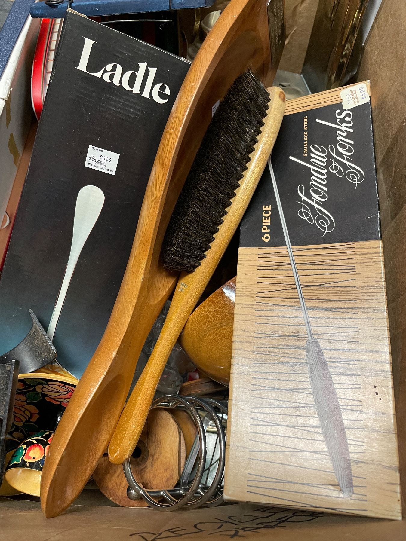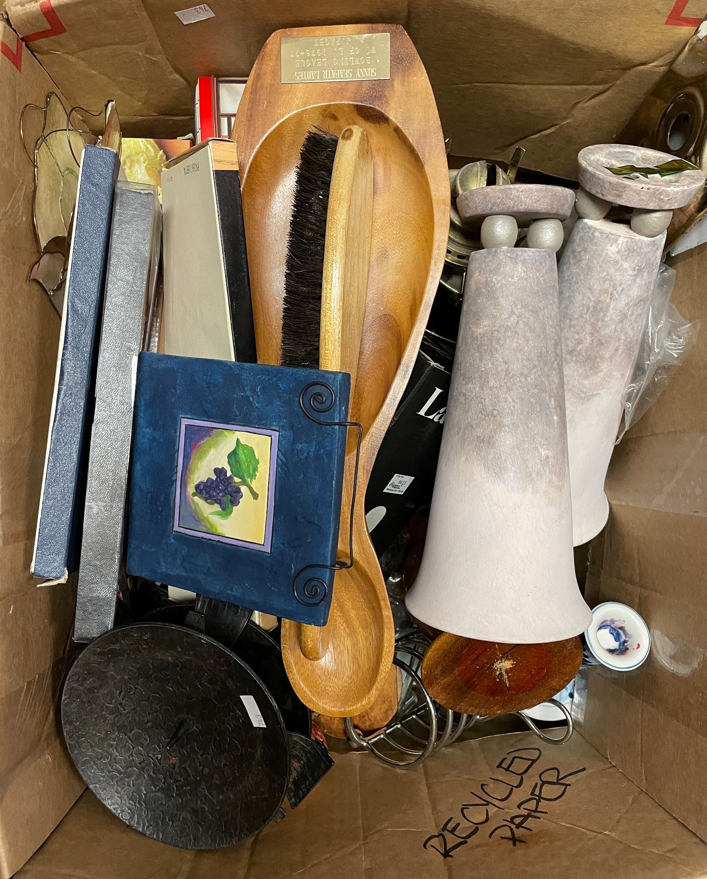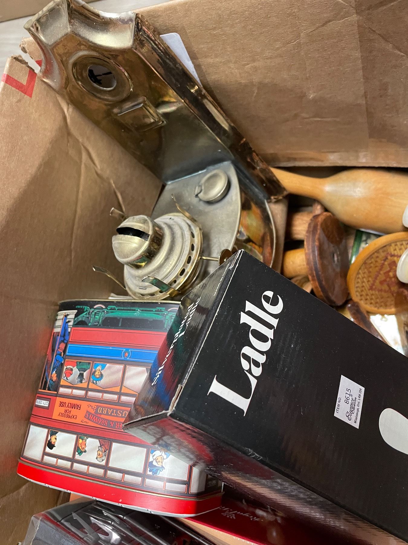Group containing brass lantern, candle holders, vintage kitchen wares, etc.