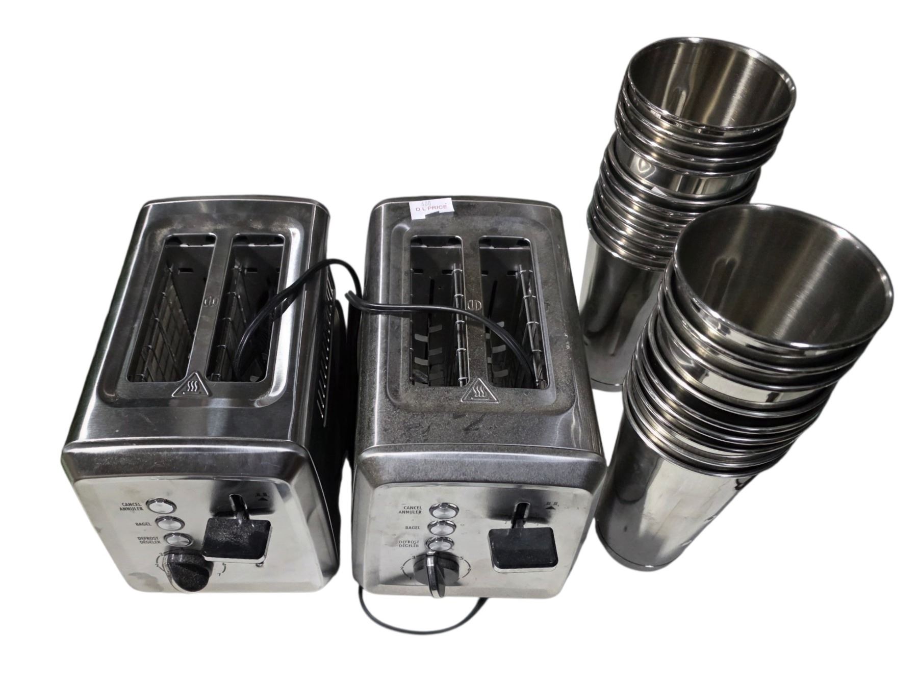 Group of 2 Hamilton Beach Toasters & approx. 20 Stainless Steel Milkshake Mixing Cups